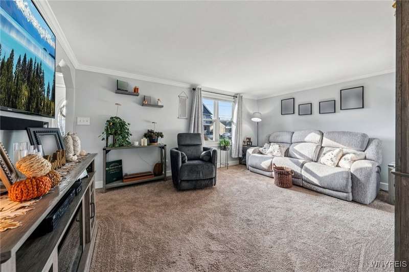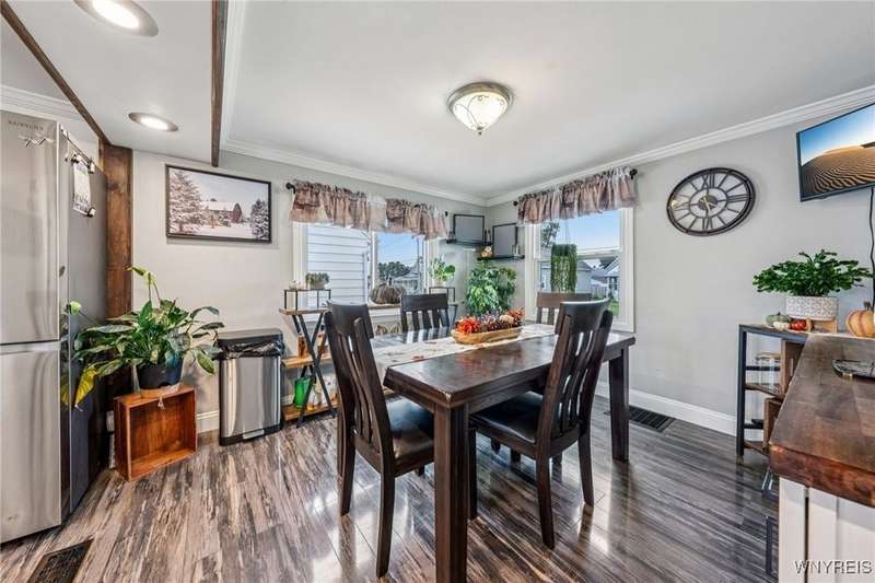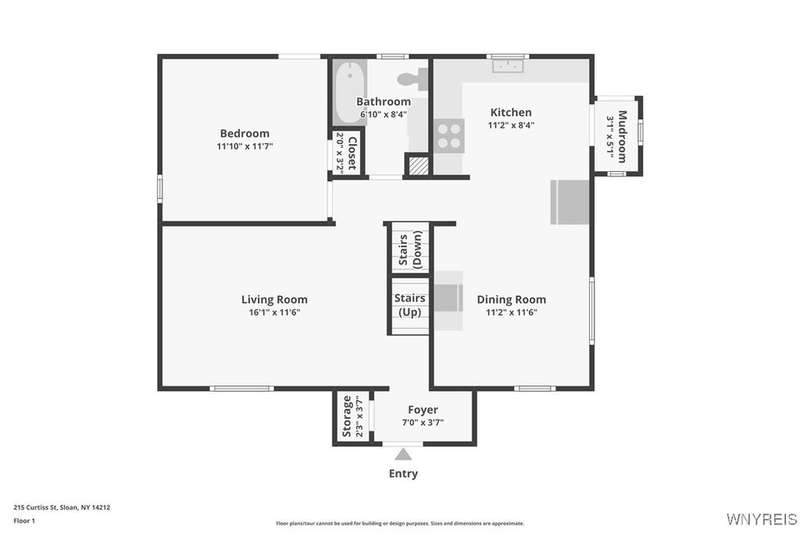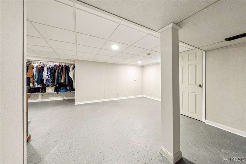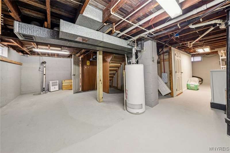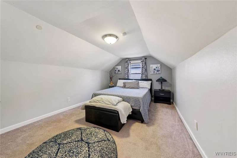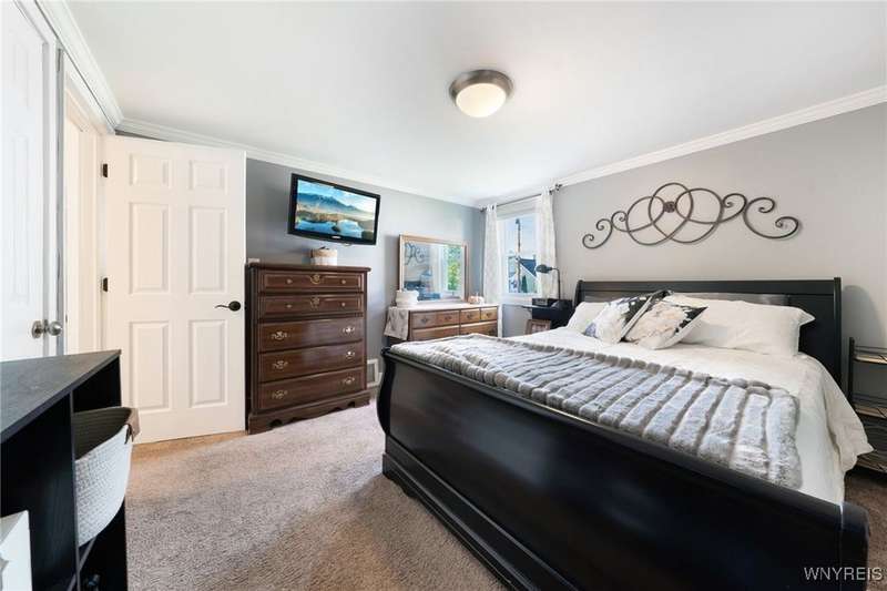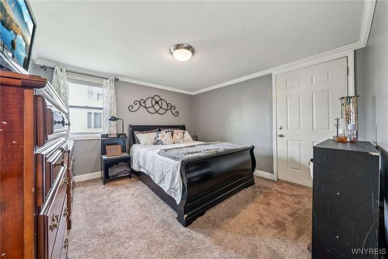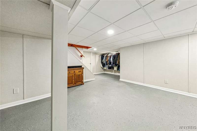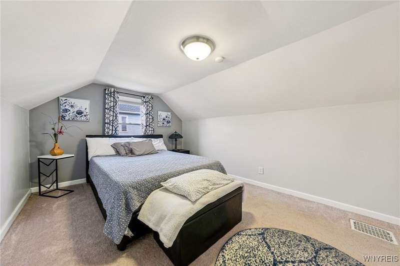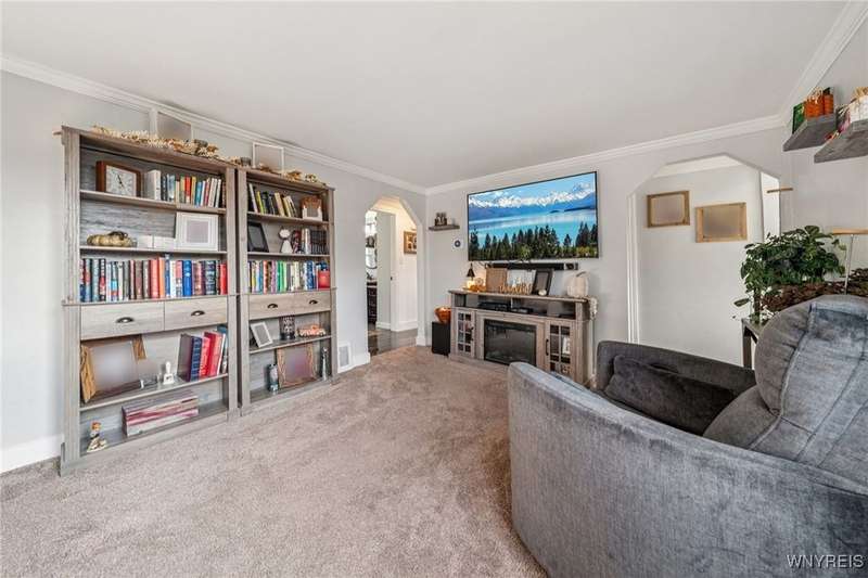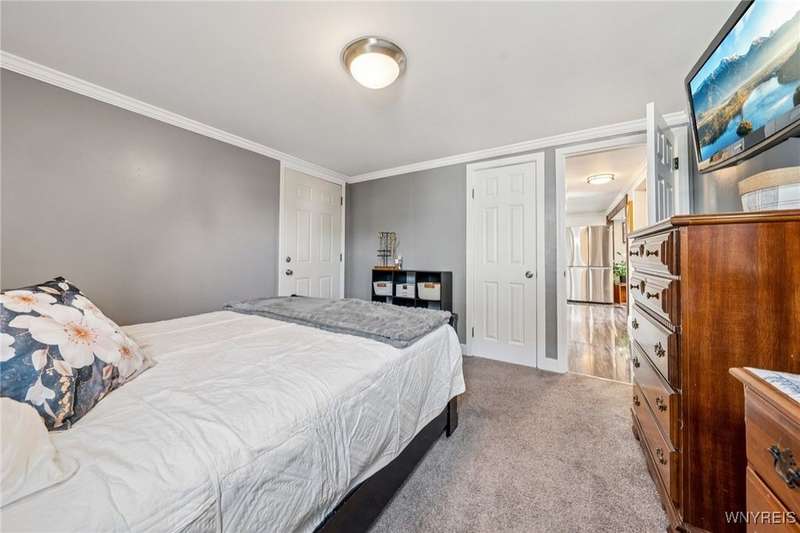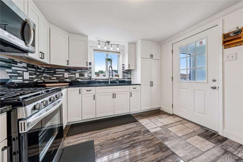 Move-in ready 3 bedroom, 1 bath home with many updates! Step inside to a bright and inviting foyer that opens to the living room with large front windows, neutral walls, and cozy carpet. The kitchen, remodeled in 2023, offers white shaker cabinets with soft-close drawers, granite countertops, sleek black hardware, and a striking glass tile backsplash. A side door leads to the mudroom for added convenience. The dining area, surrounded by windows, is filled with natural light and features a built-in coffee bar, flowing seamlessly from the kitchen. The first floor also includes a versatile bedroom and a full bath, while upstairs you'll find two large bedrooms. The partially finished basement features durable epoxy flooring, glass block windows, and plenty of storage in a clean, dry space. Beautiful details throughout include crown molding, trim, and wood finishes. Outside, enjoy curb appeal enhanced by beautiful landscaping, a freshly stained deck, shed, and a fully fenced yard with gate. All you have to do is unpack. This lovely home is truly move in ready.