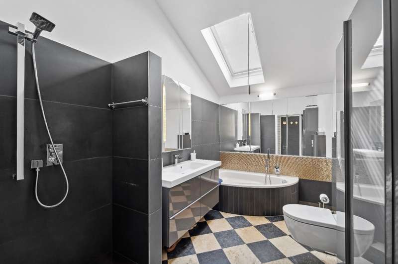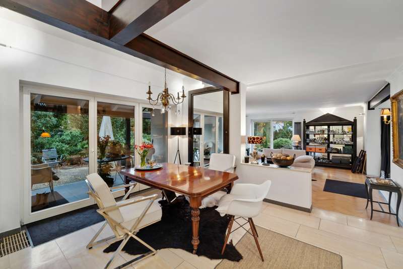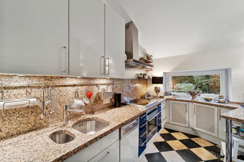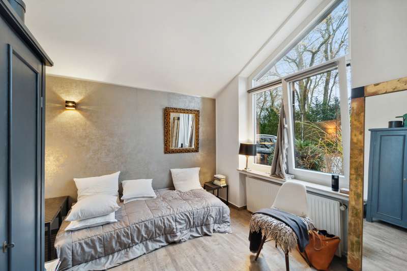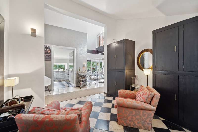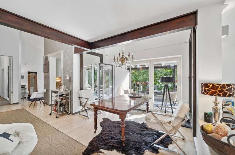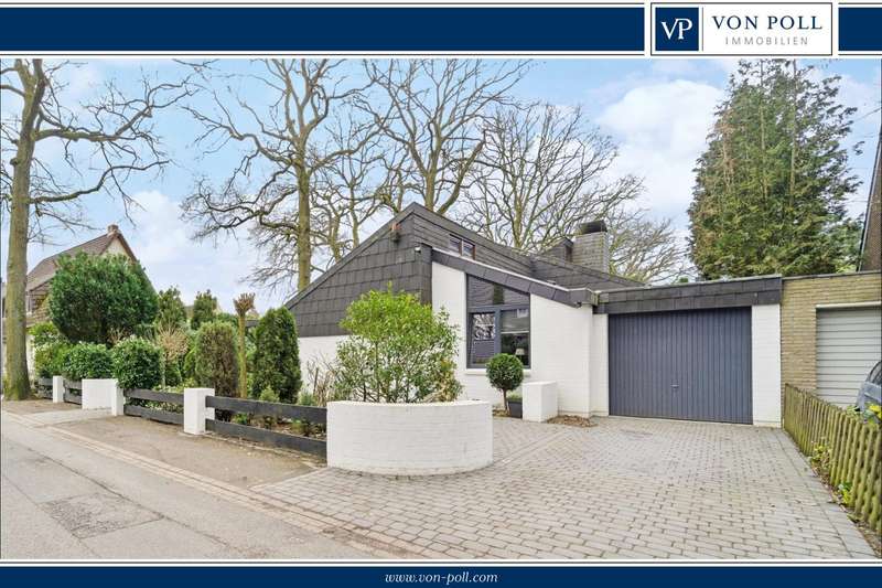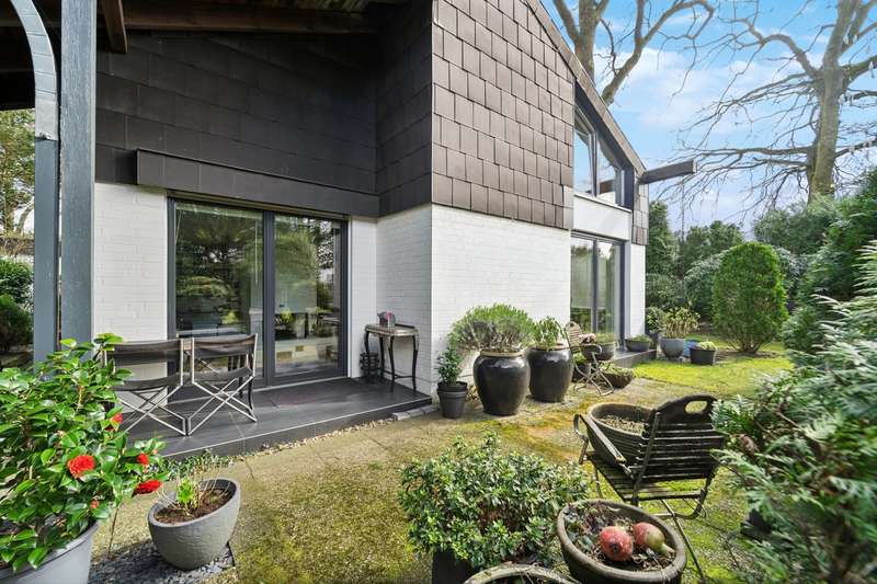 Welcome to a brief introduction to this impressive property in Borgfeld, which offers you a unique and spacious living experience. This exceptional architect-designed house is situated on a spacious plot on a quiet residential street and yet is only 300 meters from the bus stop. The layout impresses with its open concept with very different room heights, which gives the rooms a special character. The gallery offers additional height and interesting views in and out. The bathroom and bedrooms are located on their own corridor and are naturally closed off and thus somewhat separated from the rest of the house. All other rooms flow seamlessly into one another. With the exception of the gallery, the house offers the possibility of living on one level. The house is very bright, as there are many large, floor-to-ceiling windows and additional daylight also comes in from above through the windows in the gallery. The elegant living area with high-quality herringbone parquet flooring offers an open fireplace for cozy hours. The large windows automatically draw the eye to the terraces and the almost secluded garden. The house offers a lovely place to relax and enjoy at any time of year. The kitchen is equipped with modern appliances and a high-quality kitchen and offers plenty of space for cooking and entertaining. The outdoor area is another highlight of this property. There are covered and open terraces on two sides of the house. So you can always find a sunny or shady place to linger, depending on your needs. The house also has a garage and 2-3 outdoor parking spaces, providing plenty of room for your vehicles. A storage room in the garden, the boiler room and the storage room in the house offer you additional storage space. Overall, this property offers around 166 m² of living space and an 877 m² plot, providing a luxurious lifestyle close to nature. If you are looking for a sophisticated home in Alt-Borgfeld, then you should view this house.