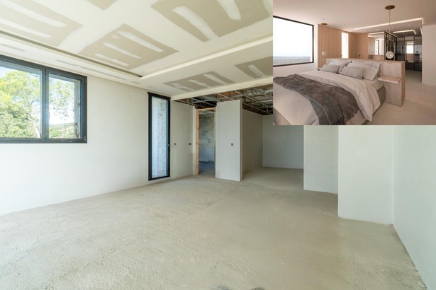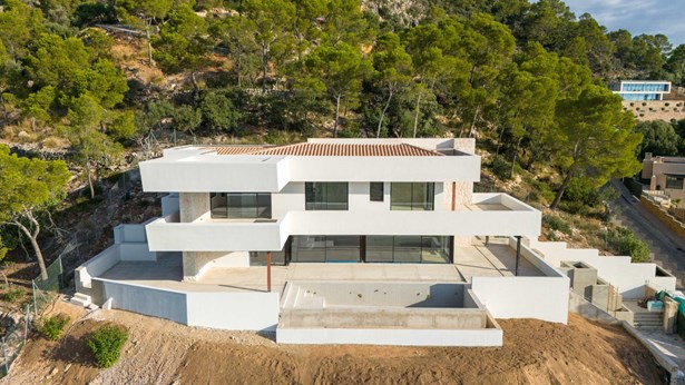 Located in the exclusive area of Son Font Seca (Bunyola), this contemporary designer villa stands out for its elevated position, ensuring absolute privacy and breathtaking 180º views of the sea and the Serra de Tramuntana. The property combines a natural setting with quick access to Palma and Valldemossa, as well as proximity to services, restaurants, and the Son Termes golf course.~~Built on a 1,311 m² plot, the villa offers 560 m² designed to enhance spaciousness and natural light. High-quality finishes include light oak interior carpentry, continuous terraces with gravity drainage, and cantilevered terraces that maximize the views. A subterranean ventilation system (“bufos”) controls humidity levels, ensuring comfort and long-lasting construction.~~The interior features four bedrooms, including a master suite with a walk-in closet and a full bathroom with a freestanding bathtub, along with three additional contemporary-style bathrooms. The living areas are spacious and directly connected to the outdoor zones.~~Outside, the villa boasts a striking infinity pool, a low-maintenance Mediterranean garden, and a year-round chill-out area. A garage with capacity for 15 vehicles completes this exceptional and rare luxury property.~~The property features a spacious multipurpose room, ideal for creating a private gym, a family entertainment area, or a comfortable home cinema.