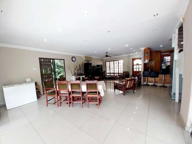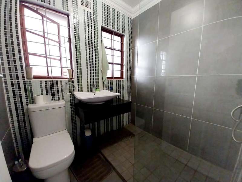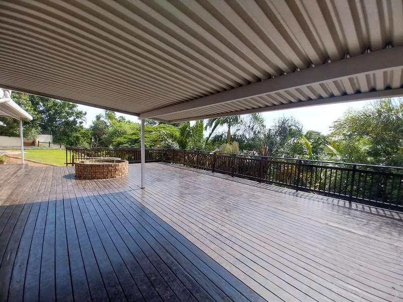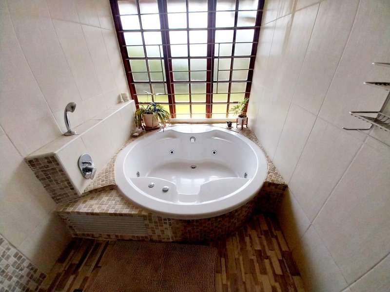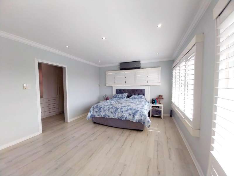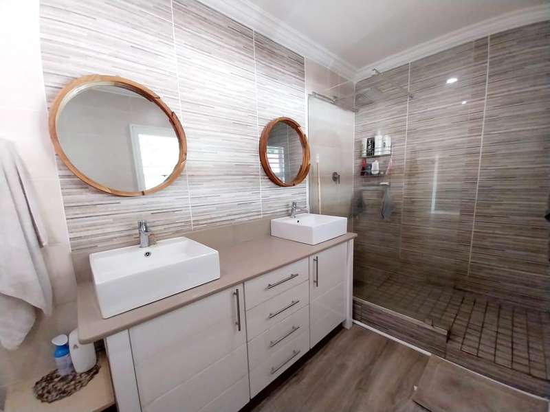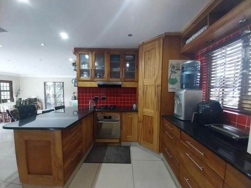 This is the property you have been seeking: a remarkable family home with exceptional entertaining features. Upon entering the home, you will be greeted by a modern open-plan kitchen, featuring attractive wooden cabinetry with black granite countertops, a gas stovetop, and an electric oven. Adjacent to the kitchen is a charming breakfast nook. The kitchen seamlessly flows into an expansive dining room and lounge, making it an ideal space for hosting sophisticated cocktail parties. The impressive wooden patio doors lead directly to a spacious wood deck with complete with a boma, perfect for outdoor gatherings. Ascend the staircase to discover four well-appointed bedrooms and three uniquely styled bathrooms. Each bedroom offers ample space and built-in cupboards, while each modern bathroom showcases its own distinctive design elements. The expansive main bedroom is truly stunning, adorned with elegant white wooden shutters and sleek downlights that create a starry ambiance on the ceiling. To your left, a walk-in closet with drawers and wall-to-wall cupboards offers plentiful storage. Indulge in the luxurious spa bath while enjoying a picturesque view of the gardens. To your right a wooden balcony with a view of the stunning garden. The surrounding garden includes a pool, trampoline, and a wrap-around slide, providing an ideal play area for children. Additionally, the property features two 5000 L Jojo tanks with a filtration system for clean water, integrated directly into the main line of the house. Completing the property is a garden cottage, two garages, and a small office space. Contact me today to arrange a viewing, as this exceptional home is sure to attract interest and may not remain on the market for long.