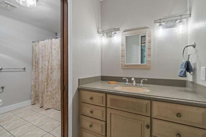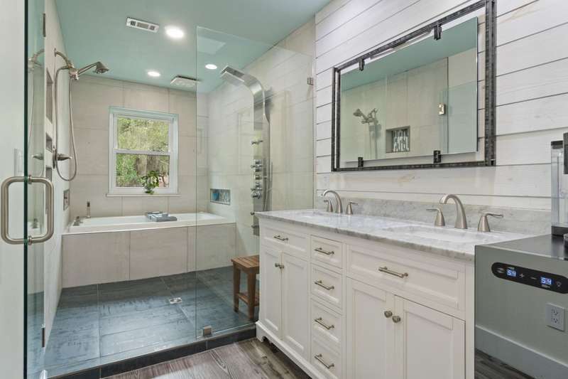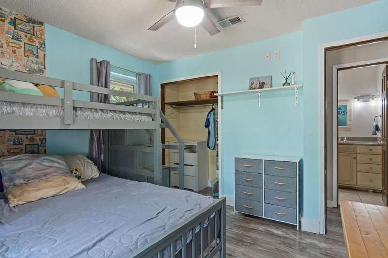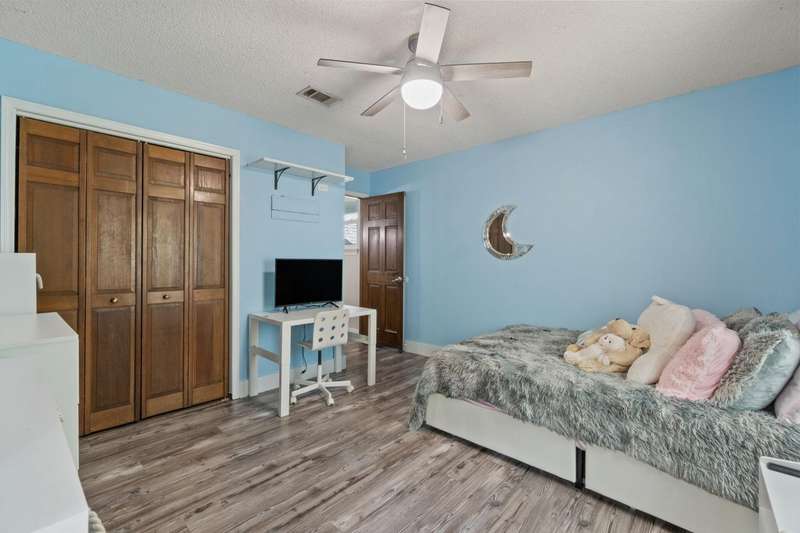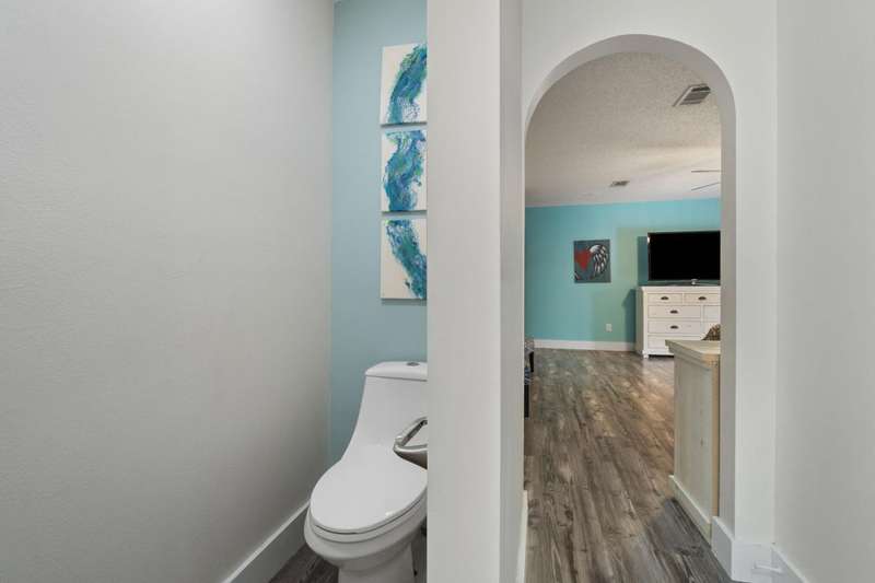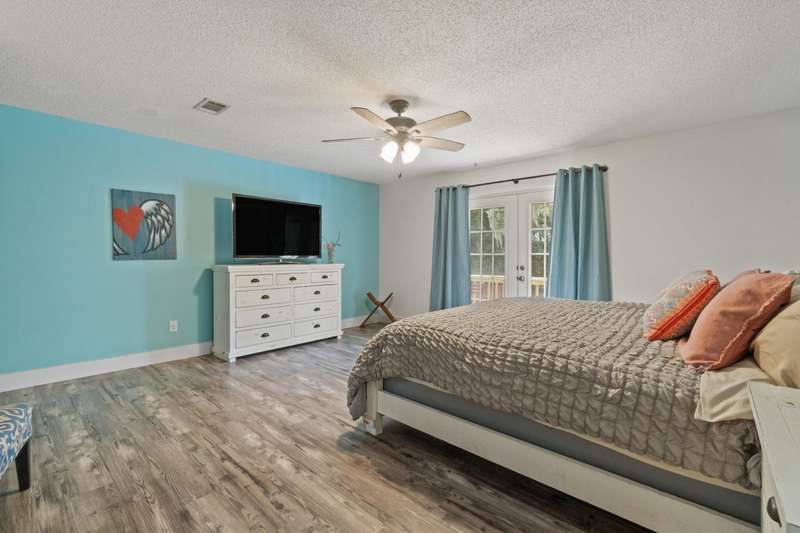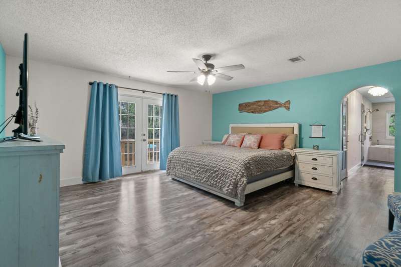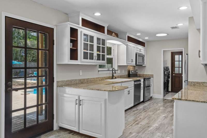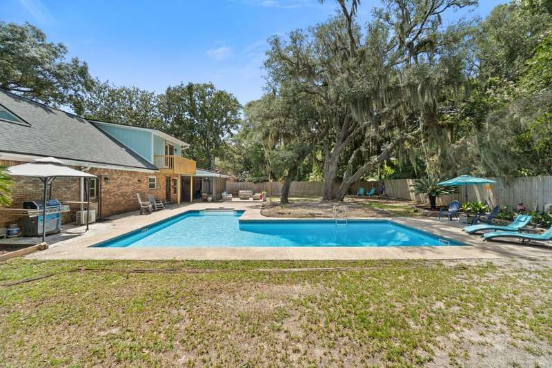 Discover charm and elegance in this 4-bedroom, 3-bathroom Gulf Breeze salt water pool home, designed for unforgettable gatherings with newly added $10,000 in seller concessions towards upgrades. Situated among majestic mature Live Oak trees, this home boasts a large L-shaped pool, a spacious outdoor patio, and a 20x10 screened porch for year-round enjoyment. Step inside to the light and bright living space with vaulted ceilings, skylights, a cozy fireplace, ship lap accents, and a stylish wet bar, which opens seamlessly into the eat-in kitchen featuring granite countertops, and ample cabinetry with pantry. The first floor also offers a formal dining area with a view of the courtyard entry, an additional cozy family room, a bedroom next to a full bathroom, and a private office space with exterior entry. Ascend the curved staircase to find two inviting guest bedrooms, each with access to a relaxing front balcony. The expansive primary suite, also on the second level, features a private balcony with serene views of the fenced backyard and sparkling pool, plus a luxurious newly renovated en-suite bathroom. You'll also find an additional bonus space, suitable for more storage or game room. With a new roof, impact windows, generous room sizes, abundant closet space, additional storage, and a two-car garage, this home combines practicality with sophistication. Don't miss your chance to own this entertainer's paradise in Gulf Breeze!!