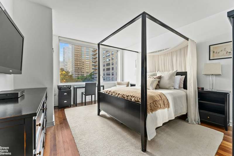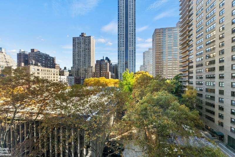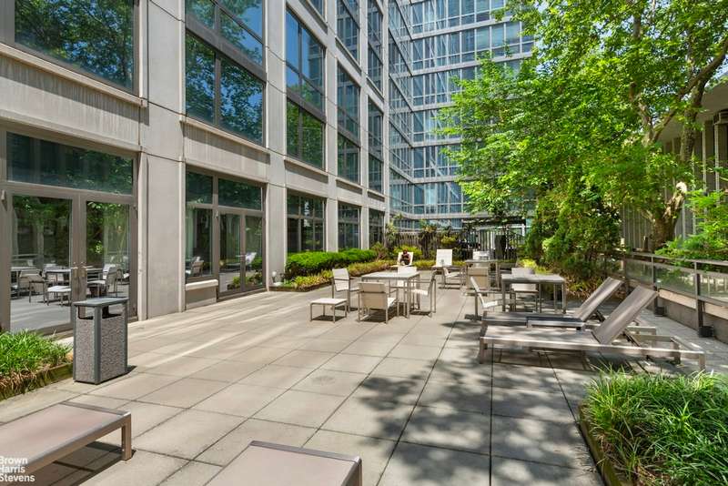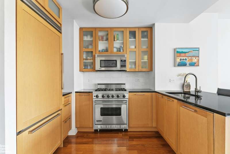 FULLY FURNISHED! This spacious and sun filled large one bedroom apartment (839') is quiet facing East, overlooking trees and open city views. There are gorgeous Brazilian Cabreuva hardwood floors thru-out, a sleek wide open kitchen with granite counter-tops, marble back-splash and Viking appliances. This special home has high ceilings, and 2-zones for heat and air conditioning. The luxurious bathroom has a deep soaking tub, separate glass shower stall and polished Bianco Verde marble and walnut vanity. A new Bosch washer/dryer is in this unit! The large handsome corner bedroom has a large walk in closet. The bedroom and living area, both have electric shades!