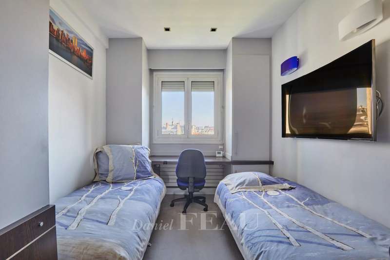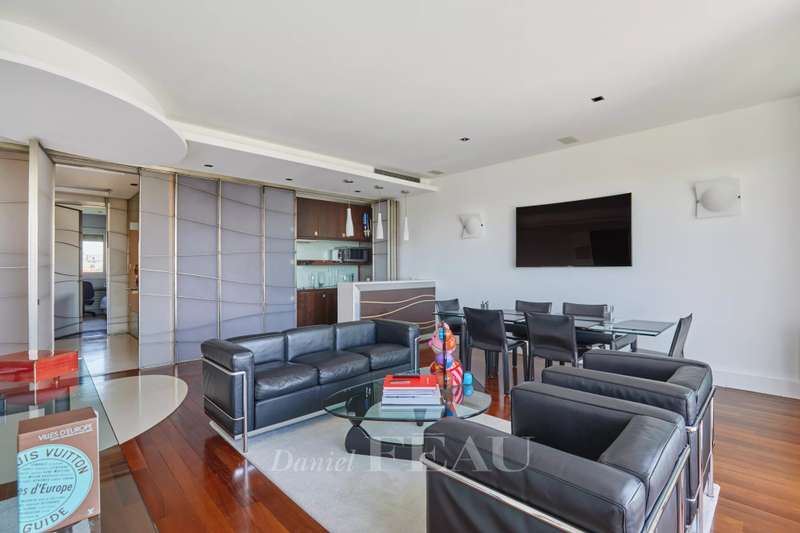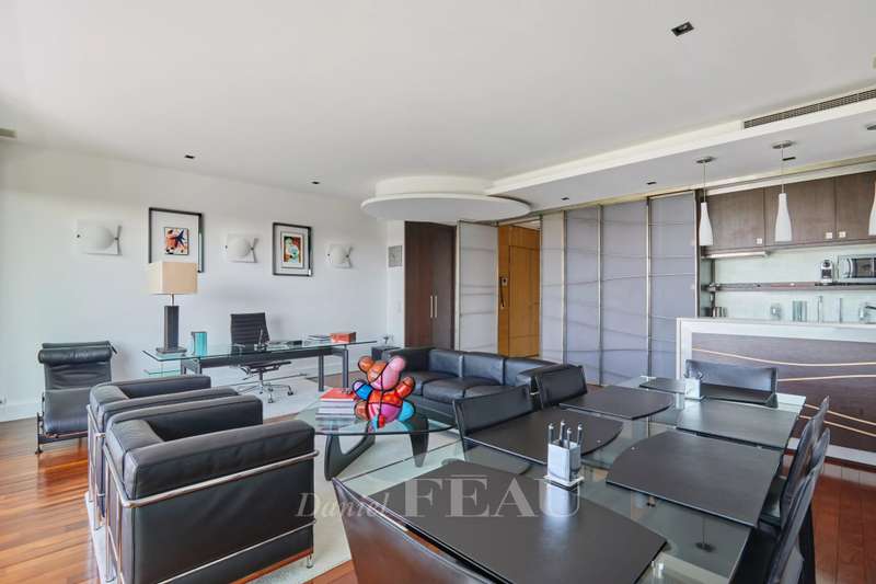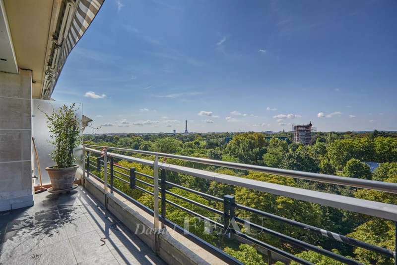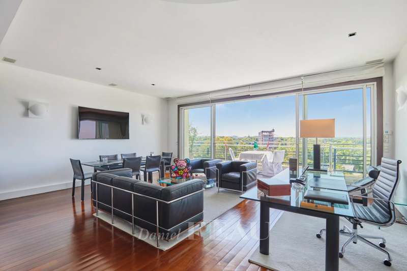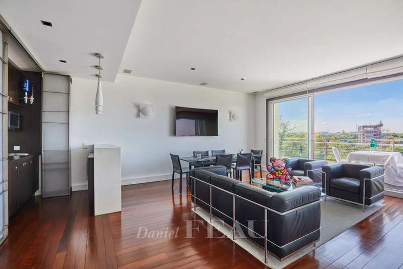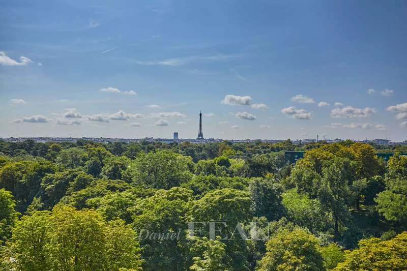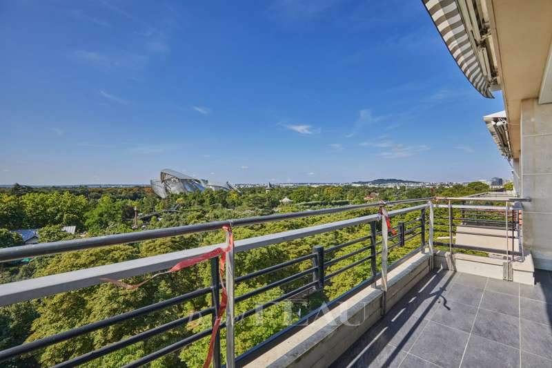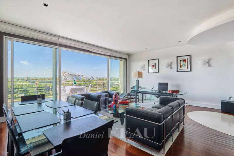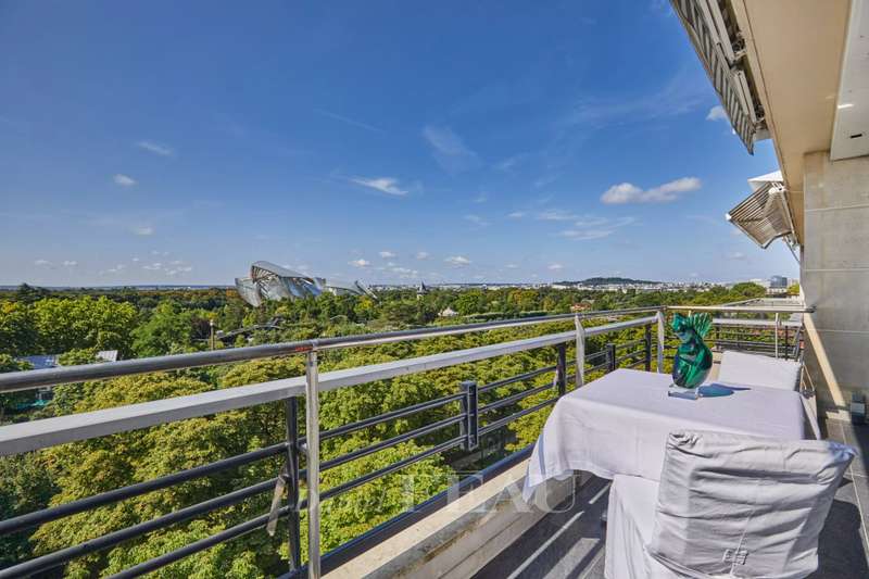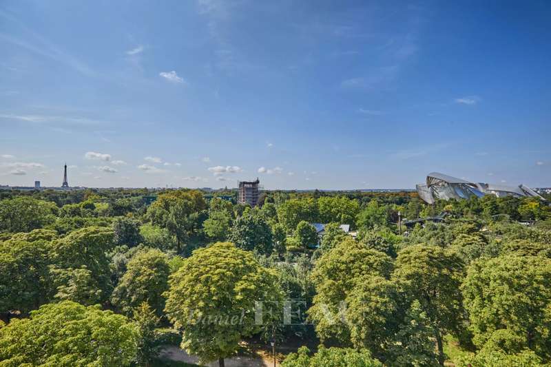Maurice Barrès. This 80 sqm apartment commanding an exceptional panoramic view of the Bois de Boulogne, the Vuitton Foundation and the Eiffel Tower is on the sixth floor of a luxurious recent building with a caretaker. It includes a spacious living/reception room and a dining room with an open-plan kitchen (all opening onto a sunny south-facing 9 sqm balcony enjoying an open view), two peaceful bedrooms, a bathroom/wc and a guest wc. Air conditioning. With two cellars.