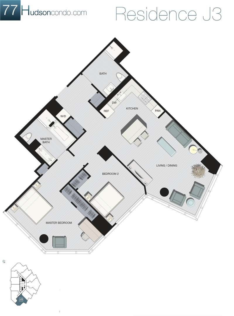 Discover this bright and spacious southeast corner 2-bedroom, 2-bath home in one of Jersey City ??s most prestigious waterfront addresses ?? 77 Hudson. Recently fully renovated and move-in ready, this residence features an expansive open living and dining area surrounded by floor-to-ceiling windows, flooding the home with natural light and showcasing breathtaking views of the Manhattan skyline, New York Harbor, Liberty State Park, and Paulus Hook Marina. Enjoy the sunrise and sunset from the comfort of your home ?? a truly rare experience in city living. Featuring Italian Dada cabinetry, Portuguese Limestone countertops, and Miele and Liebherr appliances. Additional highlights include new hardwood floors throughout and a spa-inspired primary bath with a deep soaking tub and Grecian marble finishes. 77 Hudson - an award-winning, architecturally significant building balances design and functionality, resulting in a beautiful work of art. It is an icon of the Jersey City waterfront. Residents enjoy over 44,000 sq.ft. of resort-style amenities, including: ? Swimming pool and hot tub ? Fitness center and yoga room ? Sauna and steam room ? Movie lounge and golf simulator ? BBQ area and children ??s playground ? Pet grooming station and laundry facilities Situated in the Paulus Hook neighborhood, 77 Hudson offers the best of urban convenience ?? just steps from the PATH train, Ferry, and Light Rail, with easy access to Manhattan, nearby restaurants, parks, and the Hudson River waterfront. A deeded garage parking space is included.
