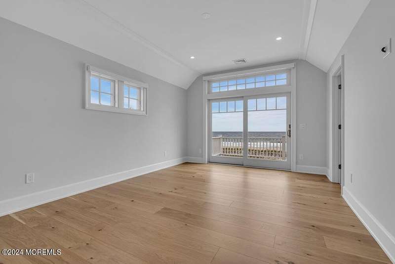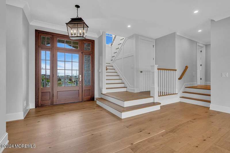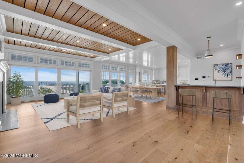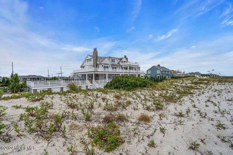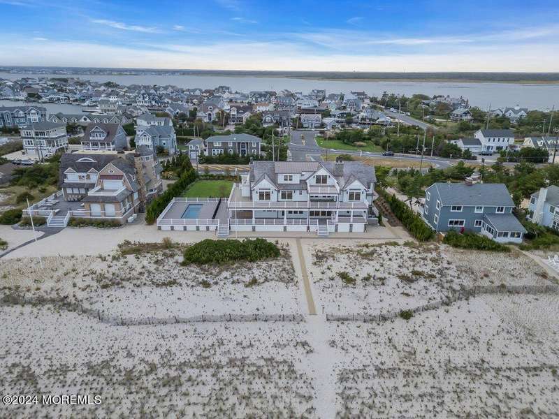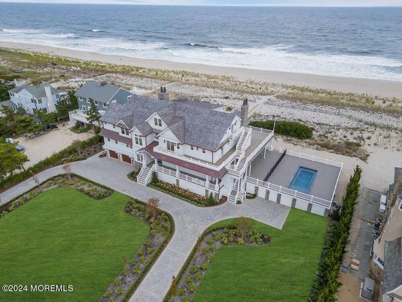 Experience unparalleled luxury in this oceanfront estate featuring 175 feet of pristine private beach and more than 13,000 sq feet of combined indoor/outdoor living space. This one-of-a-kind refined home boasts 9 bedrooms, 10 bathrooms, dual laundry rooms, a 5-stop elevator and an open floor plan that seamlessly blends family comfort with sophisticated entertaining. Every detail of this bespoke residence exudes elegance from the grand open kitchen offering a spacious walk-in entertainment pantry and secondary kitchen. Custom millwork and inset cabinetry enrich the interior, while soaring ceilings and expansive private balconies off each bedroom provide a luxurious sense of space and seclusion. The sun-drenched exterior includes multiple decks, an elevated outdoor kitchen, bar, custom gunite pool with sundeck, lounge, an outdoor bathroom and shower. The seamless integration of indoor and outdoor living is showcased with wraparound decks on each level and an additional balcony on the third floor. Enjoy breathtaking panoramic views of the ocean's sunrise and the bay's sunset from the expansive covered porches and decks, embodying the ultimate in resort-style living.