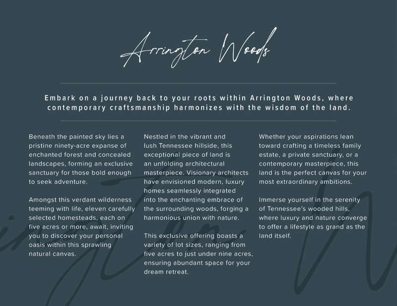 Unique opportunity to own 5.2 acres of pristine land in the rolling hills of Arrington, Tennessee, marking the debut of Arrington Woods, the area's newest and most prestigious gated community. As 1 of 11 pristine 5+ acre homesites nestled across 90 acres of picturesque, wooded land, this lot offers a unique blend of natural beauty and creates a serene and private backdrop. This particular parcel of land has already perked for up to 5 bedrooms offering flexibility in designing your dream home. Arrington Woods allows you the freedom to bring your own builder or choose from a select list of premier preapproved builders. Situated conveniently near I-840, Arrington Vineyards, historic Downtown Franklin, Arrington, and Murfreesboro, this property promises the best of both worlds - tranquility and accessibility. At Arrington Woods, contemporary craftsmanship meets the wisdom of the land creating an exclusive sanctuary.