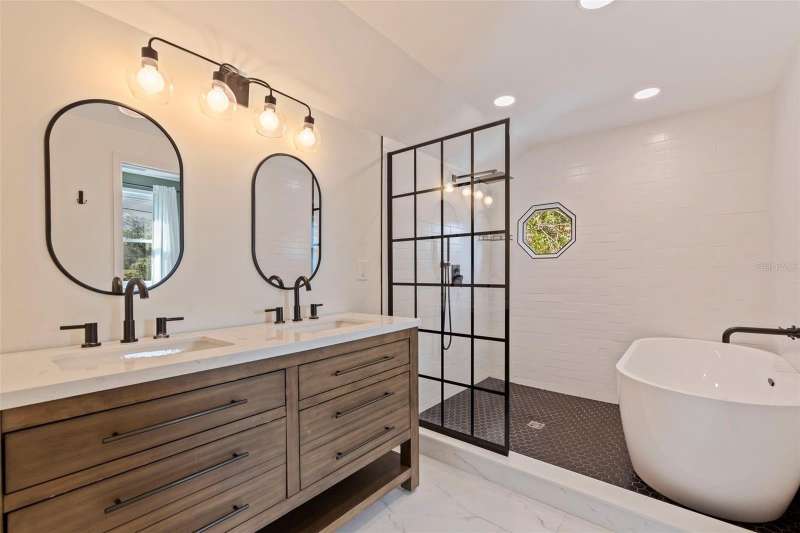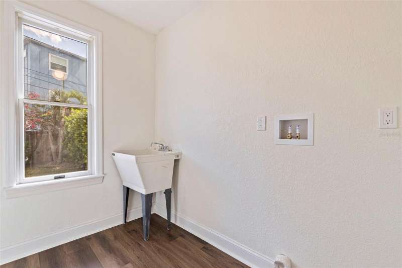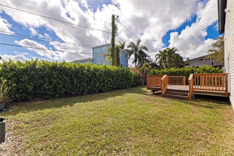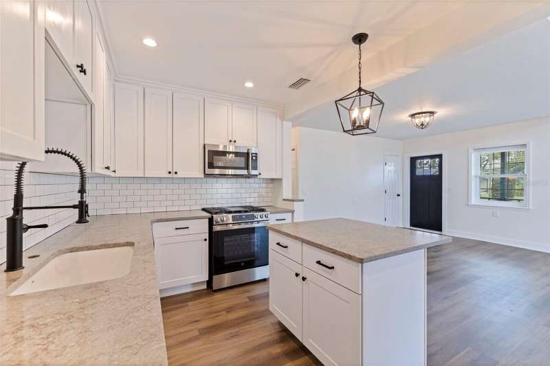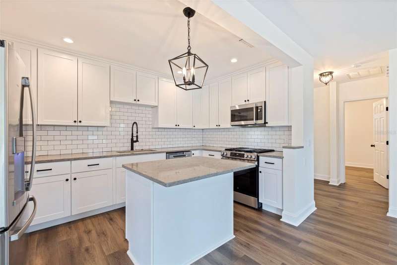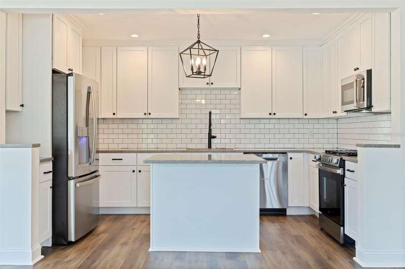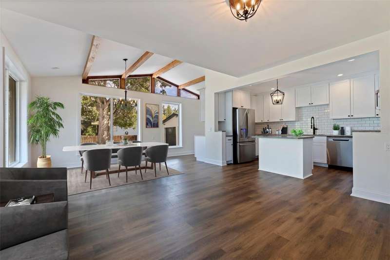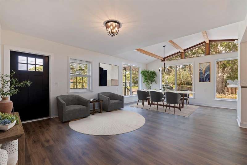 MODERN FARMHOUSE CHARM MEETS CONTEMPORARY COMFORT IN THIS NEWLY RENOVATED BEAUTY! Welcome to this stunning Modern Farmhouse–style residence, where timeless design meets everyday functionality. This spacious two-level single-family home offers an inviting blend of warmth, elegance, and modern convenience—perfectly situated on an oversized double lot with exceptional outdoor living spaces. Step through the cozy covered front porch and into a bright, open-concept lower level designed for both relaxing and entertaining. The front great room combines the living room, dining area, and gourmet kitchen into one seamless flow, highlighted by rich wood ceiling beams, 6-inch floor moldings, and luxury vinyl plank flooring throughout. The modern kitchen features gleaming stainless steel appliances, including a French door refrigerator, natural gas range with convection oven, dishwasher, and a microwave/convection combo oven. Elegant quartzite countertops and white wood cabinetry provide both beauty and function. At the rear of the home, a spacious family room opens through sliding glass doors onto a large TREX deck overlooking the fenced backyard—perfect for gatherings, play, or peaceful evenings outdoors. The lower level also includes two comfortable bedrooms, one and a half baths, and a large laundry room for added convenience. Upstairs, retreat to your primary suite, featuring a luxury ensuite bathroom with a freestanding soaking tub, oversized walk-in shower, and elegant modern finishes. A second bedroom, additional full bath, and a versatile loft space—ideal for a playroom, reading nook, or fitness area—complete the upper level. Outside, enjoy exceptional functionality with a detached two-car garage that includes a workshop area and a vintage full bathroom ready for renovation. (This area could easily be converted to an ADU for additional equity-earning potential!!) A circular driveway ensures ample parking, while masonry block construction, vinyl siding, and newer hurricane-rated windows and doors throughout the home provide durability and peace of mind. Both the roof and HVAC systems are newer as well, and there is natural gas utility for the kitchen stove/range, water heater and laundry room/dryer connection. From its picture-perfect curb appeal to its thoughtfully designed interior, this home embodies modern Florida living with farmhouse-inspired warmth. Conveniently located near downtown St. Petersburg and downtown Tampa, and within a bike ride or short drive to Weedon Island Preserve/Park for kayaking, hiking and boating. You will also be within easy access to two major airports, top-rated dining, shopping, and entertainment, and beaches --this property truly has it all.