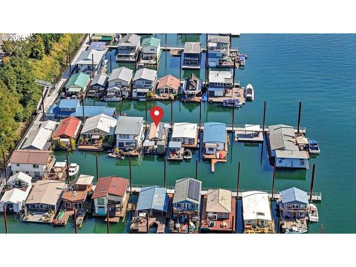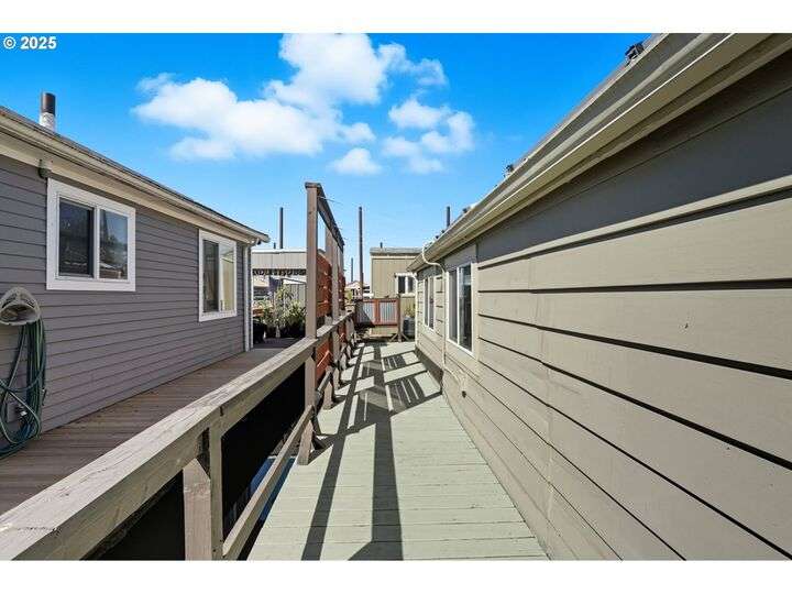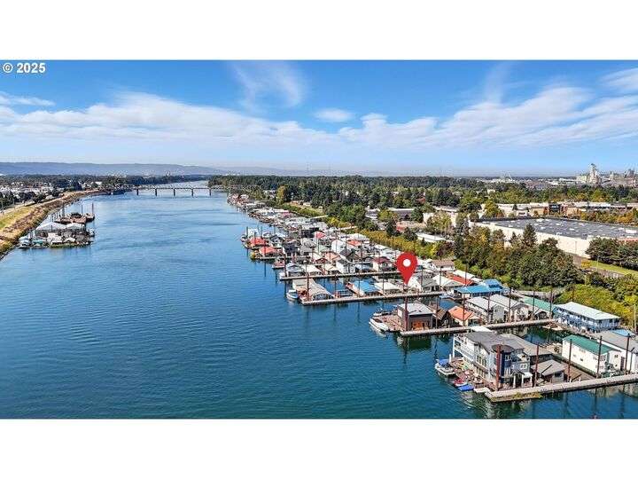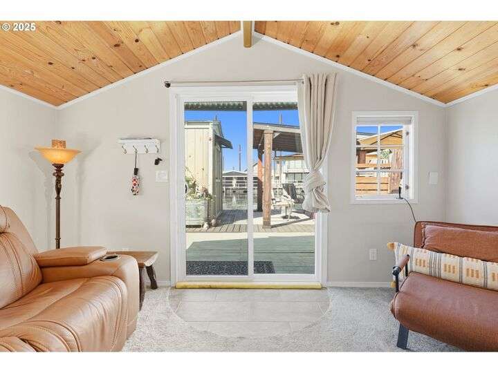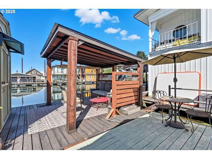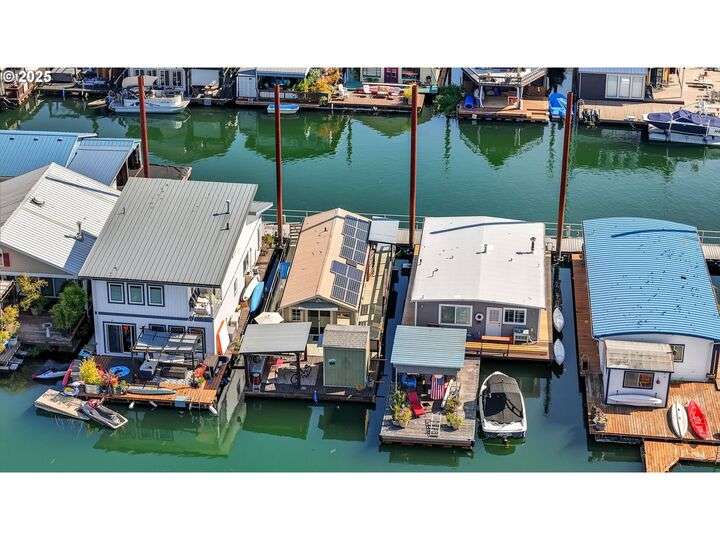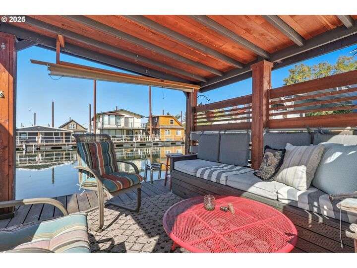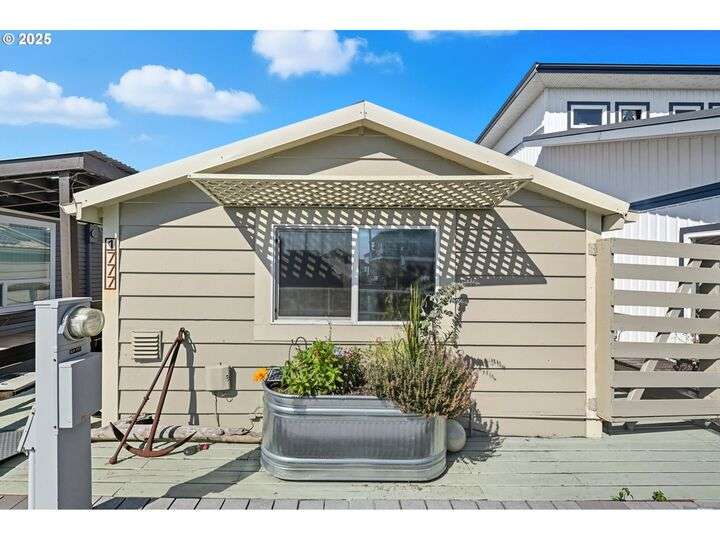 Tidy, well-maintained cottage tucked between two wide channels with close ramp access. Sunlight fills the west-facing living room, which opens through sliding doors to a spacious deck/patio and a covered riverfront gathering area for true indoor/outdoor living—perfect for relaxing or entertaining by the water. Updates include a high-end kitchen with quartz counters, custom cabinetry, heated floors, and counter seating; a remodeled bathroom with floating fixtures and beautifully tiled bath/shower; washer/dryer; and newer 24,000 BTU HVAC mini-split. Plush carpet in the bedroom plus peaceful water views. Equipped with solar panels for low monthly costs and eco-friendly living. Includes your very own boat slip and insulated shed ideal for storage or hobby use. HOA provides excellent upkeep of common areas at a very reasonable fee in a safe, clean, inviting gated community. Includes 2 car spaces (uncovered)