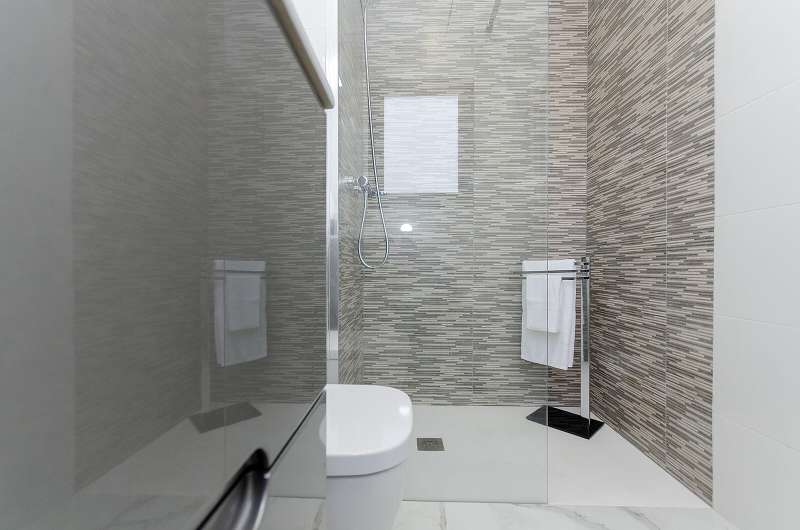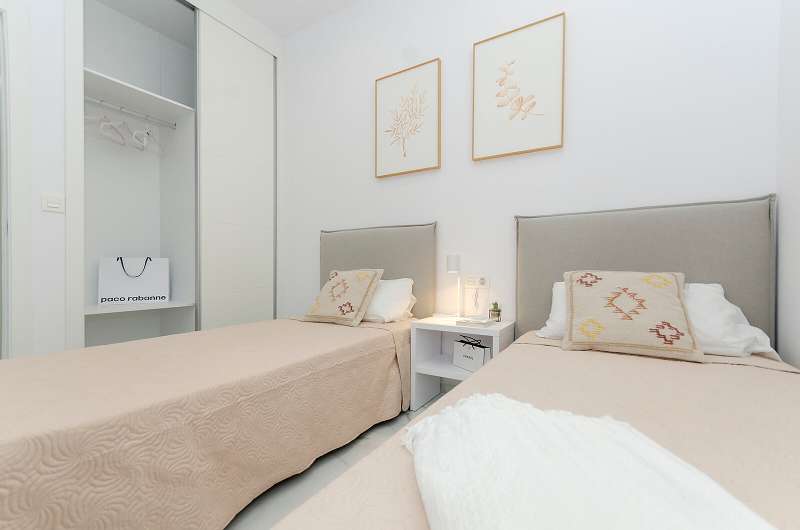 Upstairs, there are two additional bedrooms, both with fitted wardrobes and en-suite bathrooms with walk-in showers. On the roof of these villas, you have a private 45 sqm rooftop solarium.