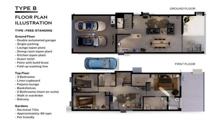 Type B units at Mintos View in Cashan Ext 34, Rustenburg, are among the most spacious and luxurious options in this new development. Here’s an overview: Type B Unit Overview Price: R2,170,000 Size: 228 sqm Freestanding, double-story home Key Features Ground Floor: Open-plan lounge, dining room, and kitchen. Guest toilet. Covered patio with a built-in braai. Pet-friendly garden. Double garage with an additional parking space. Top Floor: Three bedrooms. Main bedroom with a walk-in wardrobe and a full en-suite bathroom. Additional full bathroom serving the other two bedrooms. Linen cupboard. Balcony. Pajama lounge (with an option to convert this into a fourth bedroom). Customization and Personalization Buyers of Type B units can opt for structural changes, such as merging the patio with the lounge for a larger living area or converting the pajama lounge into an additional bedroom. The interior finishes, including wall tiles, floor tiles, and cupboard colors, can also be personalized. Included Costs One of the major selling points is that both transfer and bond costs are included in the purchase price, reducing the upfront financial burden for buyers. This unit type is perfect for families seeking a spacious, modern home with premium features and customization options in a secure, upmarket estate