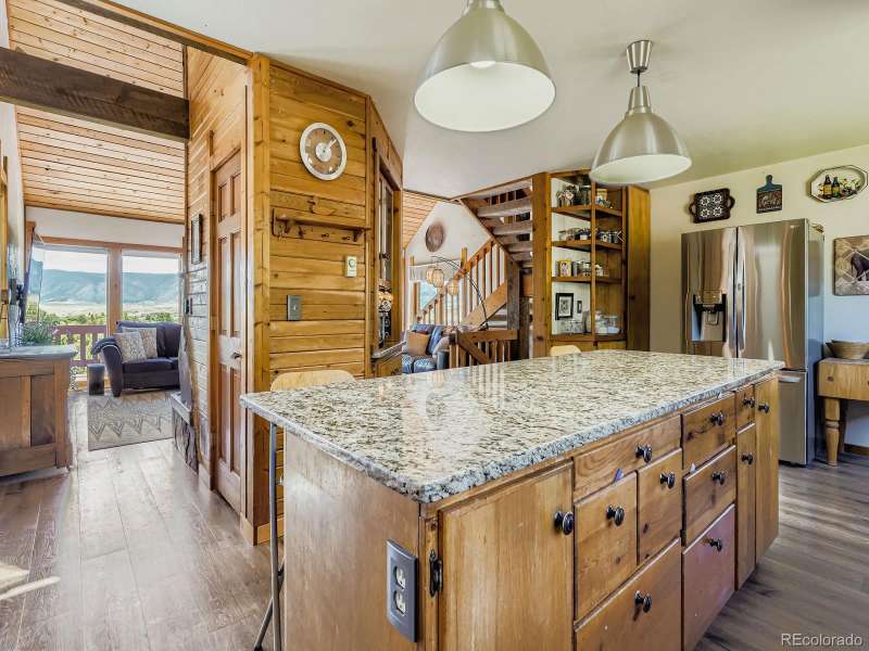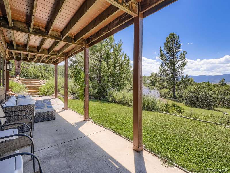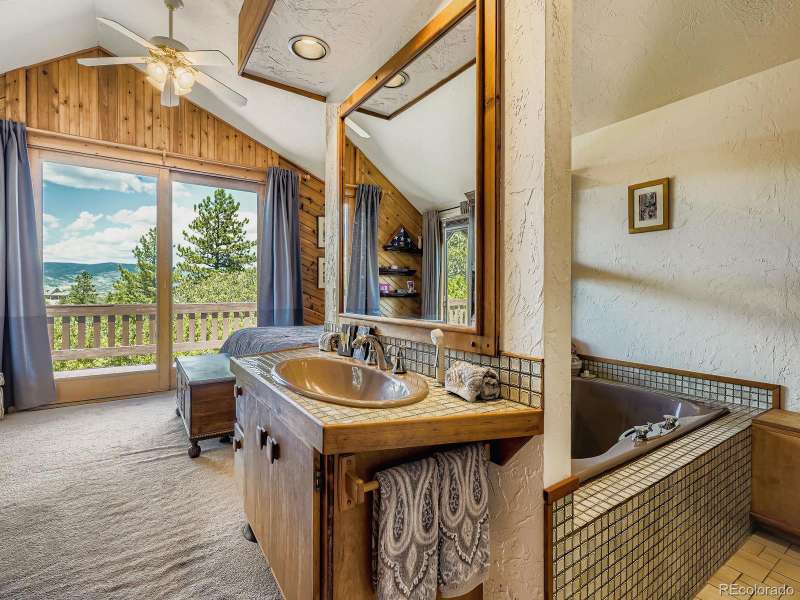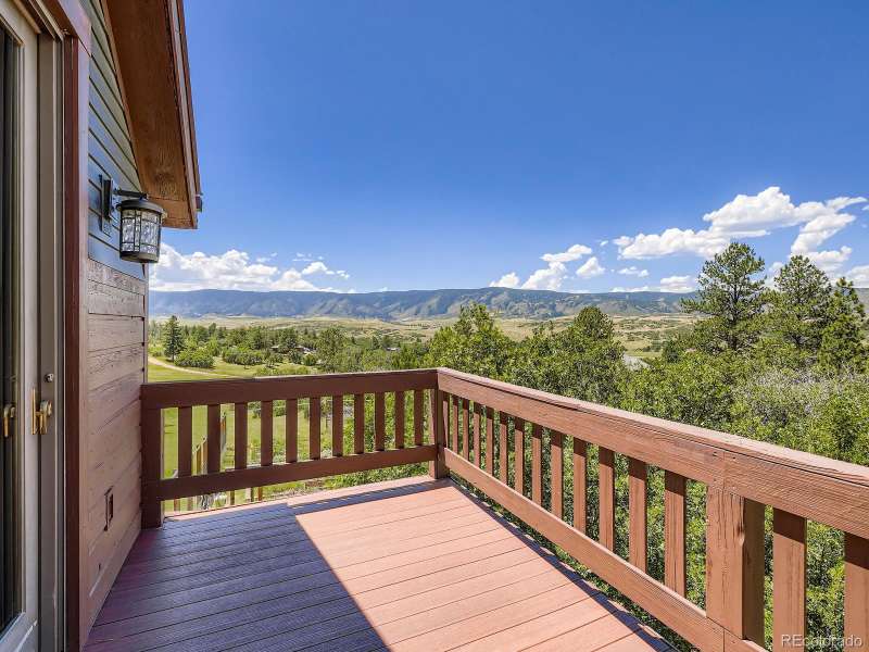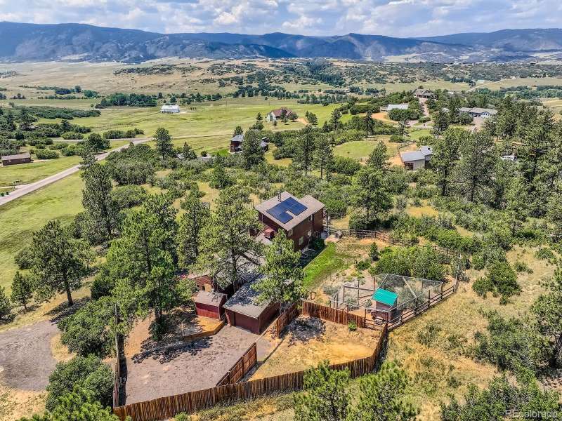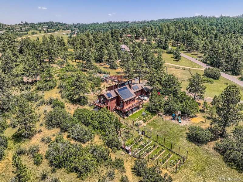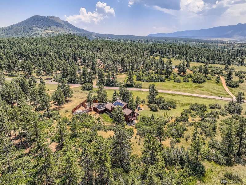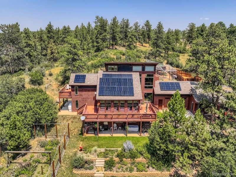 Experience the beauty of Colorado living at its finest with this unique custom mountain home, just 20 minutes from Castle Rock. Nestled on 5.3 acres, this multi-level home features 4 bedrooms, a loft, and 4 bathrooms. The open floor plan invites you into the great room, where breathtaking mountain and valley views await, complemented by a two-story stone wood fireplace and charming tongue-and-groove pine accents. The updated kitchen boasts a large granite island, double ovens, and slab granite counters. Adjacent is a spacious dining room with a convenient pass-through to the kitchen. Unwind in the primary suite, complete with a private deck perfect for morning coffee or yoga. Additional highlights include two secondary bedrooms, a versatile loft space - perfect for office or library, and a finished walk-out basement with a family room, bedroom, kitchenette, and ¾ bath. Enjoy the outdoors with fenced areas for pets, gardens, and a chicken coop which includes the chickens. An attached two-car garage and a 1085 square foot multi-use addition provide ample space for all your needs. Plus, benefit from a $70,000 solar system fully paid by the seller at closing. Embrace the peaceful mountain life - this opportunity will not last.