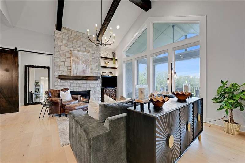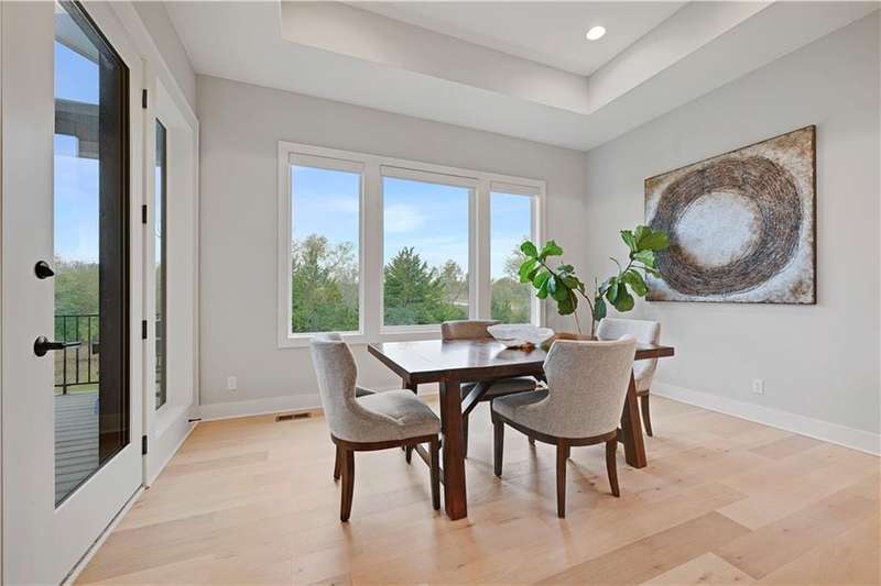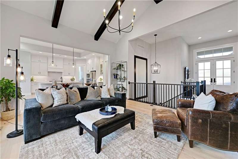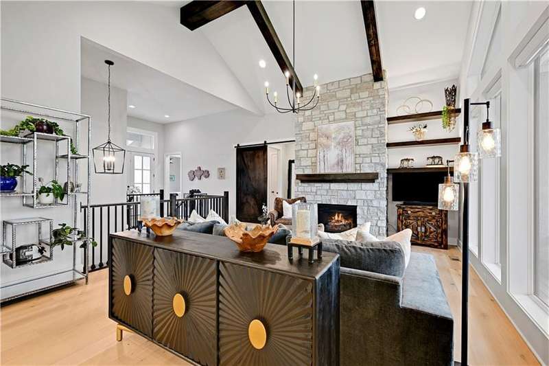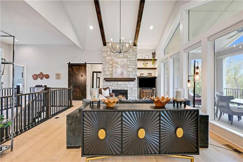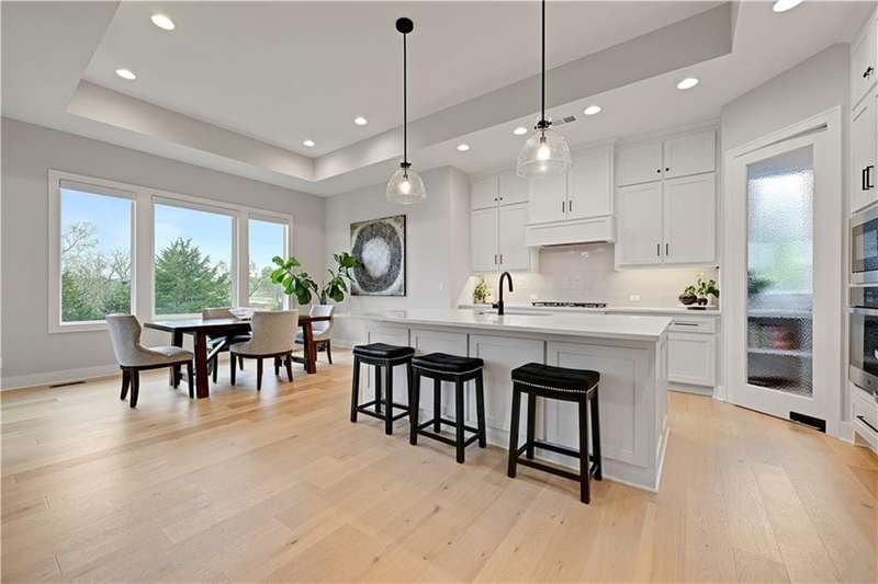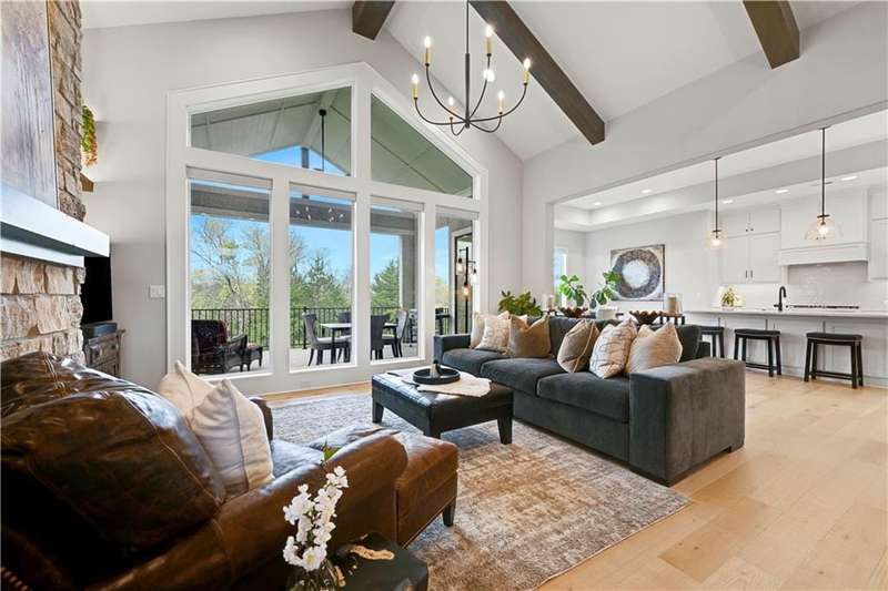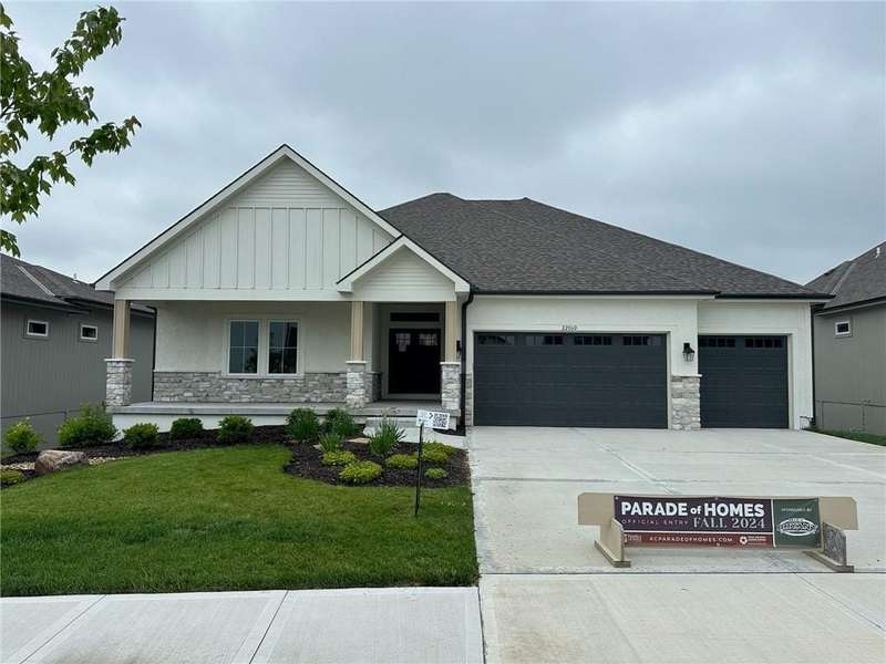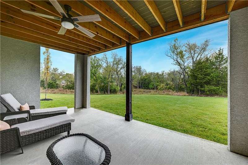 Tucked on a huge private walkout lot with mature trees and surrounded on 3 sides by green space, this expanded Avala reverse by JS Robinson offers easy main-level living at the Villas at Hidden Lake in Cedar Creek. Lived in less than a year and better than new, the home includes nearly 1,900 sq ft on the main floor with a vaulted great room featuring pine beams, a full wall stone fireplace with mantle, accent floating shelves and expansive full-light views. The chefs kitchen offers ceiling-height custom cabinetry, island seating, high end appliances including a built in oven, microwave, gas range, and beverage fridge. The oversized pantry has a rain glass swing door, coffee bar with display shelves and a huge window adding light to the entire kitchen. The large covered deck off the expanded open dining area offers a private and peaceful spot for taking in the amazing backyard and Kansas sunsets. Wide stairs open to the beautiful walkout lower level ideal for entertaining with a large family room, wet bar, wine/storage room, game area, and two additional bedrooms that share a jack and jill bath with large shower. A Sonos sound system serves the interior as well as both the covered deck and lower patio, creating a seamless indoor/outdoor experience. The backyard feels private and natural, with upgraded landscaping including added aspen and maple trees and boulders.A Vivint security system is already installed, and maintenance is easy with lawn care and snow removal included.