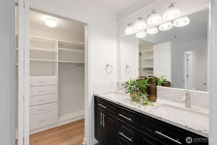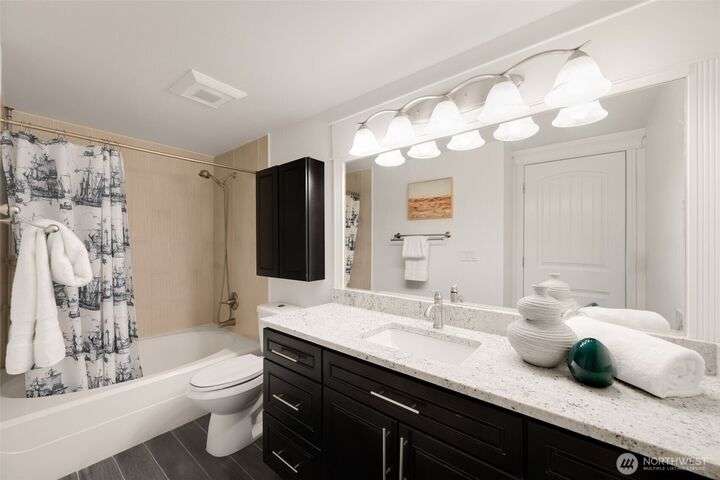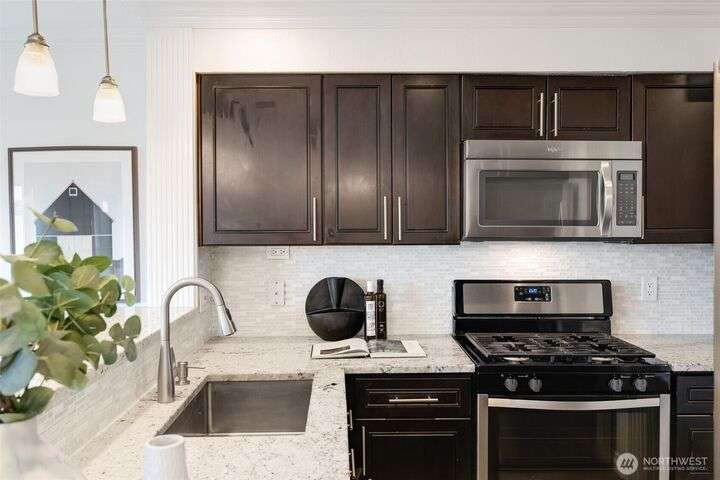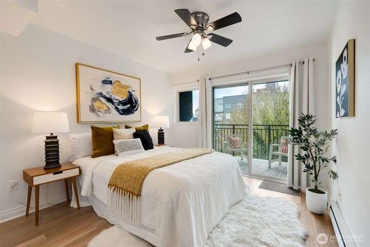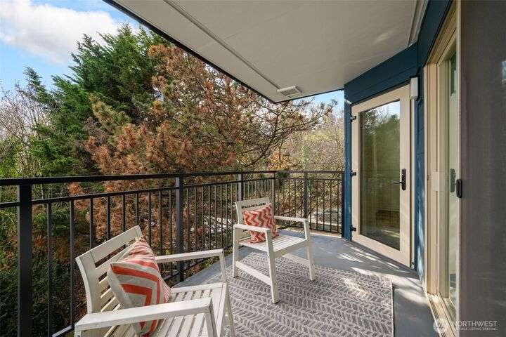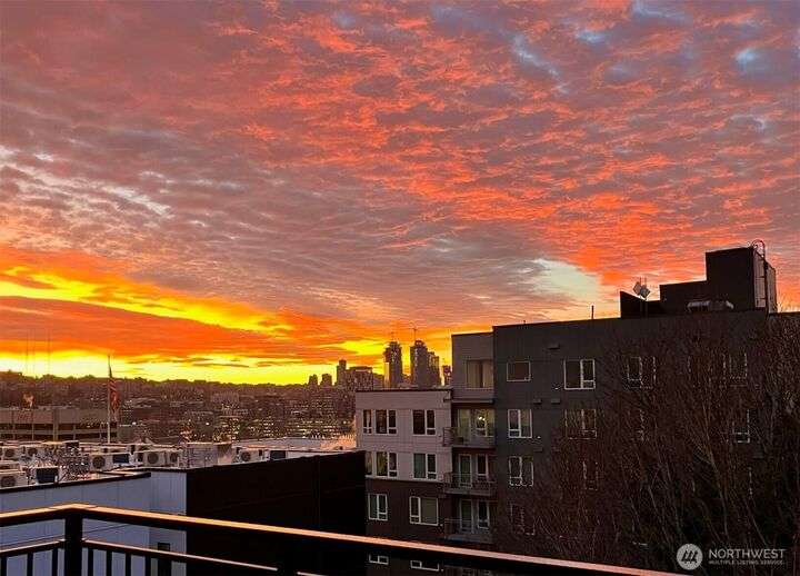 Discover this stunning, light-filled, two-level, top-floor corner unit with breathtaking Lake Union and downtown views! The open-concept living and dining area flows onto a large private balcony, perfect for entertaining. Enjoy a cozy gas fireplace, a modern kitchen with SS appliances, a bar counter, and gas range, plus a convenient half bath on the main level. Downstairs, find two spacious bedrooms, 1.75 baths, and in-unit laundry. The primary bedroom boasts a private balcony, ensuite bath, and walk-in closet with custom shelving. Includes secure garage parking and storage. Savor Fourth of July fireworks from the rooftop deck of this pet-friendly building, steps from Amazon HQ, downtown, and Queen Anne amenities. Not to be missed!