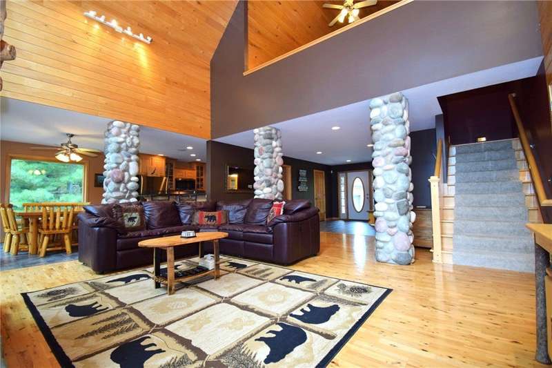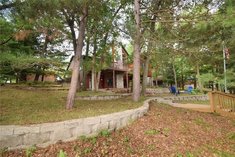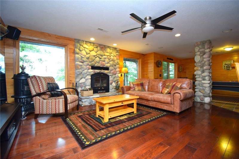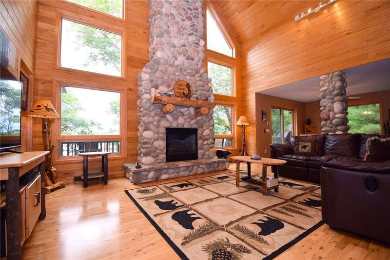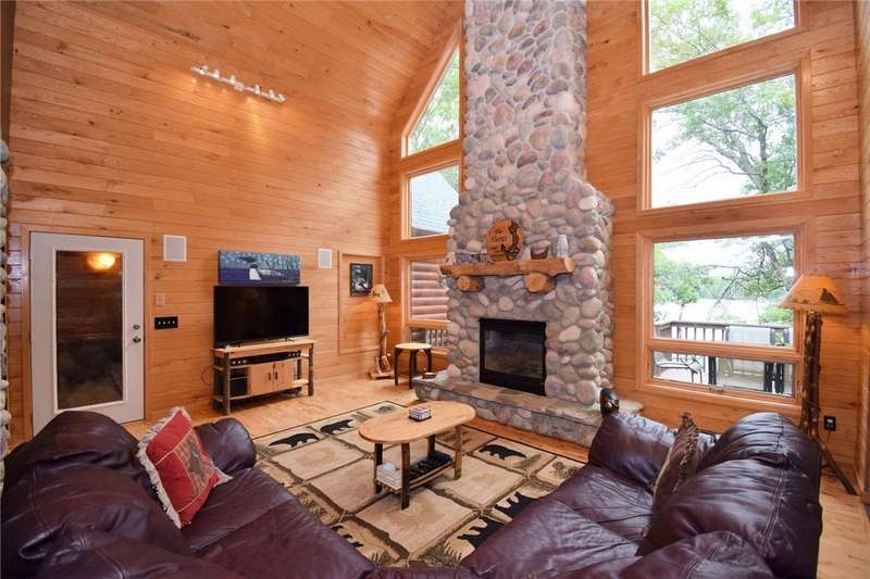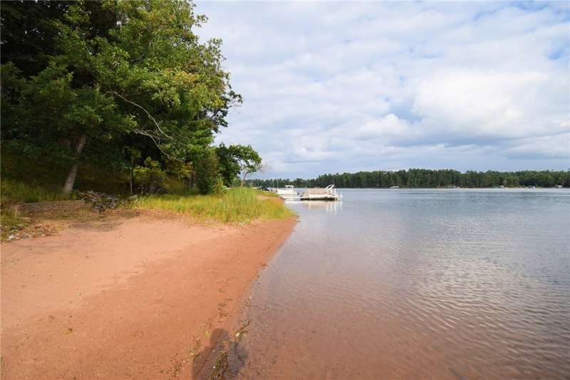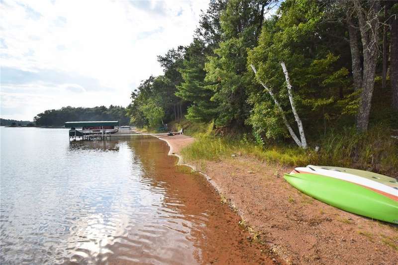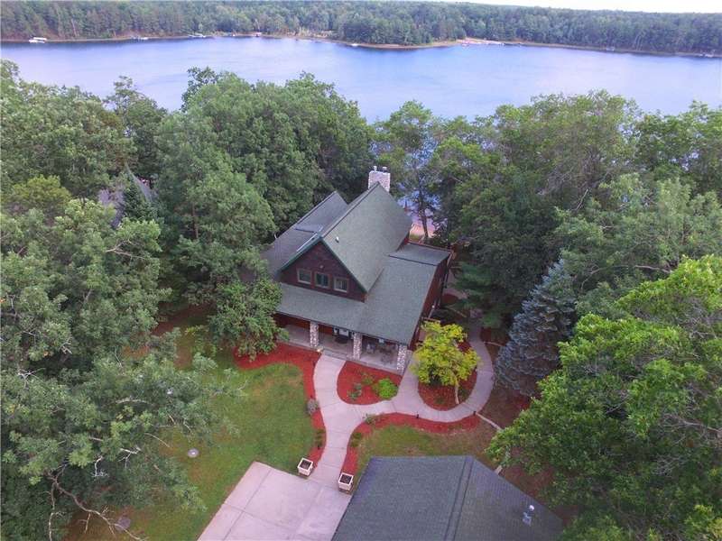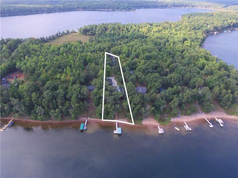 Executive 5 BR, 4 BA log-sided chalet on highly sought-after Long Lake in Webb Lake! This stunning, turn-key property offers 100' of sand beach, crystal-clear water, & southern exposure. Impressive soaring great room with a floor-to-ceiling fieldstone gas fireplace & a wall of glass framing unforgettable views. The kitchen features stainless steel appliances, breakfast bar, & adjoining dining space. Tongue & groove pine, wood floors, spacious entry, & main-floor laundry add warmth & convenience. Private master suite retreat has lakeside deck access, & a spa-like bath with slate tile walk-in shower. Ensuite loft with Jacuzzi tub. Walkout lower level w/wood burning fieldstone fireplace, wet bar, pool table, sauna, & abundant storage. Beautifully landscaped grounds, outdoor shower, firepit & lakeside deck, vacuum in garage. Welcoming covered porch leads to a 4-car insulated/heated garage w/concrete drive & ample parking. Don't miss making this your new northwoods lakeside retreat!