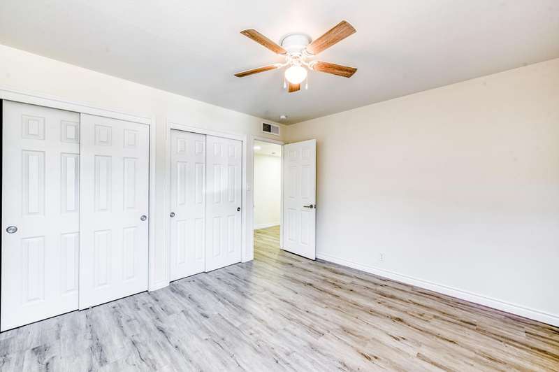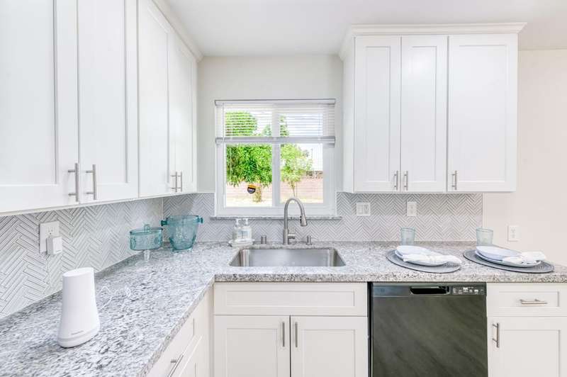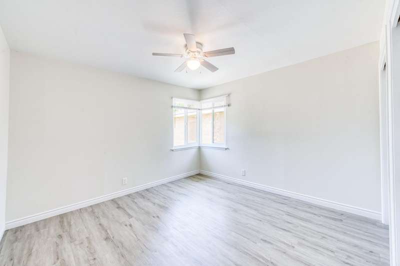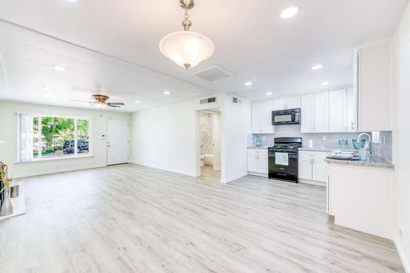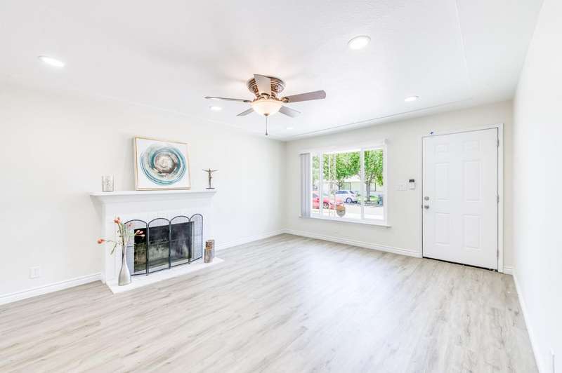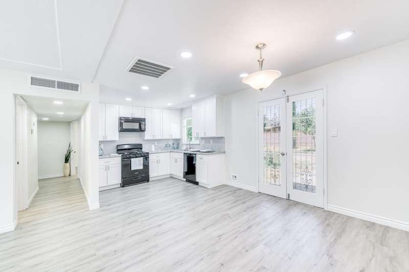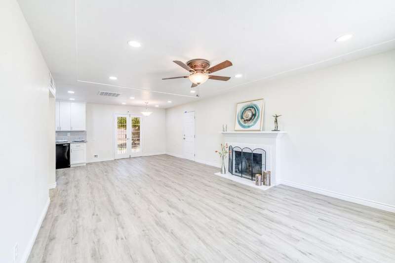 Welcome to this beautifully refreshed 3-bedroom, 2-bath home, featuring an en-suite in the primary bedroom and 1,092 square feet of bright, open living space. The heart of the home is the updated kitchen with white cabinets, granite countertops, herringbone tile backsplash, and sleek black appliances. The spacious living area boasts new luxury vinyl plank flooring, recessed lighting, and a cozy white brick fireplace with contemporary accents.Step outside to a generously sized backyard with mature citrus trees perfect for relaxing in the shade or hosting summer BBQs. French doors offer seamless indoor-outdoor flow, and the attached garage and long driveway provide ample parking.Located in a quiet neighborhood with easy access to schools, shopping, and freeways, also equipped with a new roof & HVAC, this move-in-ready gem blends style, comfort, and value. Come see it today!