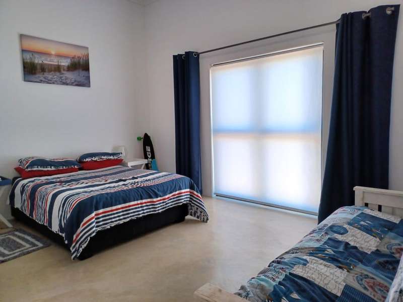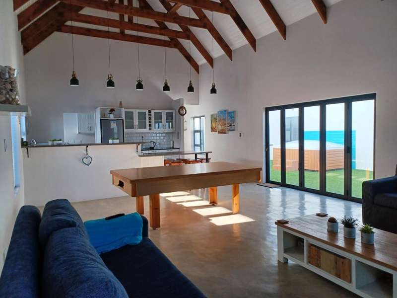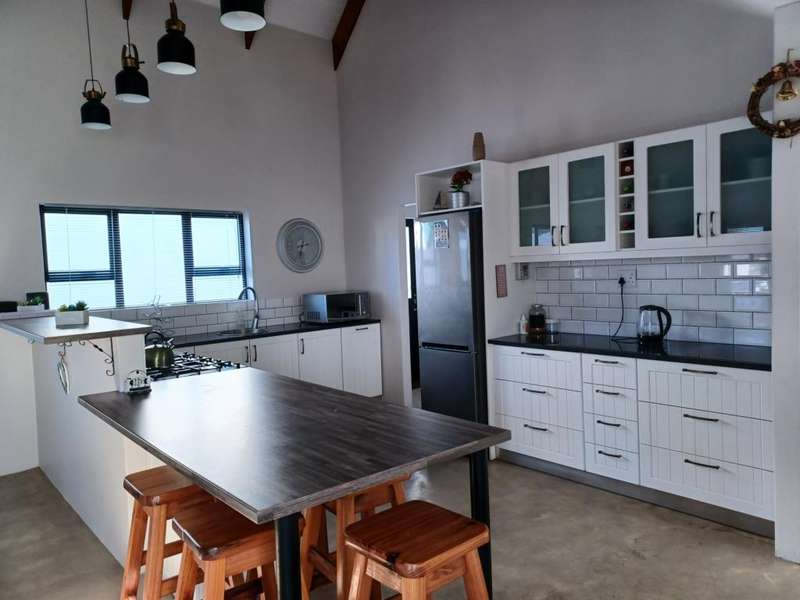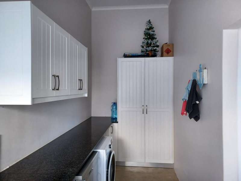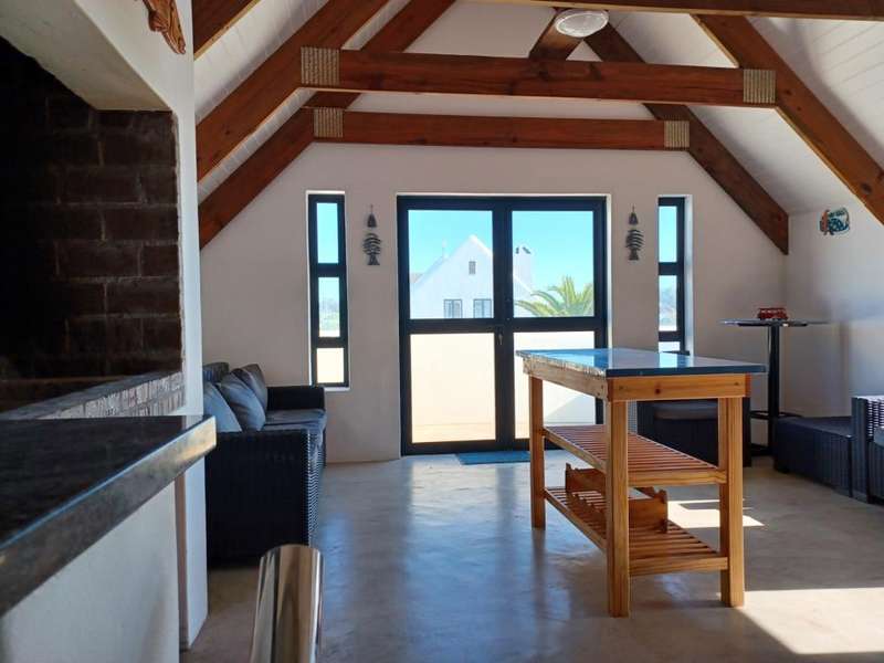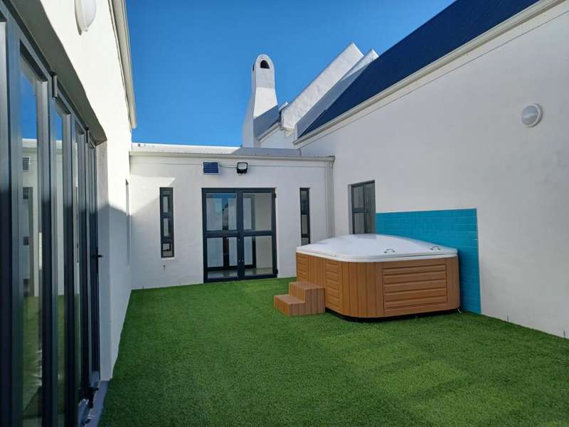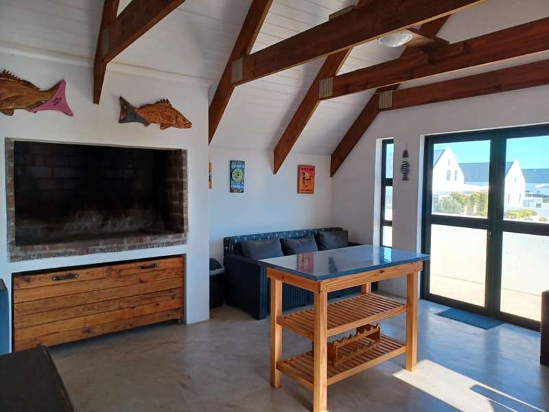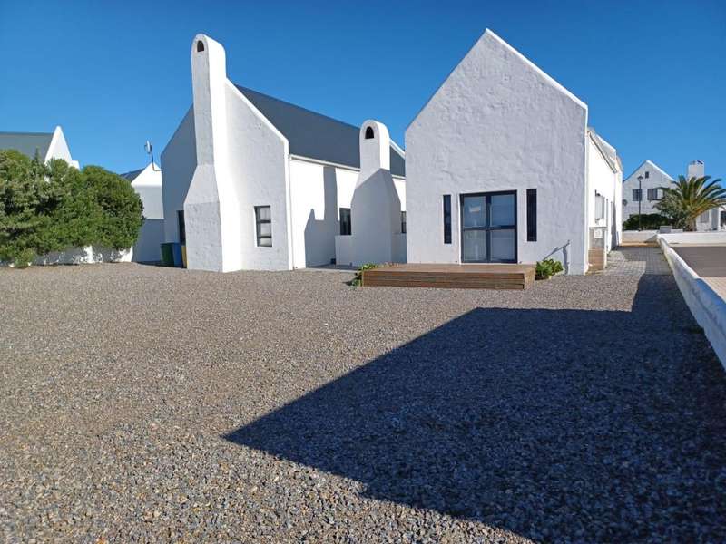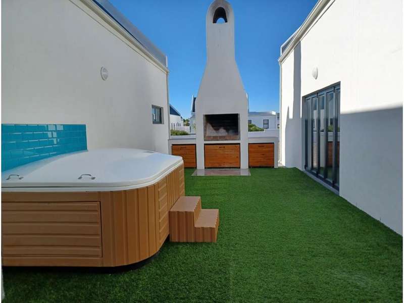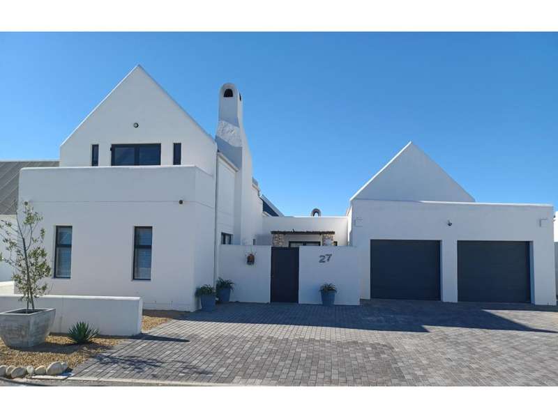 HUGE House in Dwarskersbos An upmarket 4-bedroom house within walking distance to the beach, is situated in the popular Kersbosstrand in Dwarskersbos. Entrance to the property is though an 1.8m enclosed courtyard for privacy and double security. Inside is an evergreen lawn with paved walk-way, stone-clad columns and a wood-slatted canopy. Access to the home is through a double front door into an entrance hall. Left to the bedrooms, and right to the guest loo and the open plan living design. Straight-ahead leads you through a second double door onto an open-air outside entertainment area that offers a jacuzzi, evergreen lawn, built-n braai and mingling space. An extra-large backyard allows for running space, sports or further property extensions. The home is modern in fittings and trimmings. The spacious double volume open plan living fits the kitchen, dining and lounge with a fire-place. You get a functional kitchen, with breakfast seating, and enough cupboard space. The granite tops extend to the scullery and laundry further back with space for a washing machine and a dish washer, and more cupboards. The back-door leads to a paved side and wash trough. There is an upstairs entertainment room which house a built-in braai, lounge and a fitted bar. It boasts a balcony and sea views. All 4 bedrooms have en-suites and sliding-door built-in cupboards. There are 2 extra-large main bedrooms and 2 sizeable guest bedrooms. Geysers are all gas-lit. The flooring of the house is cement-screed throughout. You access the automated double garage from the entrance hall. There are plans for a double carport in front of the garage. The house is walled on both sides and the back. It is worth a viewing and caters to large families and entertainers! Please contact me to set-up an appointment.
