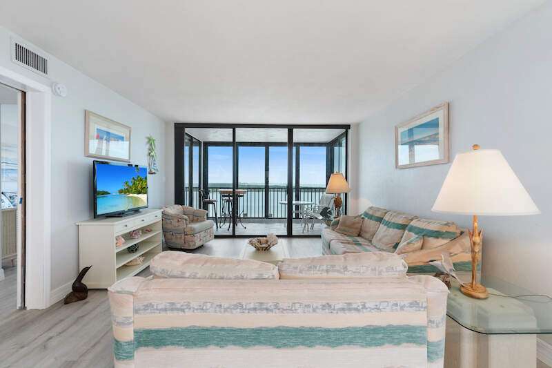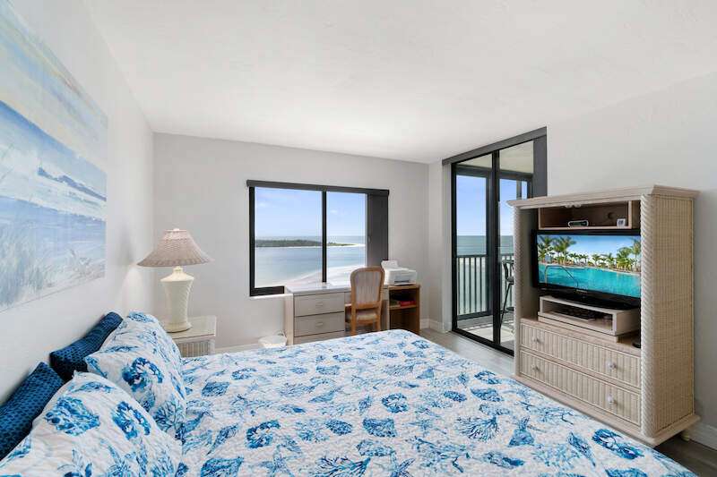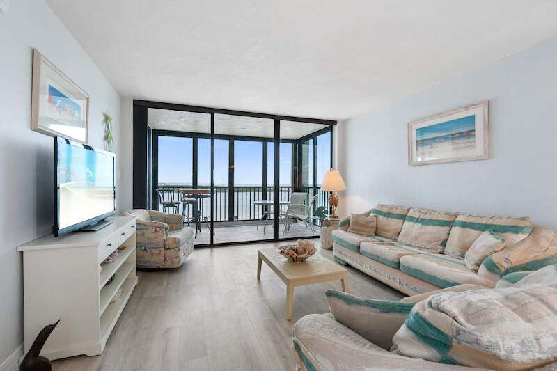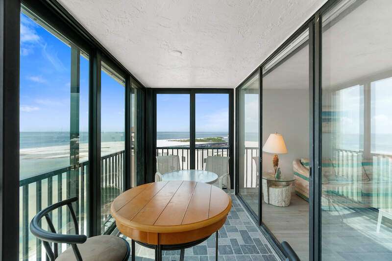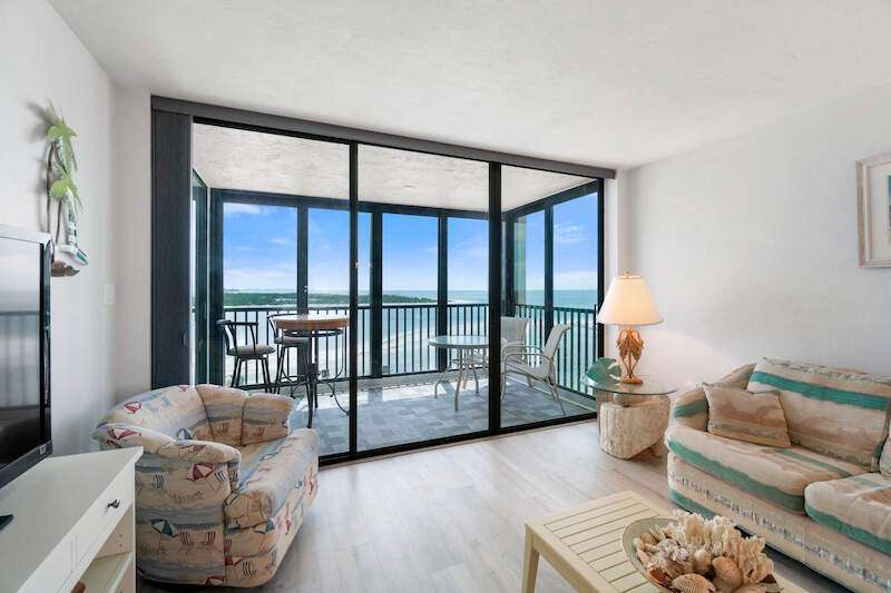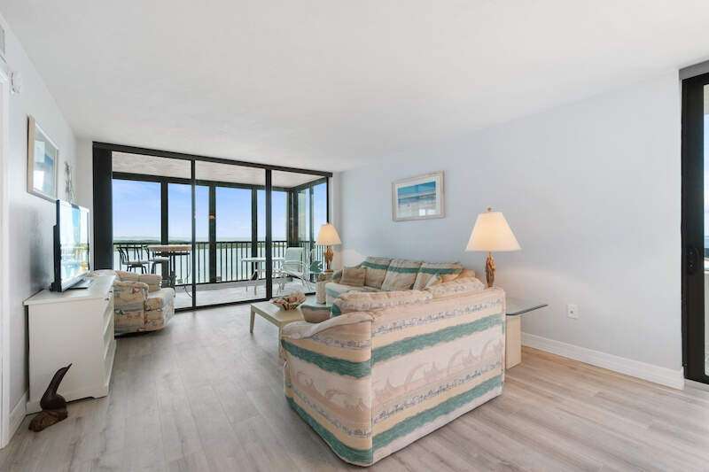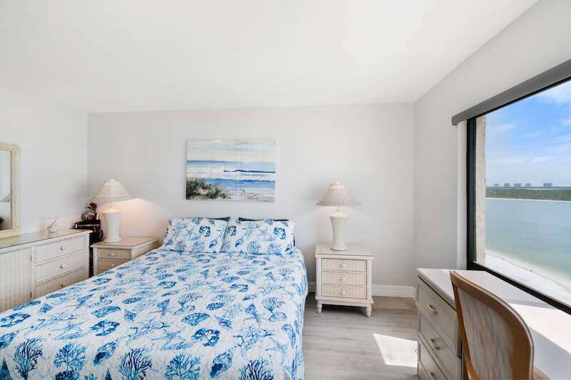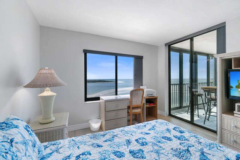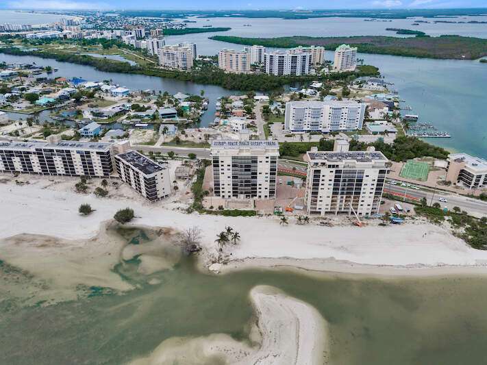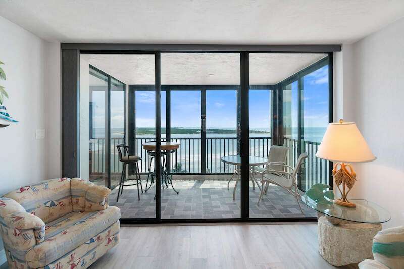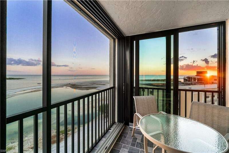 Beautiful 8th-floor beachfront END-UNIT with spectacular Gulf, Inlet & Bay views on the peaceful South End of Estero Island! This 1082 sq ft coastal retreat is finely appointed with 2 beds/2 baths, an inviting open floor plan, hurricane impact windows, new HVAC (Dec 2021), and tile and laminate flooring throughout. Enjoy some of the best views on the island- from breathtaking sunsets over the Gulf of Mexico on your spacious lanai to serene sunrises over the bay. The screened lanai offers a 270+ degree view and NEW hurricane impact glass sliders, providing the flexibility to be an enclosed sunroom or an open-air retreat when you want to soak in the soothing sounds of the surf. The kitchen is designed for both beauty and functionality, showcasing light custom cabinetry, granite countertops, stainless steel appliances, tray ceiling with accent lighting, and extra counter space and cabinets for storage. Retreat to the primary bedroom, where you'll find private access to the lanai, stunning Gulf views, a walk-in closet, and a generous bathroom. This unit includes a parking space and an extra storage room on the same floor as the unit for your convenience. Islands End offers resort-style amenities, including two community pools, a spa, BBQ grills, tennis/pickleball courts, kayak storage, a fishing pier, and a community room. Since Hurricane Ian, Islands End has undergone several million dollars worth of repairs and improvements. SIRS compliance for the building was completed November 2024. The reserve study has been completed and approved. Islands End is perfectly situated close to Big Carlos Pass providing easy access to Lovers Key and Bonita beach. Experience the perfect blend of relaxation and recreation in this exceptional beachfront retreat!