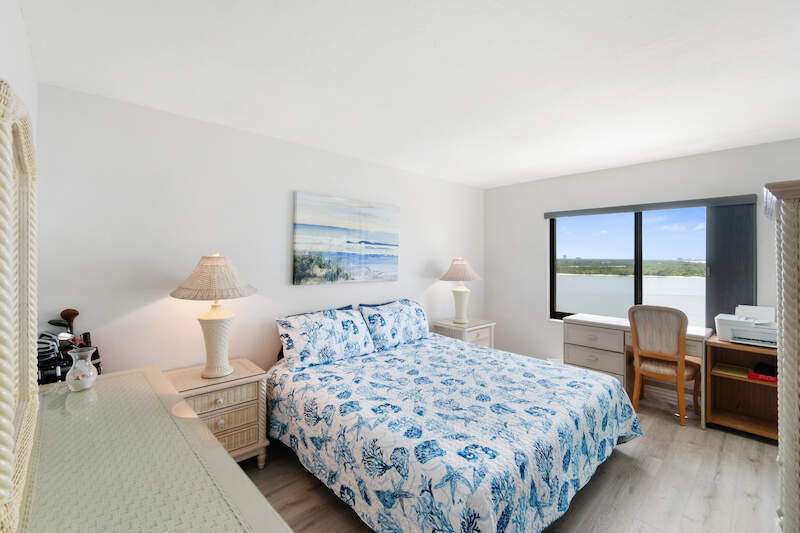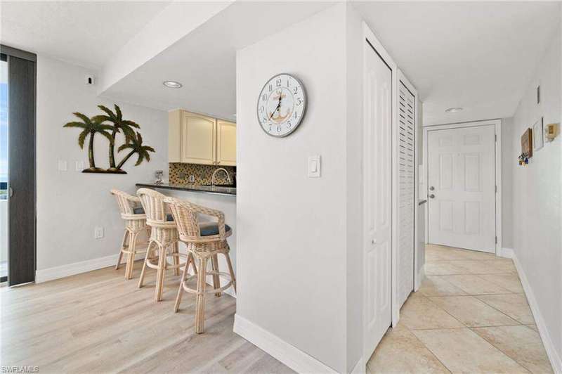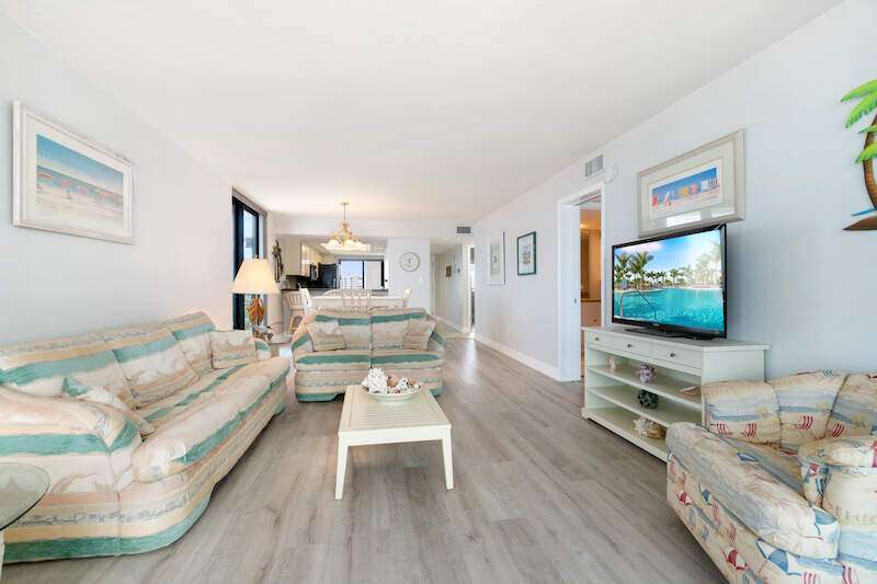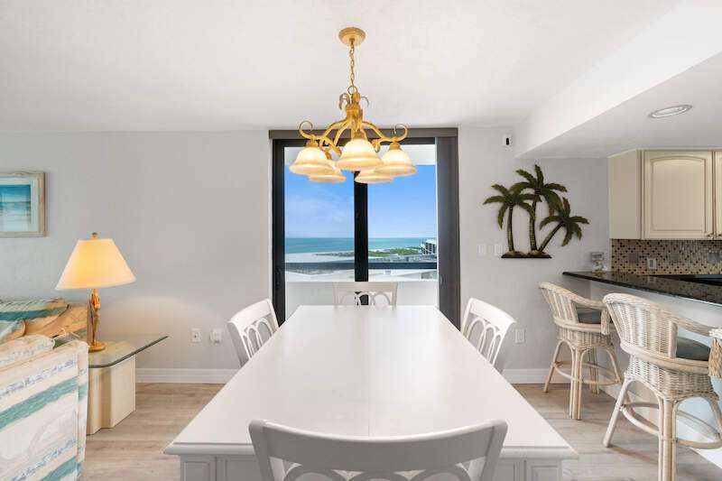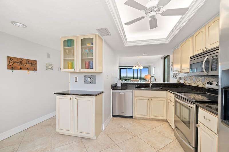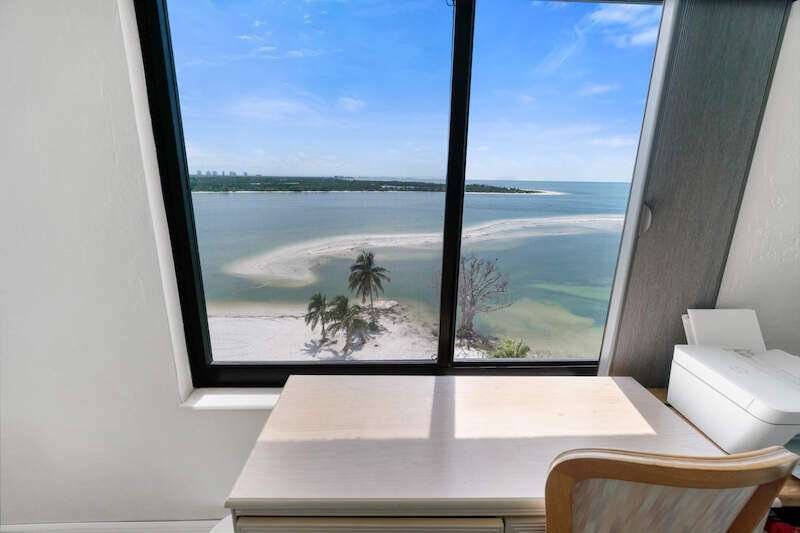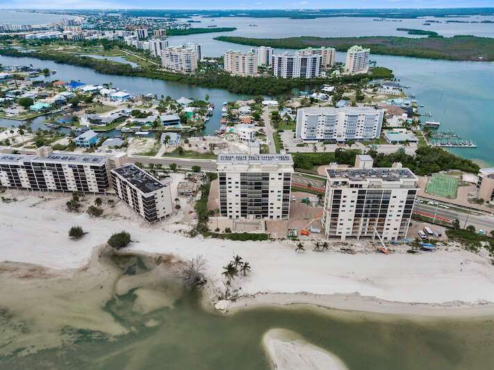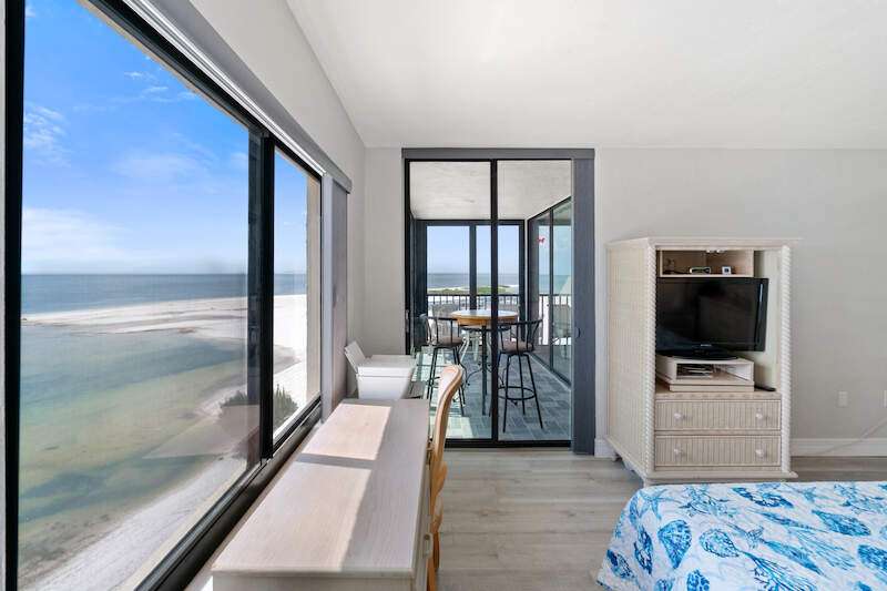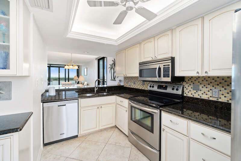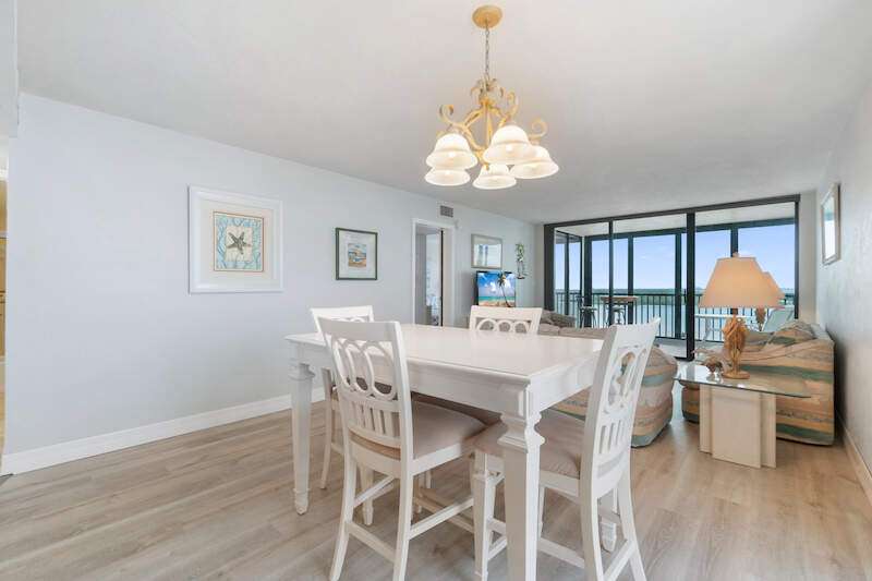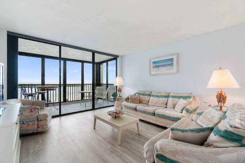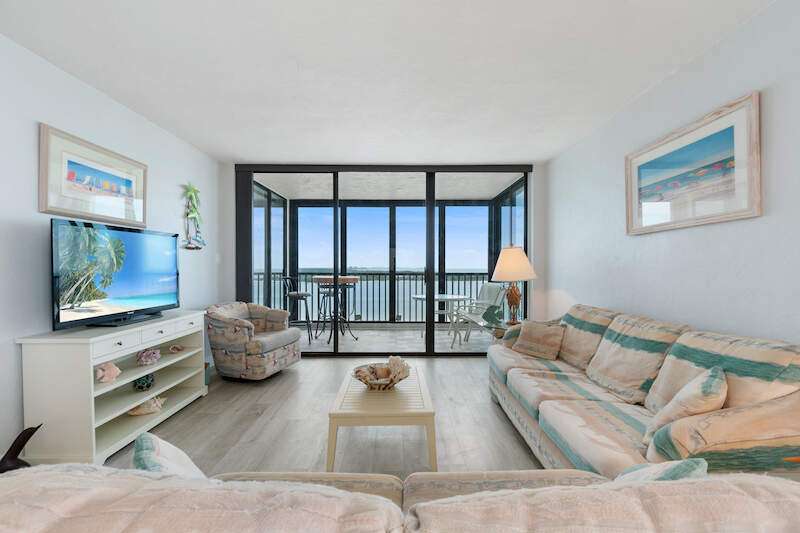 Beautiful 8th-floor beachfront END-UNIT with spectacular Gulf, Inlet & Bay views on the peaceful South End of Estero Island! This 1082 sq ft coastal retreat is finely appointed with 2 beds/2 baths, an inviting open floor plan, hurricane impact windows, new HVAC (Dec 2021), and tile and laminate flooring throughout. Enjoy some of the best views on the island- from breathtaking sunsets over the Gulf of Mexico on your spacious lanai to serene sunrises over the bay. The screened lanai offers a 270+ degree view and NEW hurricane impact glass sliders, providing the flexibility to be an enclosed sunroom or an open-air retreat when you want to soak in the soothing sounds of the surf. The kitchen is designed for both beauty and functionality, showcasing light custom cabinetry, granite countertops, stainless steel appliances, tray ceiling with accent lighting, and extra counter space and cabinets for storage. Retreat to the primary bedroom, where you'll find private access to the lanai, stunning Gulf views, a walk-in closet, and a generous bathroom. This unit includes a parking space and an extra storage room on the same floor as the unit for your convenience. Islands End offers resort-style amenities, including two community pools, a spa, BBQ grills, tennis/pickleball courts, kayak storage, a fishing pier, and a community room. Since Hurricane Ian, Islands End has undergone several million dollars worth of repairs and improvements. SIRS compliance for the building was completed November 2024. The reserve study has been completed and approved. Islands End is perfectly situated close to Big Carlos Pass providing easy access to Lovers Key and Bonita beach. Experience the perfect blend of relaxation and recreation in this exceptional beachfront retreat!