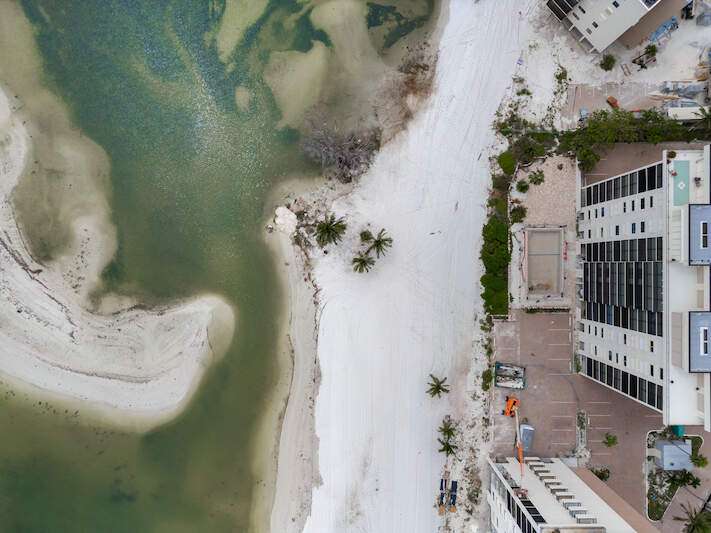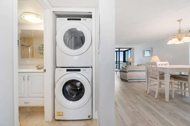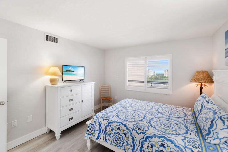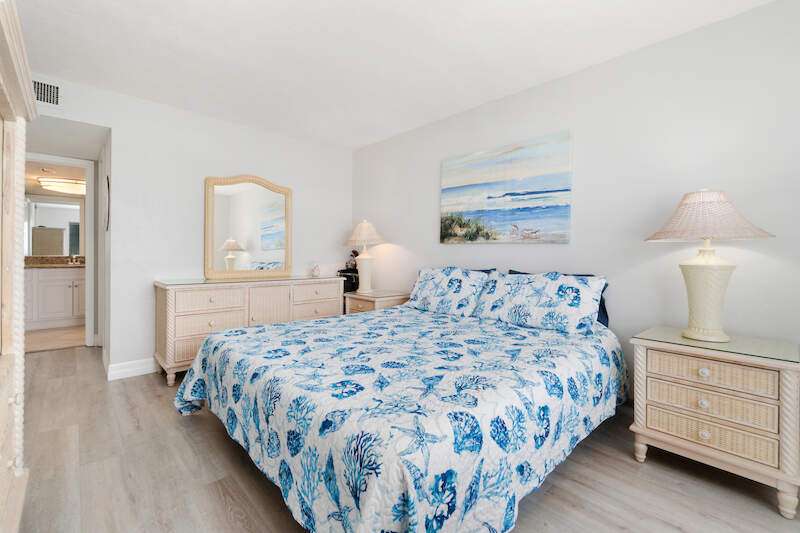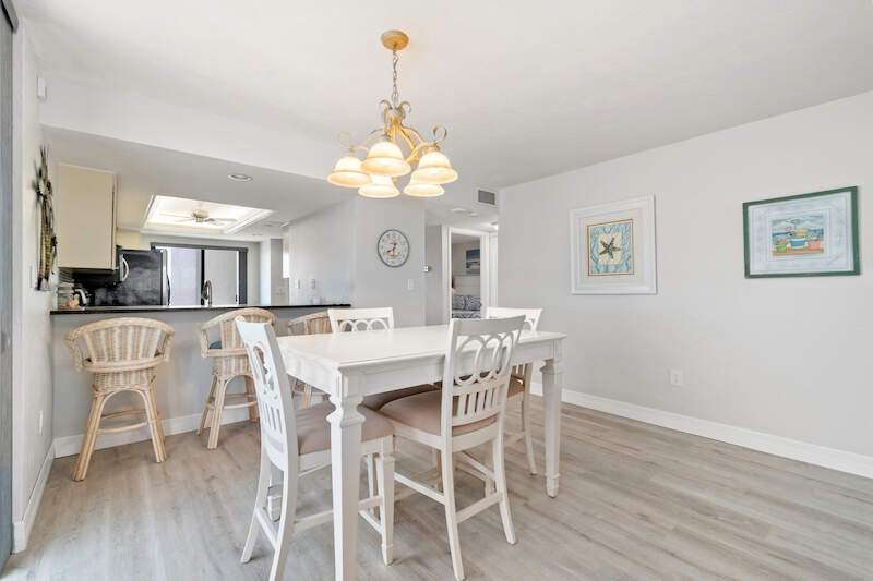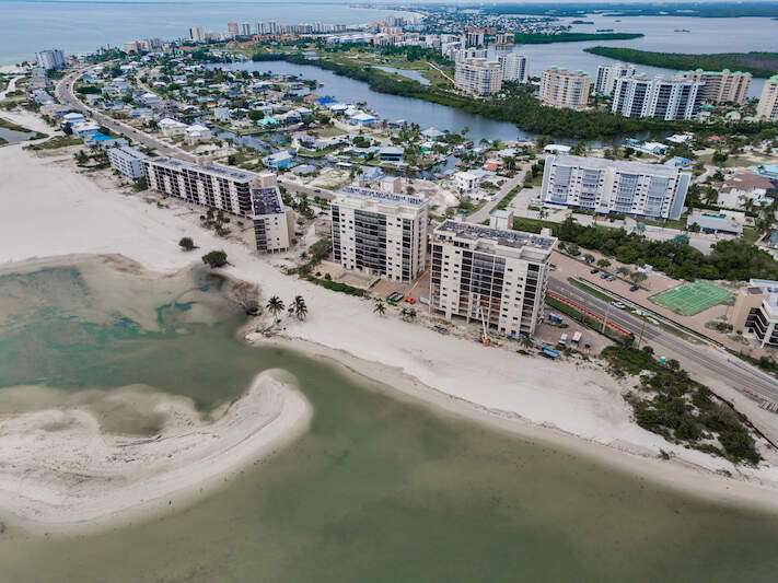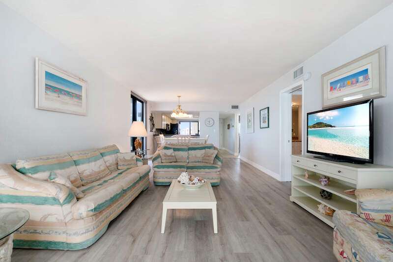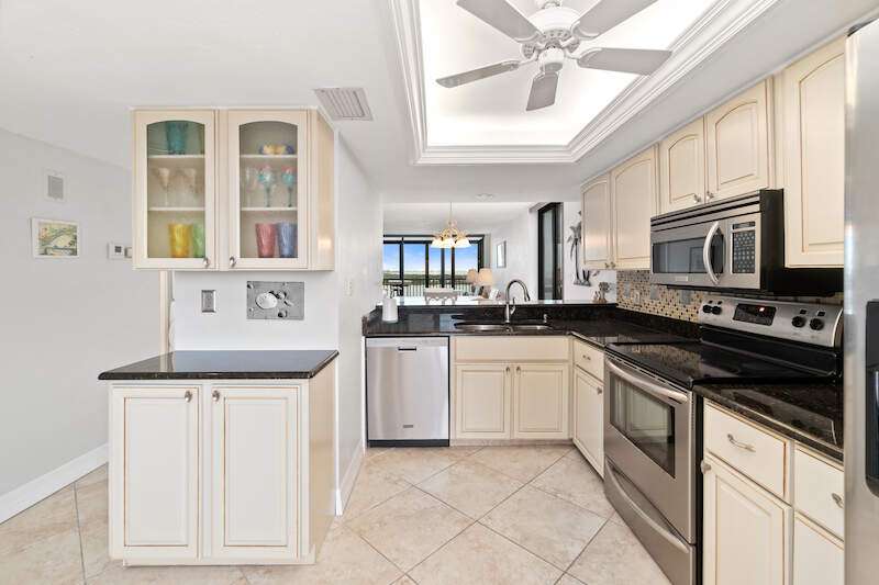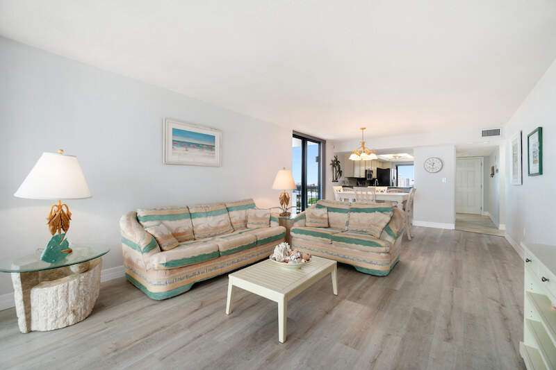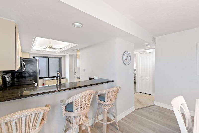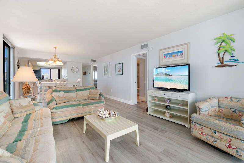 Beautiful 8th-floor beachfront END-UNIT with spectacular Gulf, Inlet & Bay views on the peaceful South End of Estero Island! This 1082 sq ft coastal retreat is finely appointed with 2 beds/2 baths, an inviting open floor plan, hurricane impact windows, new HVAC (Dec 2021), and tile and laminate flooring throughout. Enjoy some of the best views on the island- from breathtaking sunsets over the Gulf of Mexico on your spacious lanai to serene sunrises over the bay. The screened lanai offers a 270+ degree view and NEW hurricane impact glass sliders, providing the flexibility to be an enclosed sunroom or an open-air retreat when you want to soak in the soothing sounds of the surf. The kitchen is designed for both beauty and functionality, showcasing light custom cabinetry, granite countertops, stainless steel appliances, tray ceiling with accent lighting, and extra counter space and cabinets for storage. Retreat to the primary bedroom, where you'll find private access to the lanai, stunning Gulf views, a walk-in closet, and a generous bathroom. This unit includes a parking space and an extra storage room on the same floor as the unit for your convenience. Islands End offers resort-style amenities, including two community pools, a spa, BBQ grills, tennis/pickleball courts, kayak storage, a fishing pier, and a community room. Since Hurricane Ian, Islands End has undergone several million dollars worth of repairs and improvements. SIRS compliance for the building was completed November 2024. The reserve study has been completed and approved. Islands End is perfectly situated close to Big Carlos Pass providing easy access to Lovers Key and Bonita beach. Experience the perfect blend of relaxation and recreation in this exceptional beachfront retreat!