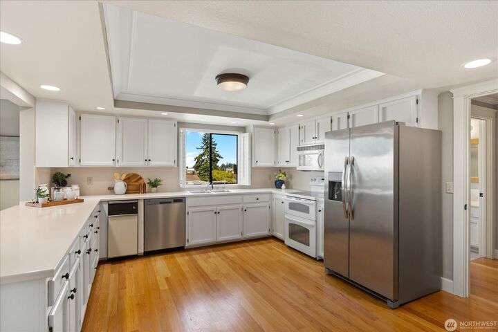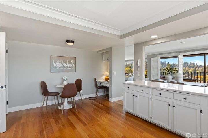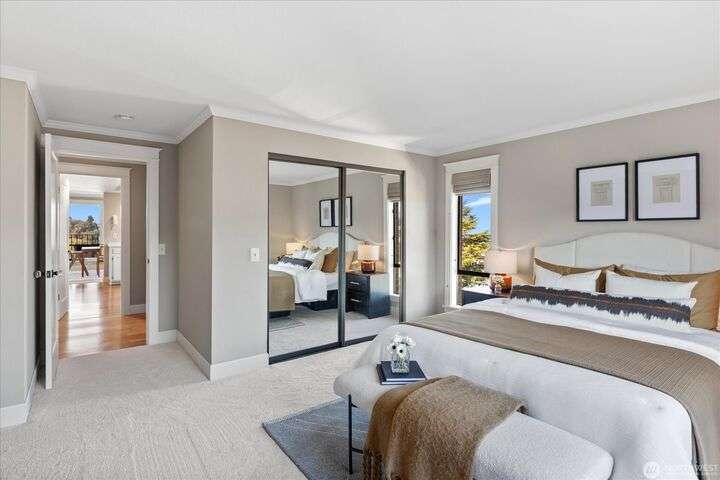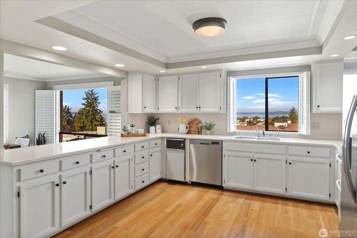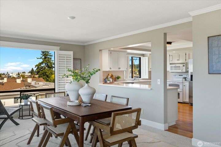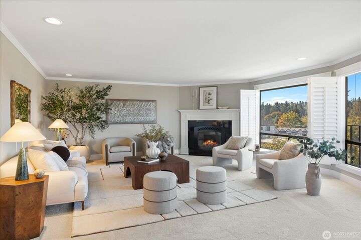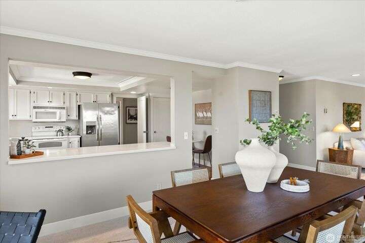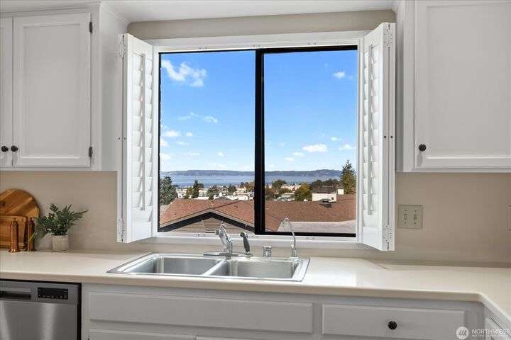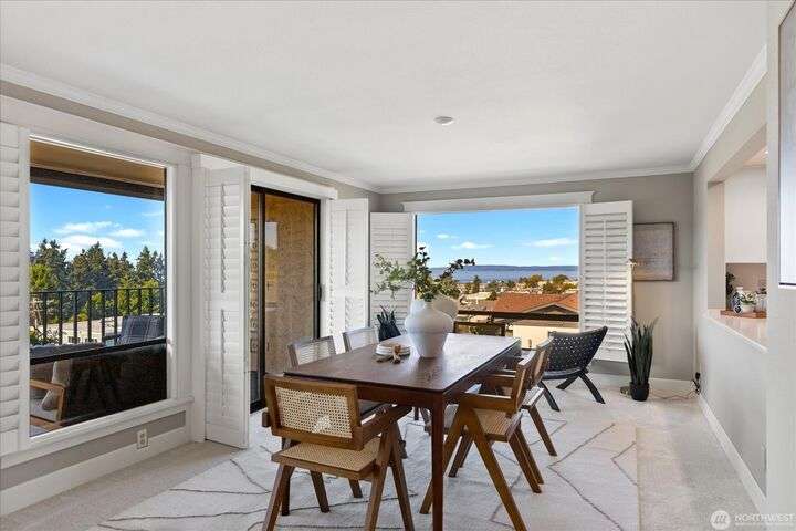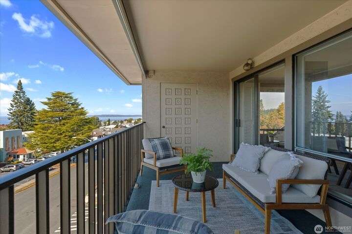 Enjoy the ultimate in Edmonds living from this sprawling top floor condo w/ stunning northly & westerly water & mtn views including Mt Baker! No power lines to distract! Hop the Sounder train or bus for a peaceful ride to Seattle or stroll easily to multiple eateries & boutiques. A beachfront community like no other! Here's the next chapter you've been contemplating; Saturday markets, art walk, festive events & activities all year round. Or, simply settle in & savor the changing waterscape day in & day out...you will never tire watching storms roll in & shipping lane activity from your large, covered deck or inside in front of the fire. 0 stairs access, primary suite w/ attached bath & massive walk-in closet. 2 covered pkg & 2 storage rooms