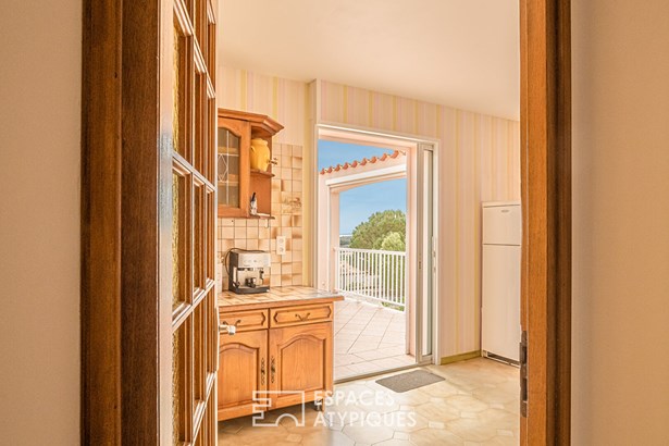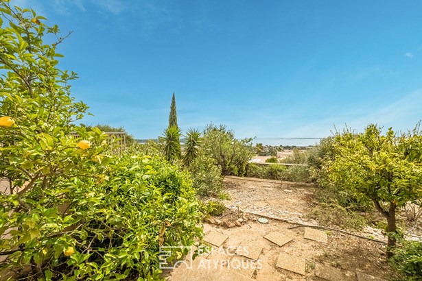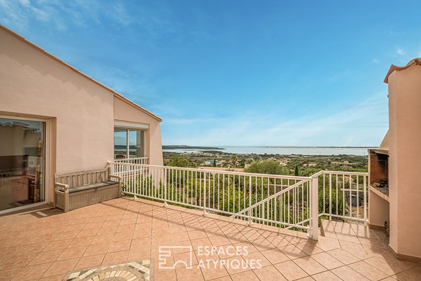 Built on a swimming pool plot of approximately 700 m2, in a dominant position facing the ponds and the Mediterranean Sea, this 80s villa offers a breathtaking panorama in a privileged setting! As soon as you enter the living room, a space bathed in light, with a beautiful high ceiling, your eye is drawn to the sparkling picture of the blue of the ponds and the sea. The sliding door of the living room provides access to a suspended terrace, offering a panoramic view, inviting you to contemplate the sunrises over the sea.