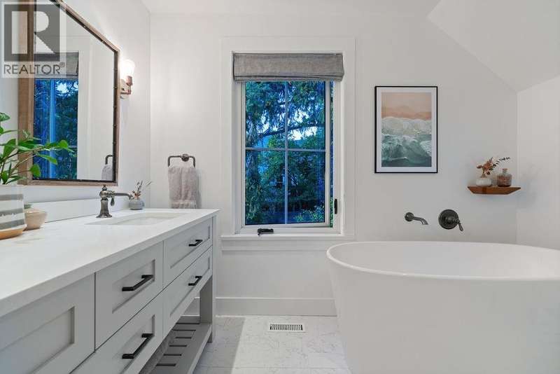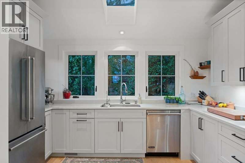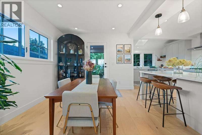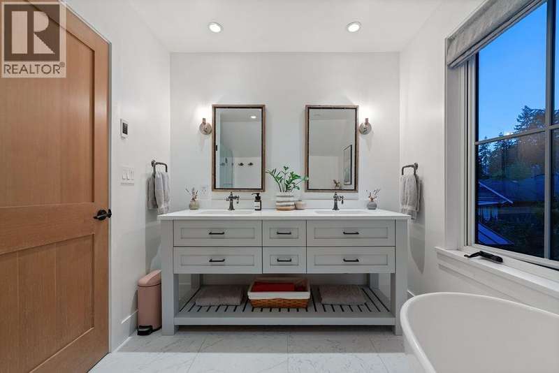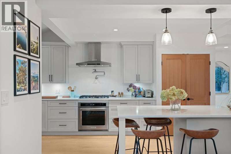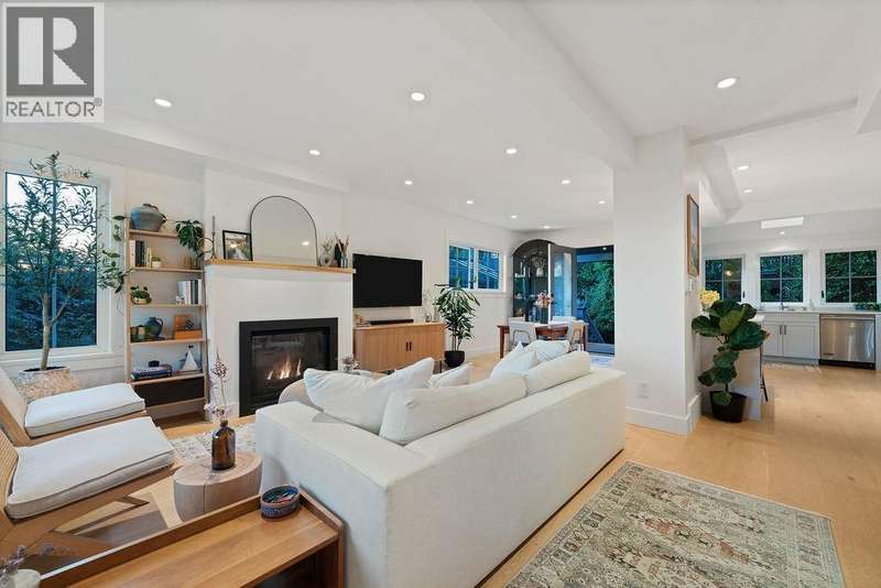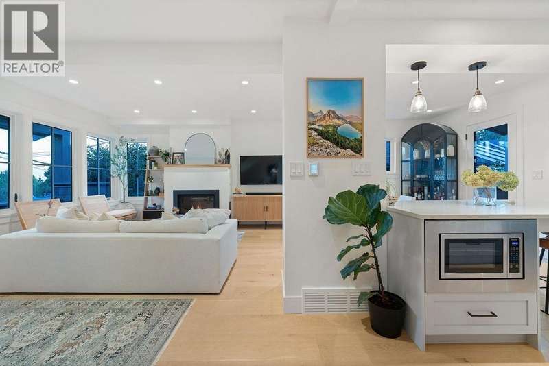 This extensively renovated home has been meticulously upgraded over the past 8 years, with nearly every component renewed-plumbing, electrical, insulation, drywall, windows, cedar shingle siding, and high-end custom finishes throughout. Inside, it features engineered wide-plank white oak flooring and heated polished concrete on the lower level. A Rinnai on-demand hot water system and air-handling furnace provide year-round efficiency and comfort. The kitchen is a showstopper with solid maple millwork, stone countertops, a large island, and premium KitchenAid and Viking appliances. The spa-like primary bath includes NuHeat in-floor heating, a frameless glass shower, stone soaker tub, and a bespoke double vanity. Enjoy panoramic ocean, city, and English Bay views from multiple sun-drenched decks. The lower level offers suite potential with its own kitchen, bath, and entry. A drivable grass driveway, new LG laundry, lush landscaping, and carport complete this exceptional property. (id:58403)