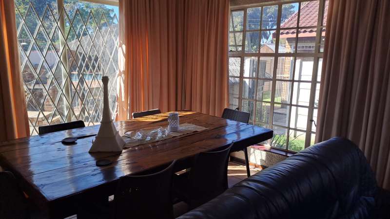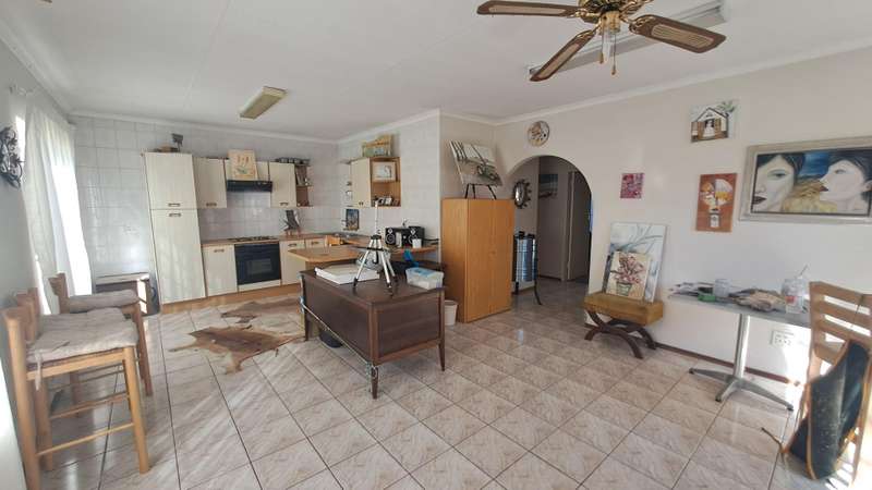 There is a formal lounge as well as an additional small lounge that leads into a cozy family lounge with JMW Jetmaster and open plan Dining Room. The kitchen has a gas / electric stand-alone stove as well as an electric hob and eyelevel oven. Small scullery area for refrigerator and packing space.