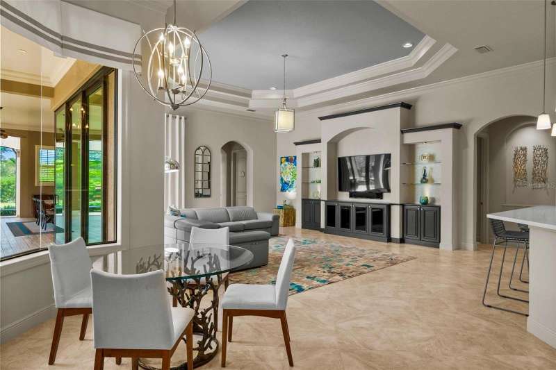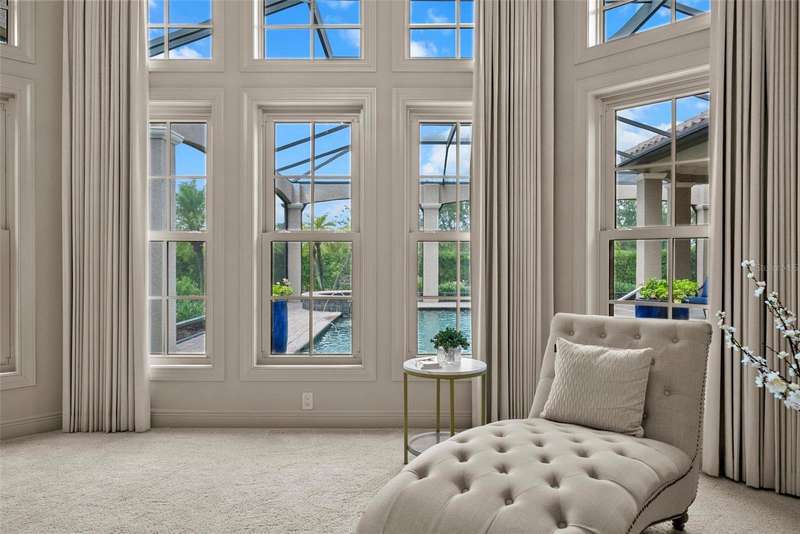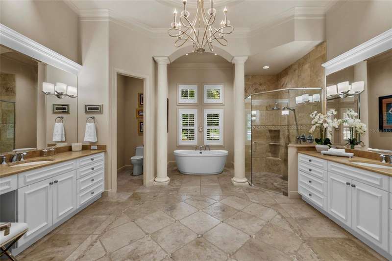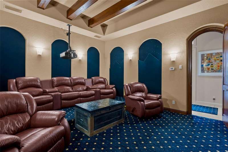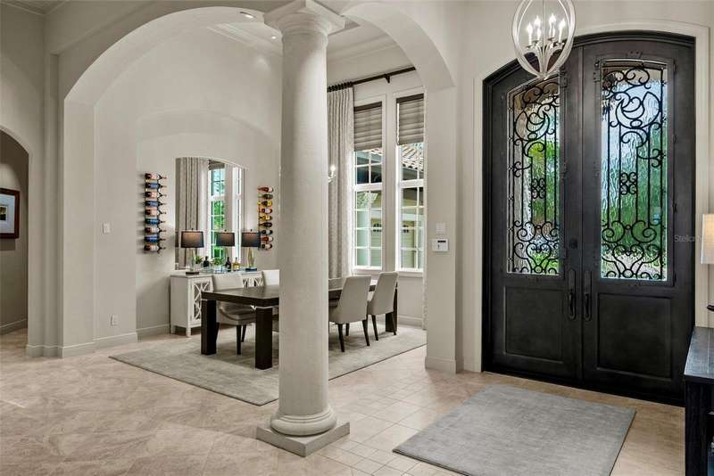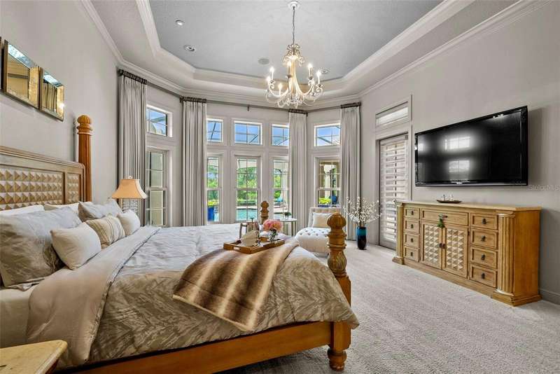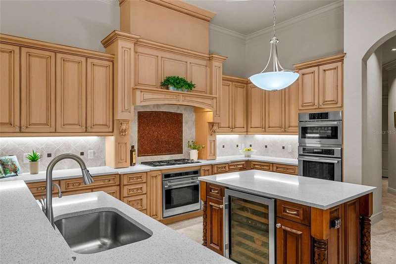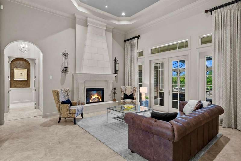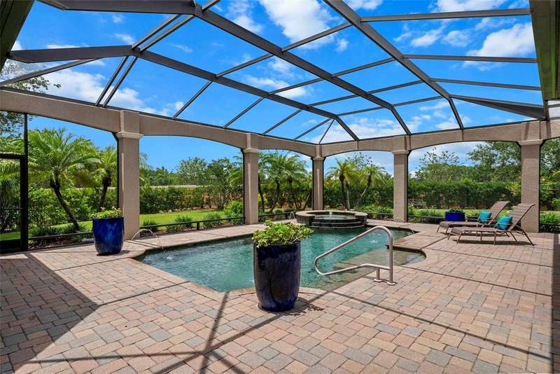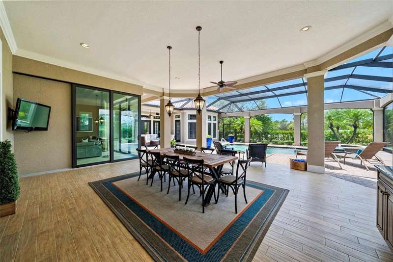 This spectacular Lakewood Ranch Country Club residence built by John Cannon—offering three bedrooms and three-and-a-half baths—is perfectly situated on an estate-sized corner homesite of more than three-quarters of an acre, surrounded by pristine gardens and lush landscaping. Upon arrival, you’re greeted by magnificent iron doors that open into a grand, open-layout living area where tray ceilings, crown moldings, and beautiful French doors frame a dramatic floor-to-ceiling stone fireplace, setting a tone of refined elegance. The gourmet kitchen is both beautiful and functional, boasting striking wood cabinetry, gleaming quartz countertops, and high-end appliances that include Wolf and Thermador ovens, a Sub-Zero refrigerator, and a built-in wine cooler. Whether you’re preparing a casual meal or hosting an elaborate dinner party, this kitchen delivers performance and style in equal measure. Entertainment reaches new heights in the state-of-the-art home theater, where a 128-inch curved masking screen by Stewart Screens, 4K Sony projector, and invisible in-wall Klipsch surround-sound system immerse you in every scene, while plush leather recliners ensure ultimate comfort. When it’s time to unwind, the expansive master suite awaits, complete with custom closets and a spa-inspired bath featuring a frameless glass shower, deep soaking tub, and dual vanities. Two additional guest suites, each with their own private bathroom, offer luxury and privacy for visitors. Step outside to discover a 2,200-square-foot screened lanai laid in gorgeous wood-look tile planks, where a saltwater pool and spa invite refreshing dips and relaxation. An outdoor kitchen provides the perfect backdrop for alfresco dining and social gatherings. Meticulous construction details—including foam insulation, a Generac backup generator, and LED lighting controlled by an integrated Crestron smart home system—ensure comfort, efficiency, and peace of mind. The climate-controlled third garage adds practical convenience, rounding out a home that truly defines country club living at its finest....