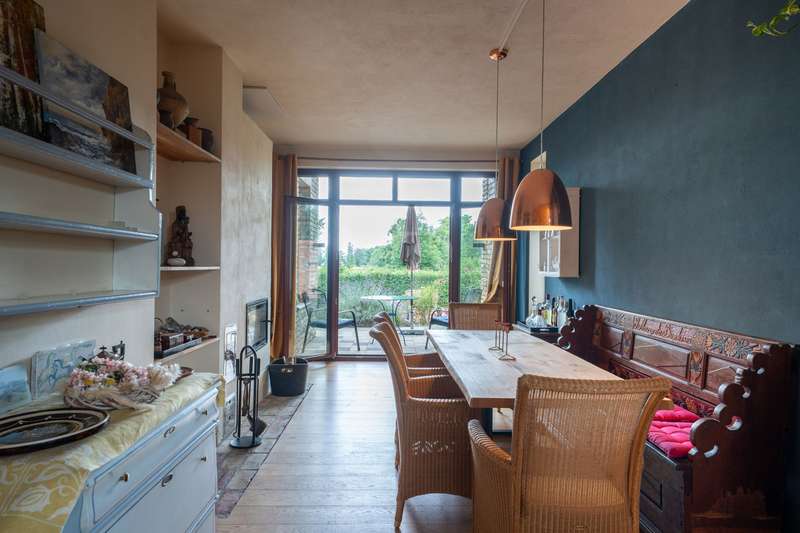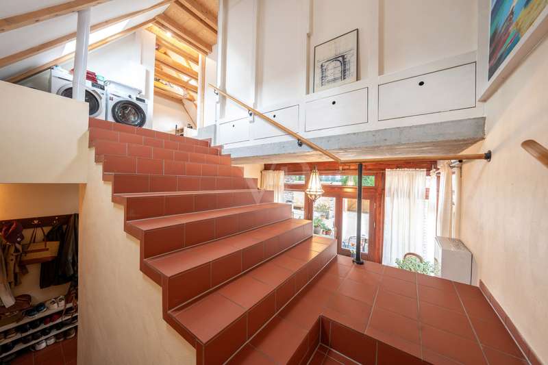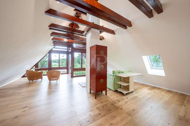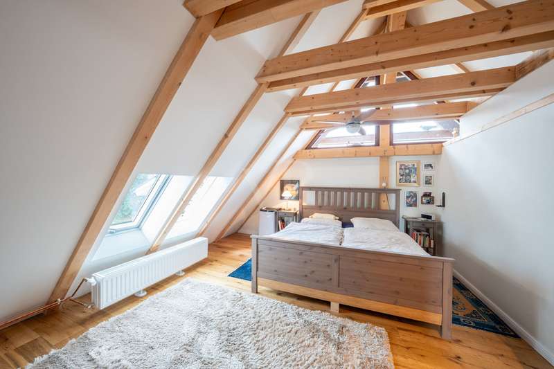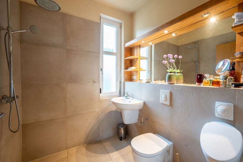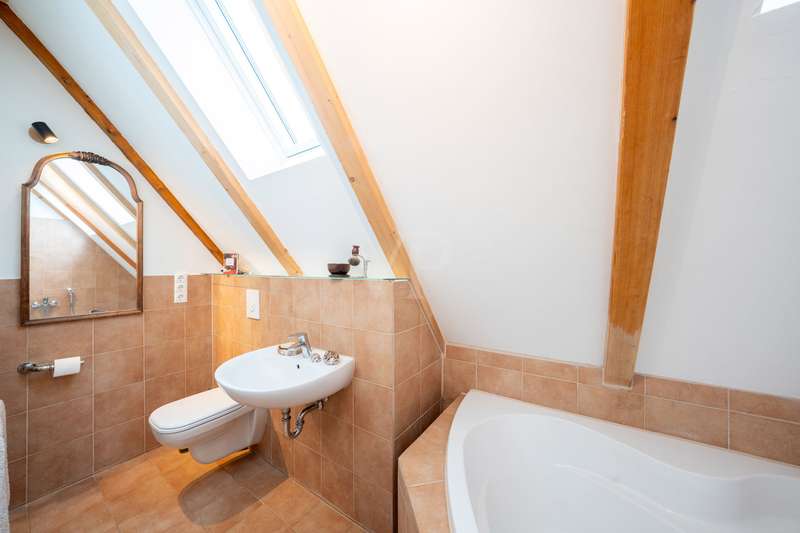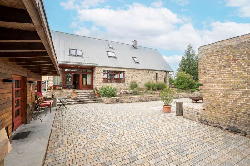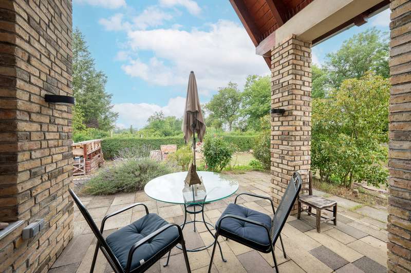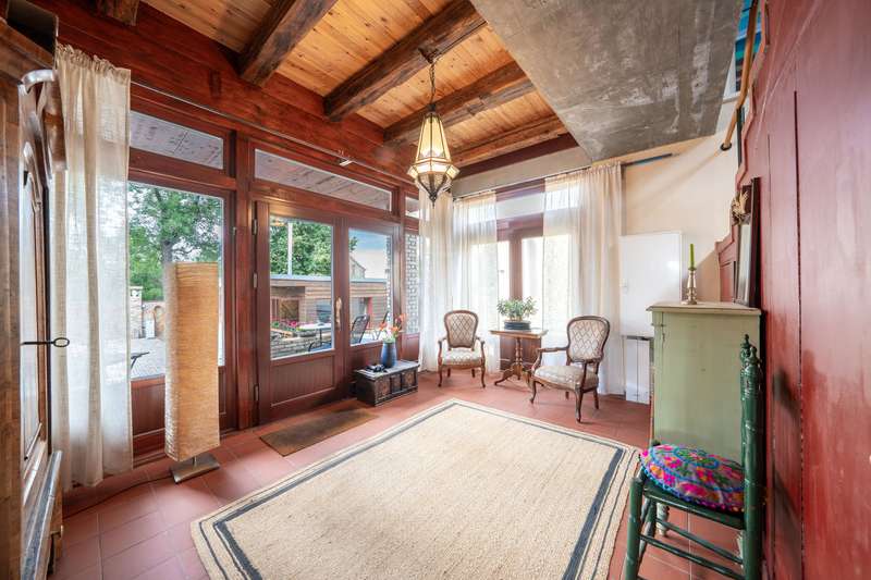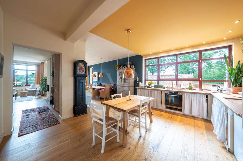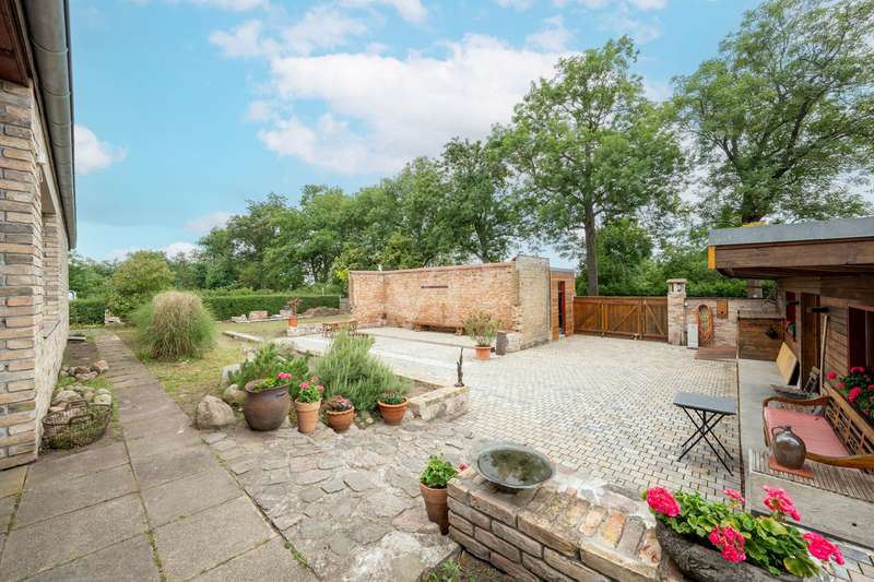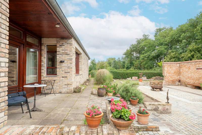 This impressive 923 m² courtyard and garden property is just a 25-minute drive south of Berlin and Potsdam. Nestled in the protected Nuthe-Nieplitz nature park, it offers a peaceful, natural environment. The location creates a fascinating contrast to the urban density of the cities and invites you to enjoy nature in all its beauty. A place that combines peace, nature and space. From the street, you enter the property via a paved entrance courtyard, which was designed in the style of the historic three-sided courtyards in the neighborhood. This is reflected in the courtyard development and the building materials used. A wide fieldstone staircase leads up to the main house, which was built about one meter above the ground to enhance the sweeping views of the landscape. This exceptional architect-designed house, which was built in 2017, harmoniously combines modern construction quality with traditional elements and impresses with its high-quality workmanship and flexible floor plan. With around 183 m² of living space and around 90 m² of usable space, this property offers plenty of room for individual living, working and development. The solidly built house combines modern energy efficiency with charming details. Energy efficiency class A ensures low operating costs, while inside, a harmonious blend of historic wooden beams and exposed concrete in the ceilings creates a special atmosphere. Large windows with triple glazing and shutters allow plenty of light into the home. The south-west orientation makes it possible to experience the changing rhythm of sunlight in a subtle way. Sustainable energy is provided by a solar thermal system, underfloor heating and a double-sided wood-burning stove, which can optionally provide additional heat via an adjustable opening in the attic. A fiber optic connection is available. The heart of this house is the first floor with its spacious open-plan living and dining area, which flows seamlessly into the terrace and garden. There is also a small home office, a barrier-free shower room, a timeless kitchen and a practical kitchen pantry. Warm real wood oak floorboards and clay plaster on the ceilings and walls create a cozy atmosphere. A wide staircase takes you to the top floor, which impresses with its exposed carpentry. Here you will find two loft rooms for living and sleeping, a dressing room, the utility area and a bathroom with bathtub. The offset timber and glass façade also offers a wonderful view of the unobstructed landscape. The space on offer is complemented by an approx. 60 m² heated coach house, which can be used as an office, guest house, sauna or fitness room, as well as an approx. 30 m² workshop, which serves as a utility building or cellar replacement room. The well-kept outdoor area is lovingly landscaped: The so-called "ruin courtyard" with seating walls and a U-shaped brick wall serves as a wind-protected retreat and is complemented by a small, sheltered patio courtyard as well as covered alcoves that can be used for both sunny and shady stays. The property boundary is bordered by historic brickwork, hedges and a picket fence. Exterior lighting with motion detectors creates a cozy atmosphere, while roof drainage is provided by two retention and soakaways in the courtyard and garden area. There are also two garden water connections. There is ample space for vehicles and there is the option of building a large carport. This house harmoniously combines old and new, high-quality craftsmanship, authentic materials and modern living quality. It is a home with character and a wide range of possible uses, which impresses with its special atmosphere and individual design.