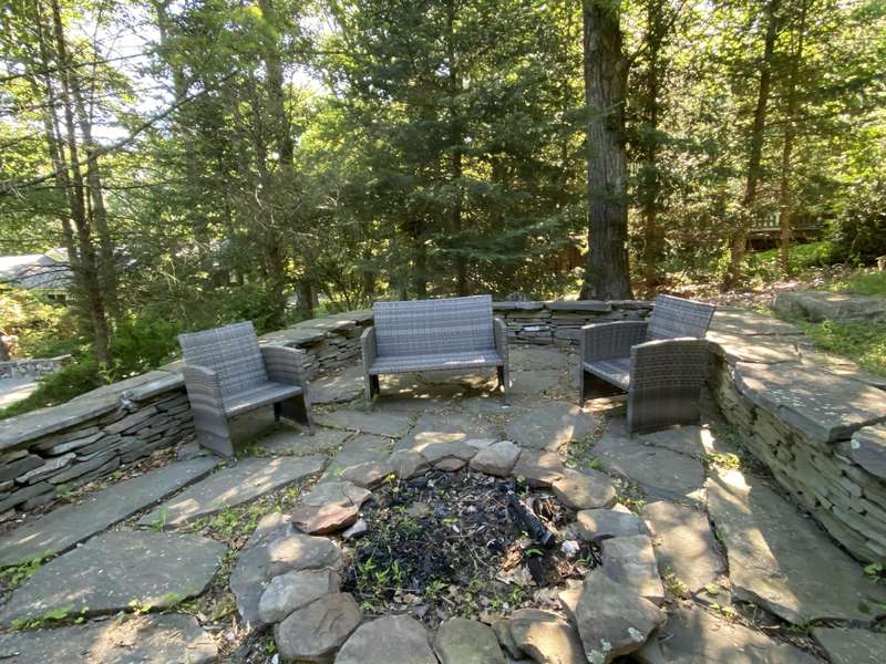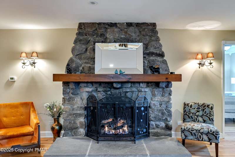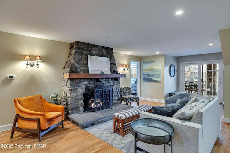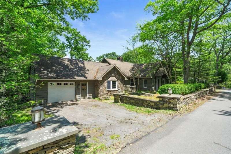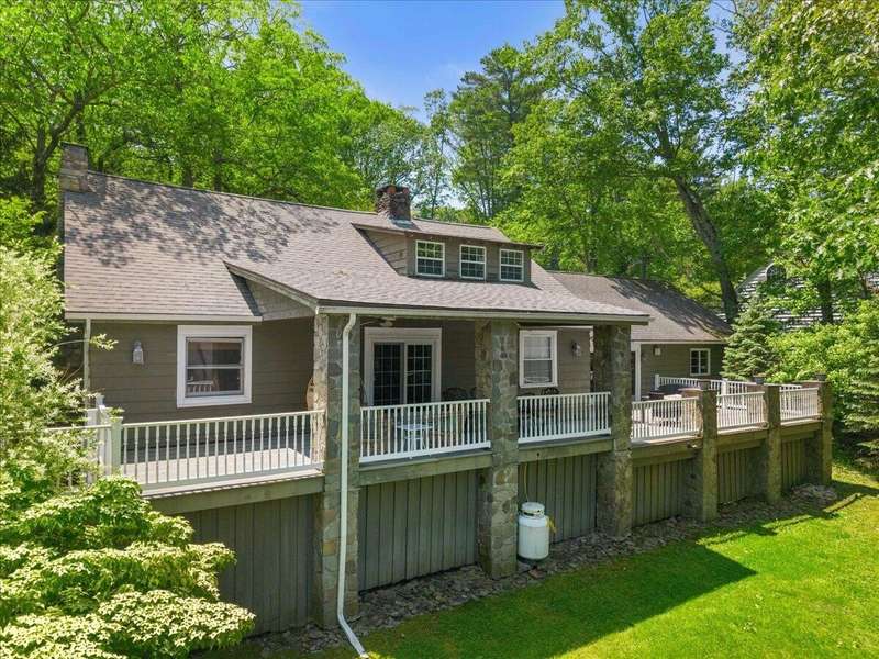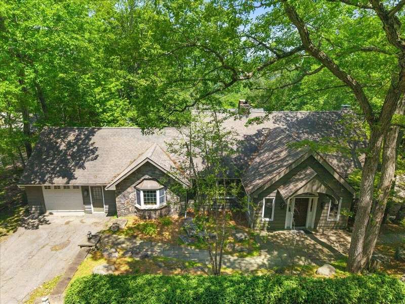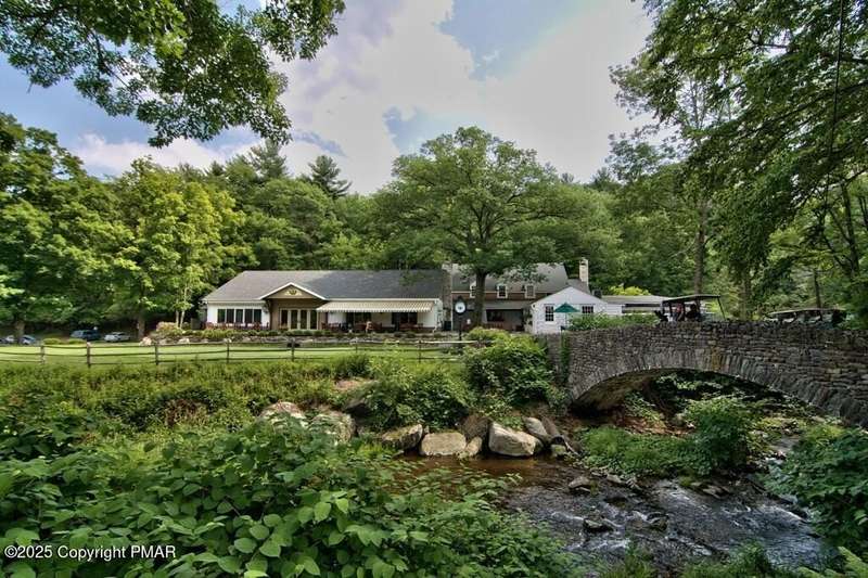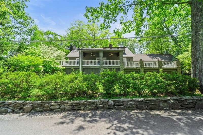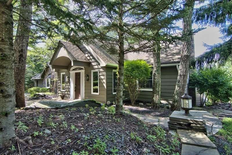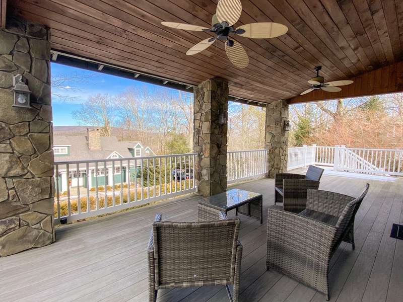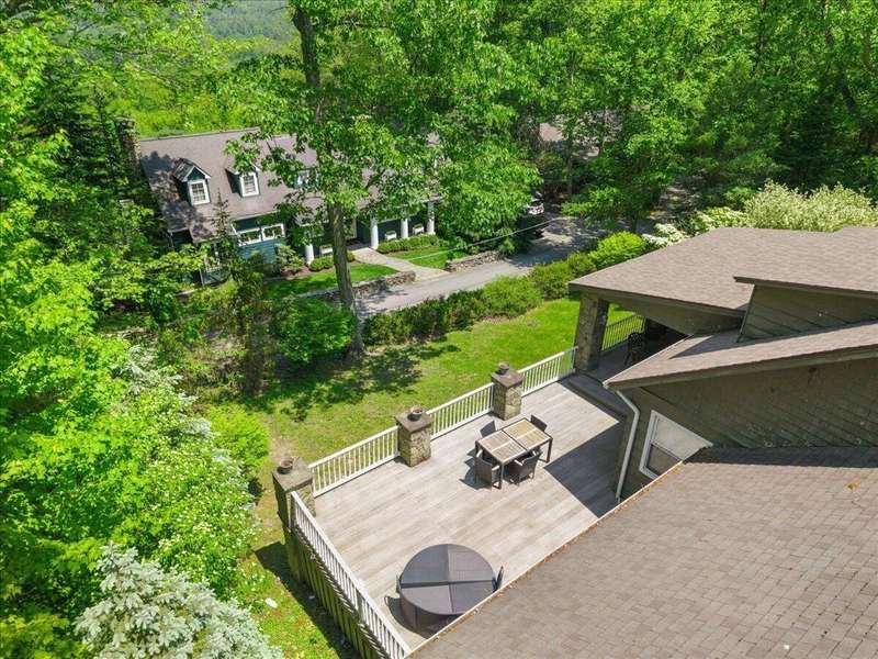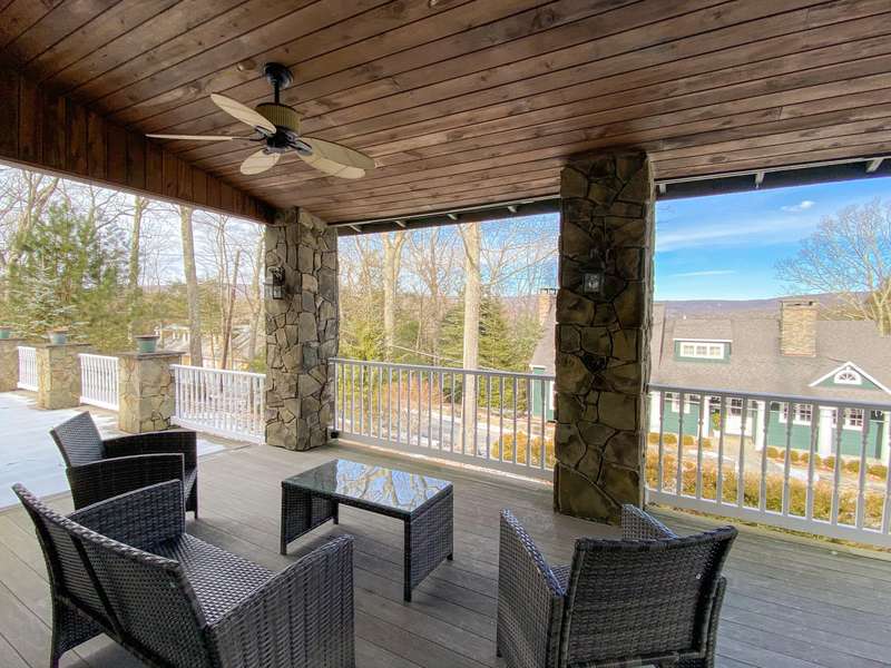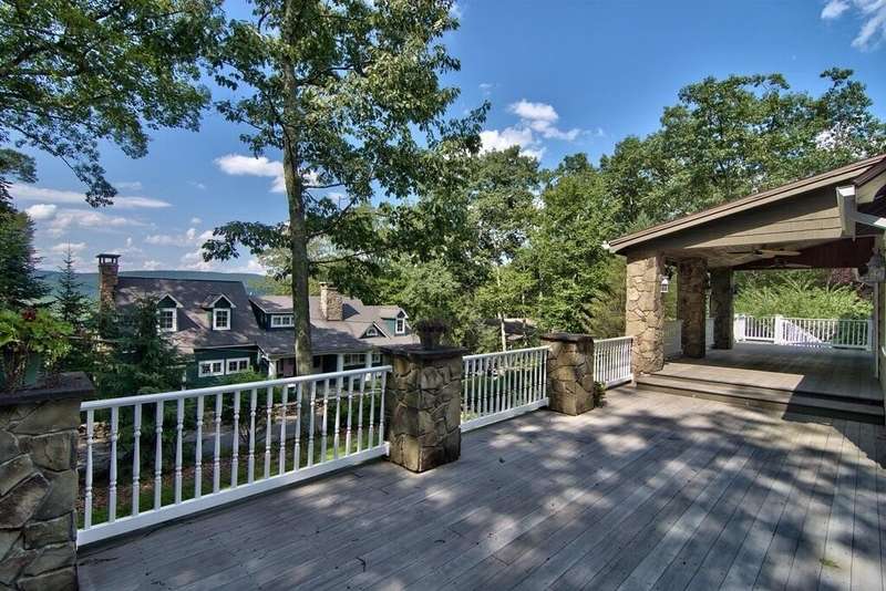 This spacious home in historic Buck Hill Falls has charm, character and Mountain Views. Both the main living room with native stone fireplace and huge great room with vaulted ceiling open to a large covered porch and open deck with far-reaching mountain views. The kitchen has been remodeled and features granite countertops and stainless appliances. There are 4 bedrooms, including one on the first floor with full on-suite bath. There are 2 more bedrooms on the 1st floor and a beautifully tiled full bath. The entire 2nd floor is the master suite with tray ceiling, built-ins, dressing room and an open master bath. There is a 1-car garage and incredible landscaping w/stone walls, terraces, stone bar, fire pit, and mature plantings. Perfect vacation or primary home in resort community.
