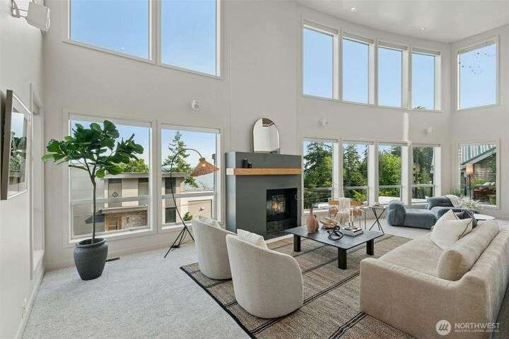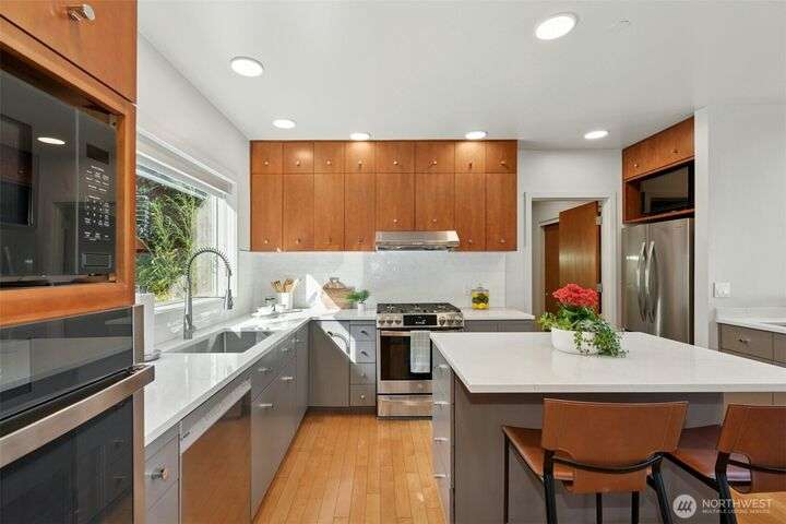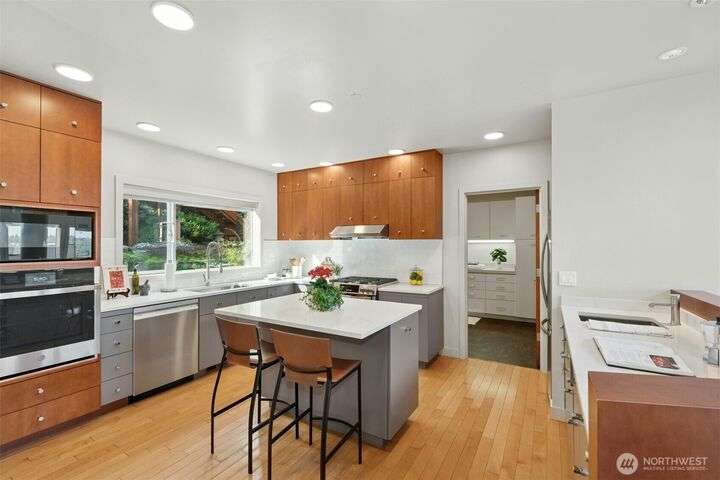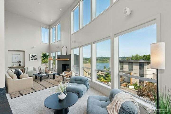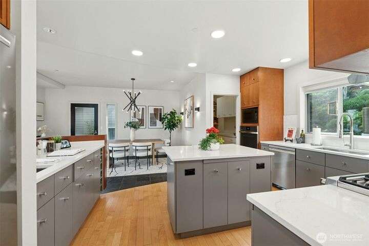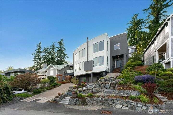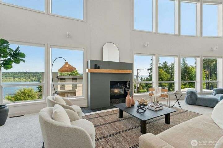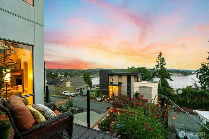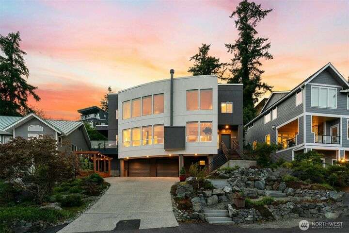 Immaculate contemporary sitting above Juanita Bay w/spectacular views of Mt Rainier, Bellevue skyline, & Lake WA! Built in 1997, this newly updated 3,290 SF, 4 BD, 2.5 BA home feat 2 story living room w/walls of glass framing lake & mtn views. Chef’s kitchen w/new quartz counters, walk-in pantry & wet bar. Elegant dining room flows out onto view deck. Primary BD w/private view balcony, walk-in closet & 5-piece BA. Lower level feat bonus room/gym, 2nd pantry & 2-car garage. Lush professionally landscaped backyard w/deck & built-in seating areas. Updates include new carpet, interior & exterior paint & new BAs. Access to private beach. Just steps from Juanita Village, 5 mins to downtown Kirkland & I-405. Don’t miss this incredible opportunity!