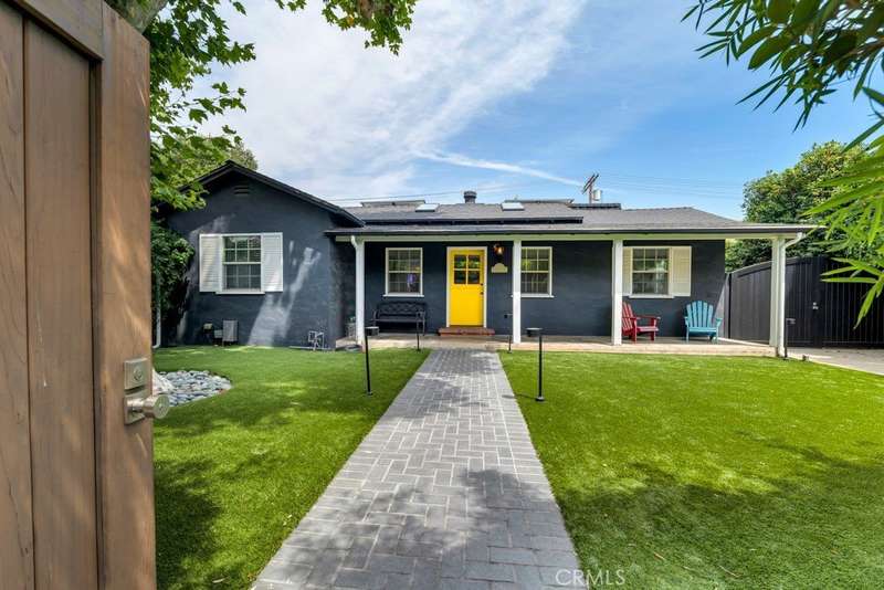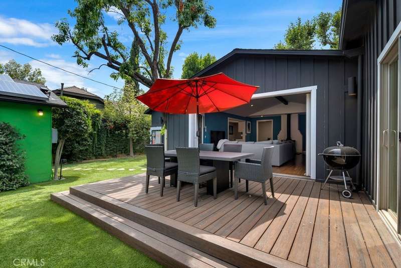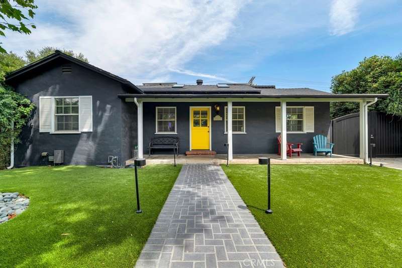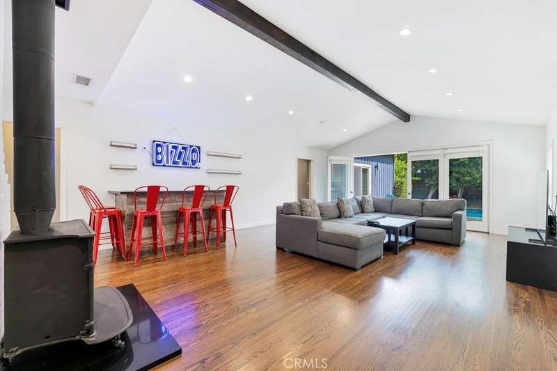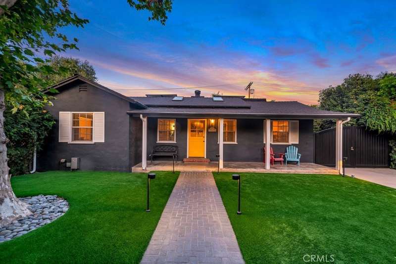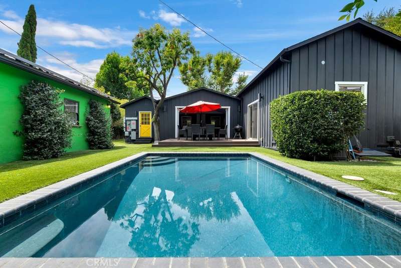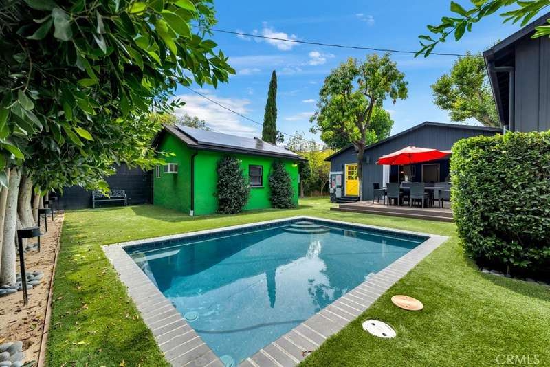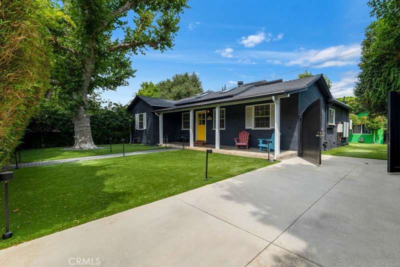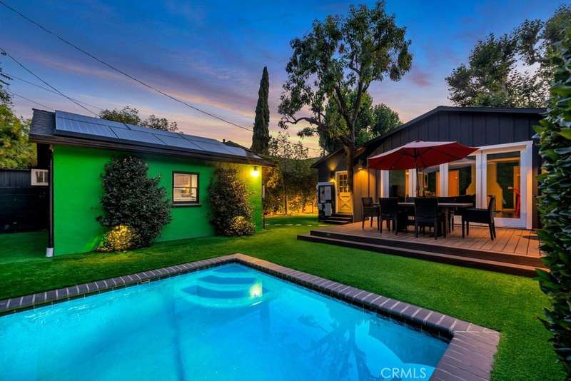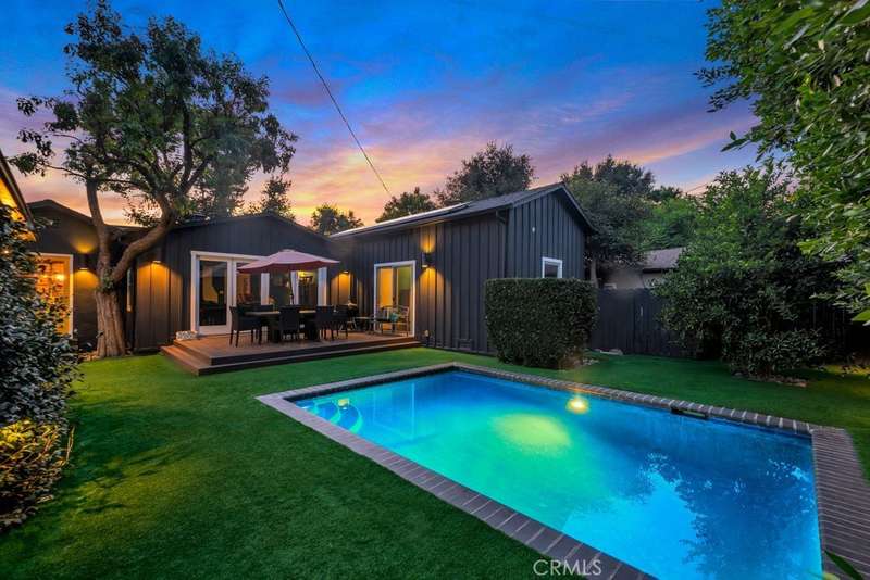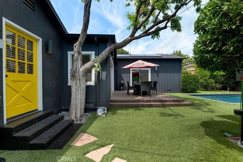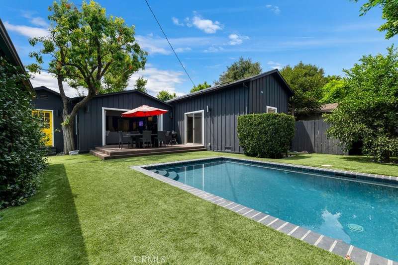 This stunningly renovated and expanded 3-bedroom, 2-bathroom home is a true masterpiece! With its soaring vaulted ceilings and open, airy layout, this residence showcases top-notch finishes and exceptional indoor/outdoor living. A charming Dutch door welcomes you into the cozy formal living room, featuring a sophisticated stone fireplace as its centerpiece. The seamless flow of the open-concept design leads you effortlessly into the dining area, which is beautifully highlighted by a striking architectural light fixture. The contemporary kitchen is a chef's dream, complete with custom cabinetry, quartz countertops, a Wolf range, and high-end stainless steel appliances. The newly designed master suite is a luxurious retreat, featuring a spacious walk-through closet and an ensuite bathroom adorned with premium finishes such as Waterworks tile, bespoke cabinetry, and elegant European fixtures. The airy great room is accentuated by large modern bi-fold doors that open up completely to reveal a brand-new deck and an exquisitely landscaped backyard. The outdoor space boasts a heated saltwater pool and a Studio ADU equipped with its own full kitchen. Additionally, the property is outfitted with fully paid-off Tesla solar panels and two Tesla batteries, enhancing its energy efficiency. This incredible opportunity is not to be missed!