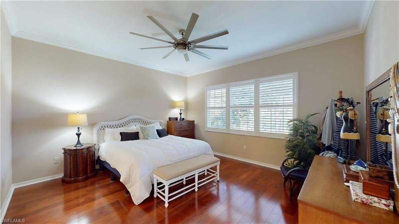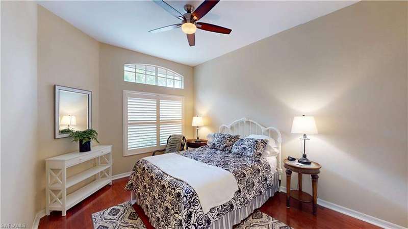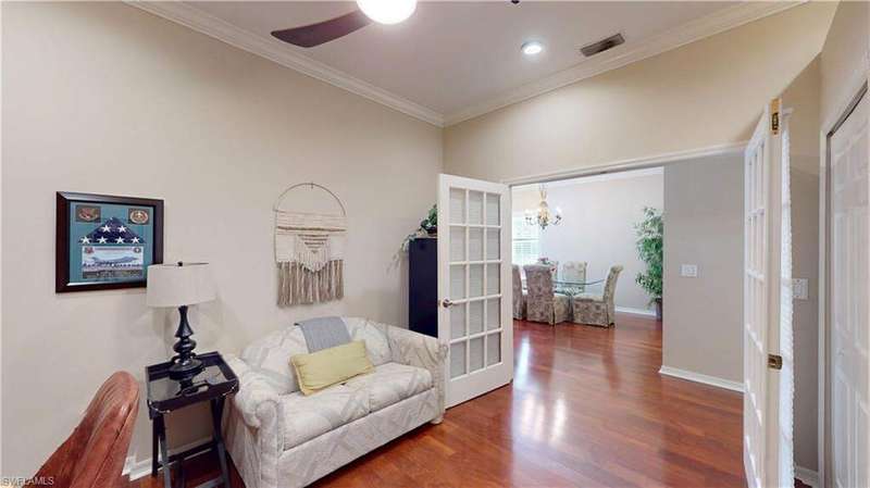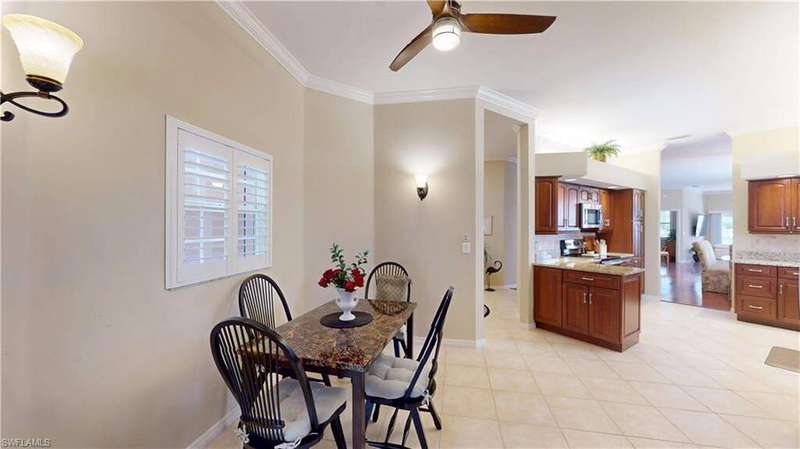Welcome to this charming 2-bedroom, 2-bathroom villa with a den, perfectly situated with a serene view of the Cypress Lake Golf Course. This home features tile and laminate flooring throughout, offering a sleek, low-maintenance appeal. The kitchen is a chef's dream with beautiful granite countertops, stainless steel appliances, and an inviting eat-in kitchen area. The guest bath includes a convenient tub-shower combo. The spacious master suite boasts an ensuite bath with dual sinks, a garden tub, walk-in shower, and a large walk-in closet. The den, with French doors, features a built-in desk area and a closet, offering a versatile space for work or relaxation. Step outside through French doors to the screened-in patio and enjoy the stunning golf course views. This home is complete with crown molding throughout, electric and manual shutters for added protection, and a two-car garage. This community is close shopping and entertainment including the beaches and the historic downtown area,, Experience comfort, convenience, and luxury in this beautiful villa!
