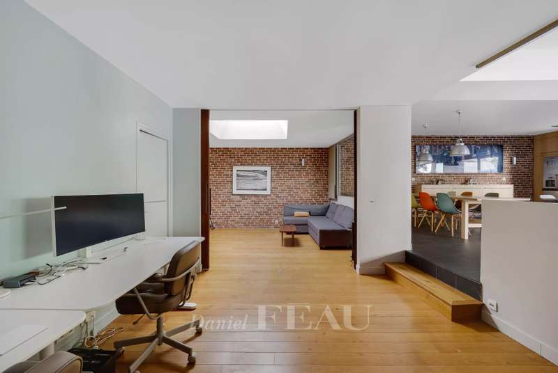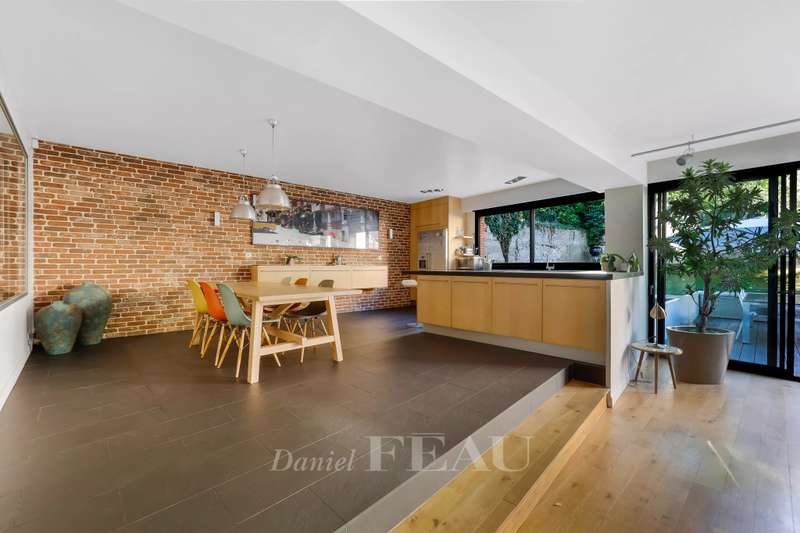This exceptional 191 sqm loft-style apartment is on the garden level of a recent building set back from the street and near the shops, the schools and the station in the heart of old Viroflay. West-facing and particularly bright, it includes a superb 75 sqm living/reception room with an insert fireplace opening onto a terrace and enclosed 135 sqm garden, a fully fitted and equipped kitchen, a dining room, a master suite with an adjacent bathroom and dressing room, two bedrooms, a bathroom, a study area, and a guest bedroom. With two parking spaces.