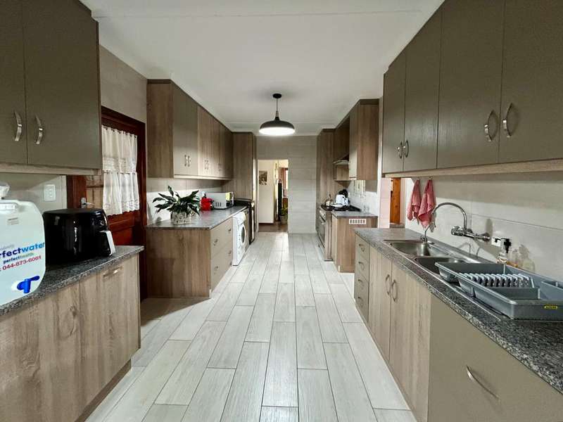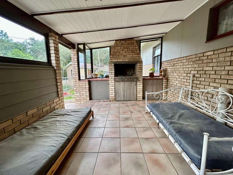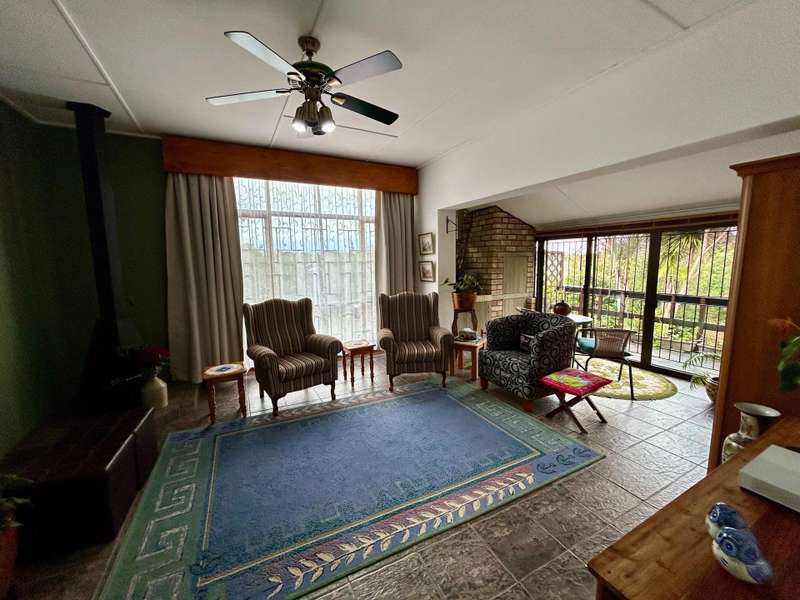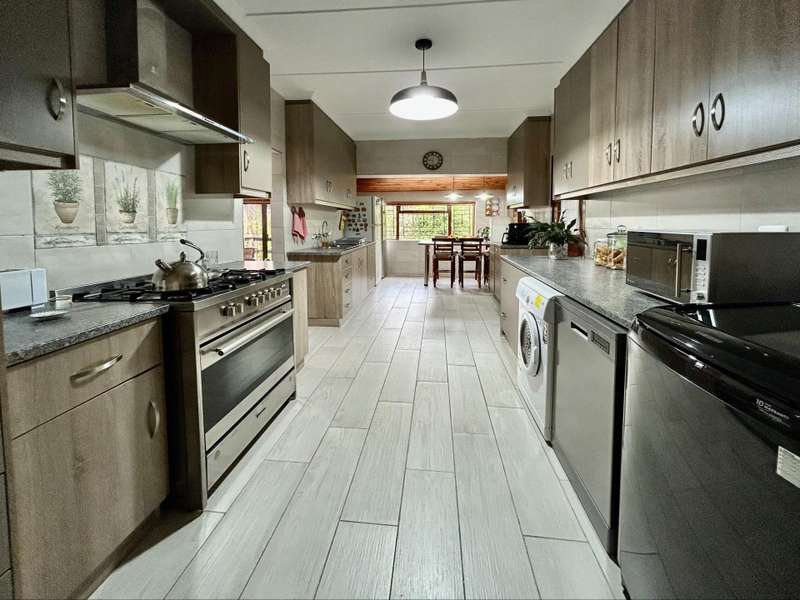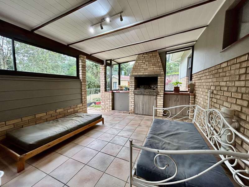 This well-kept home is a rare find, perfectly situated in a quiet cul-de-sac with peaceful forest views at the back. It offers four spacious bedrooms. The main bedroom has its own private bathroom (en-suite), while the other three bedrooms share a full family bathroom. There are several living areas throughout the house, including a cosy braai room that opens onto a wooden deck, where you can enjoy lovely views of the forest and nearby mountains. The main living area is bright and open, with a wood-burning fireplace that adds warmth and charm. The kitchen is modern and easy to use, and there's also a dining area and a second lounge, which could be used as a sunroom or reading space. Outside, the home features a neat, low-maintenance garden and plenty of space for parking, including three garages with automated doors and extra off-street parking. There's also a small garden cottage, which could be used for guests, extra storage, or as a work-from-home space.
