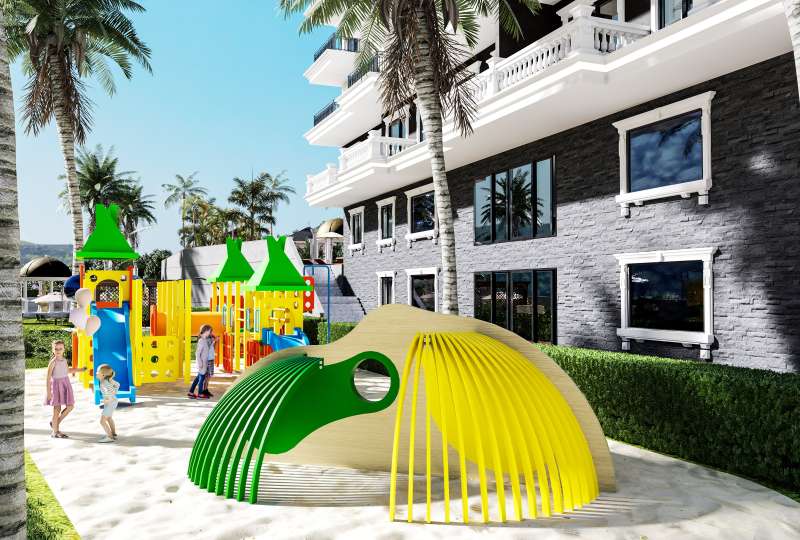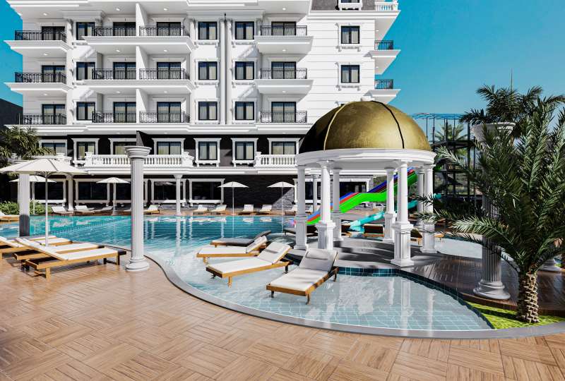 The flats for sale in Alanya, Turkey are situated in a 10-storey block. The project offers various amenities for the residents. Inside the complex, there is an outdoor swimming pool, aqua park, sunbathing areas, gazebos, barbeque areas, a sauna, a fitness center, a shock pool, and game rooms for adults and children. Additionally, the project is enriched with indoor parking, generators, security cameras, satellite TVs, and a lift.