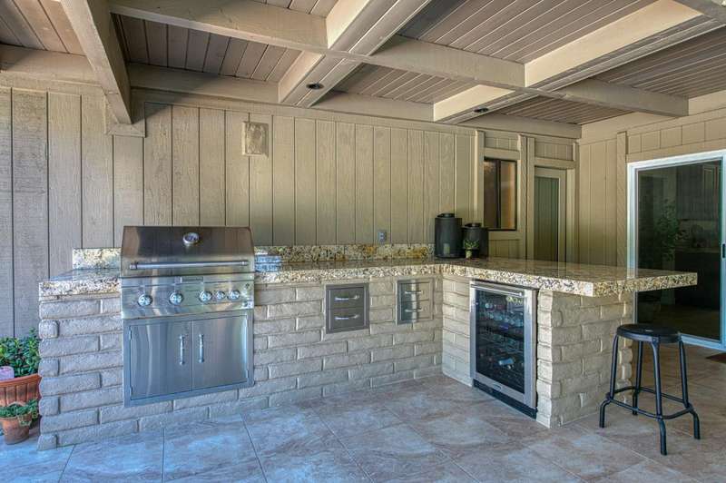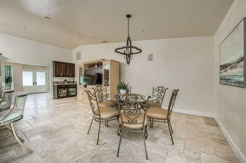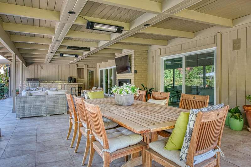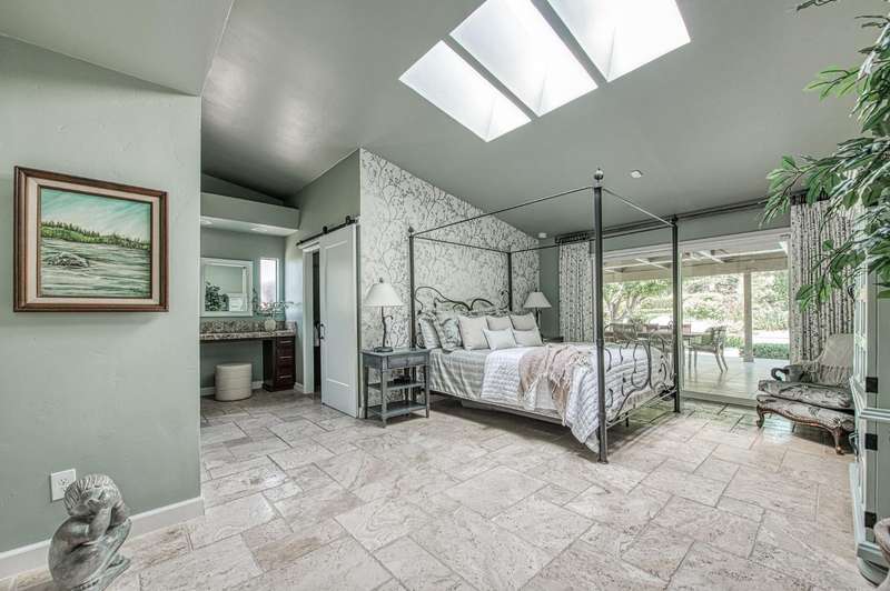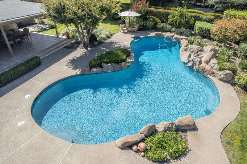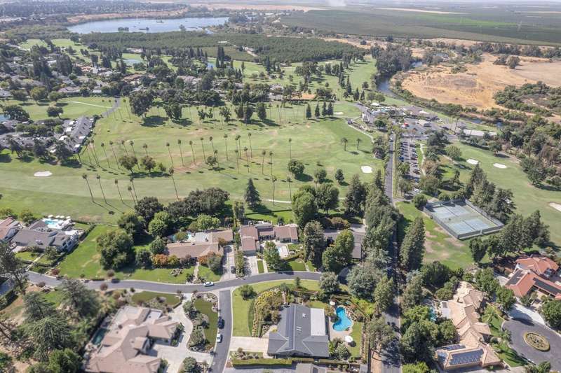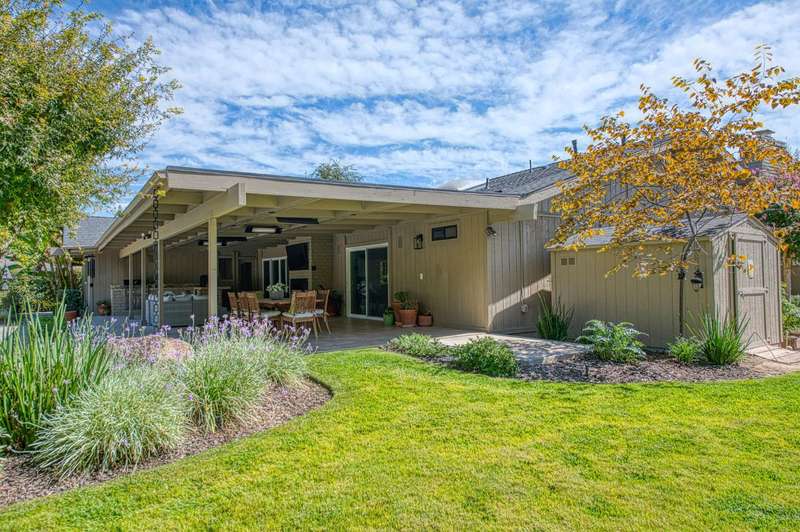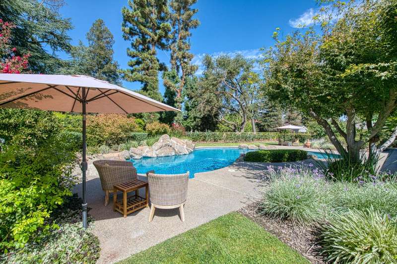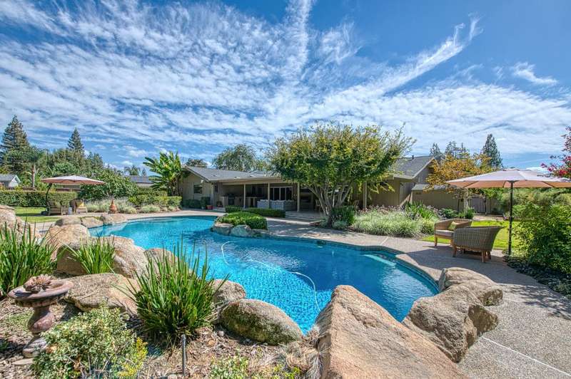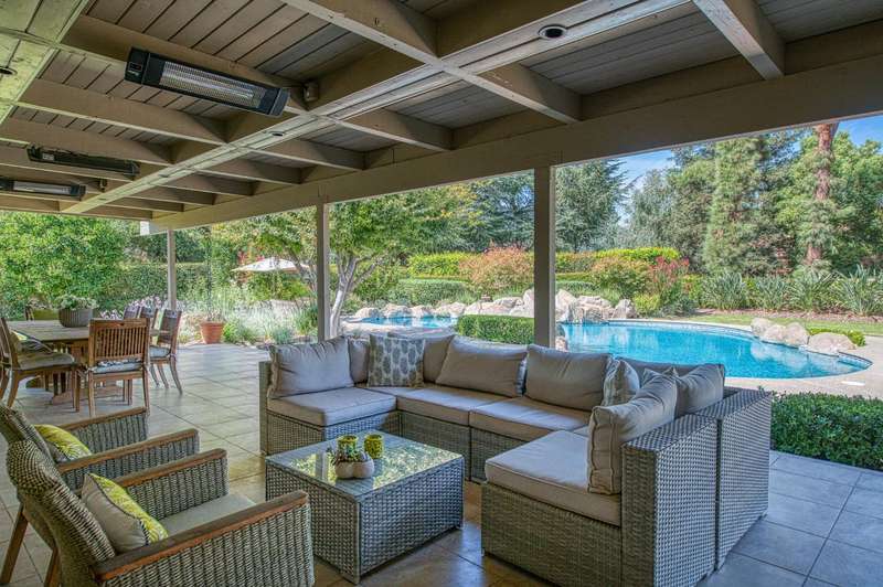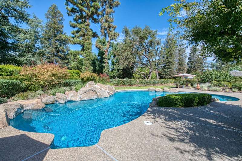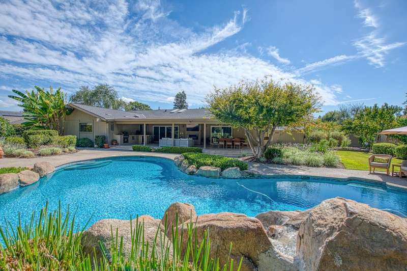 Enjoy this exceptionally updated home just steps from the San Joaquin Country Club in Northwest Fresno. Set on a beautifully landscaped lot with OWNED SOLAR, automatic irrigation, and 11 mature fruit trees (including peaches), this home is a retreat for entertaining and everyday living. Enter through the double-door entry to a well thought out floor plan with two living spaces and a formal dining room; ideal for hosting. Travertine flooring flows through the main living areas, adding timeless elegance and seamless indoor-outdoor flow. Bedrooms have large closets; the laundry room offers abundant storage. The primary suite features skylights, recessed lighting, and a newer patio slider to the pool. The spa-style bath includes a double-headed shower, frameless glass doors, dual sinks and shaker cabinetry, and a steam room for at-home wellness.The kitchen was definitely created with the home chef in mind: dark-wood cabinetry, granite countertops, a high-end Wolf range, stainless appliances, a built-in wine fridge, and a generous walk-in pantry perfect for storing appliances and bulk items. Expansive windows and doors connect the kitchen to the backyard oasis, making indoor-outdoor entertaining effortless.Outdoor living is the showstopper: a covered patio with built-in heaters and a full outdoor kitchen create alfresco dining year-round. The large, refreshing pool with relaxing waterfall, adjacent lounge areas, lush planting, and thoughtful hardscape create a private resort feel.Practical upgrades include two HVAC units and owned solar to help lower utilities. The home's layout provides distinct zones for formal gatherings and casual family time, while ample storage and oversized closets ensure everything has a place. Neutral finishes and modern systems make the property move-in ready.Close to premier golf, Fresno's finest dining, and shopping this home pairs luxury finishes and modern conveniences with a spectacular entertainer's backyard just steps from the club. Schedule a private showing today to experience this exceptional property in San Joaquin Country Club Estates.