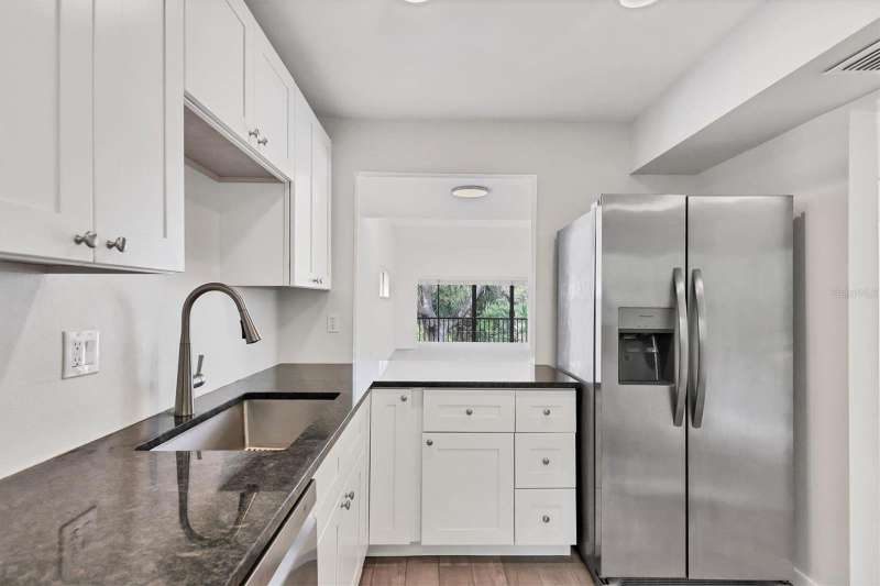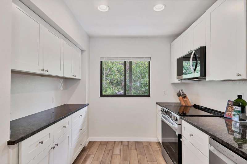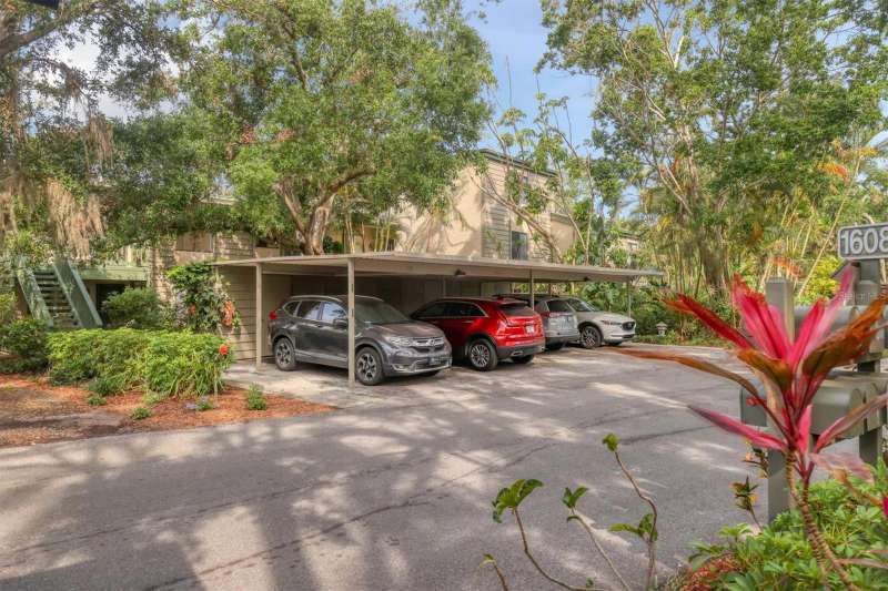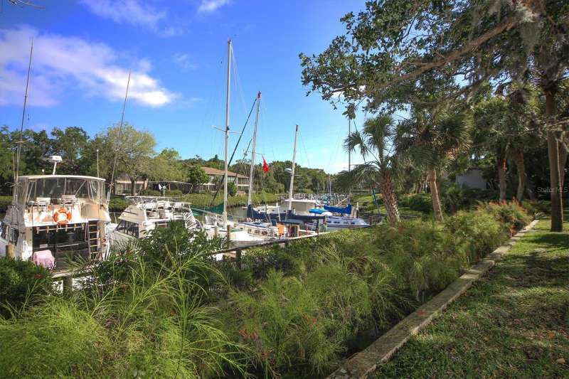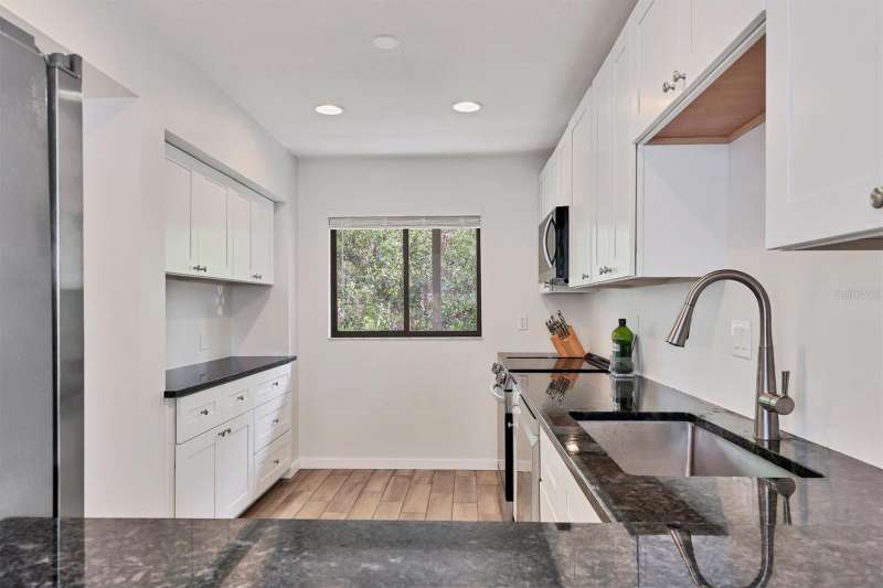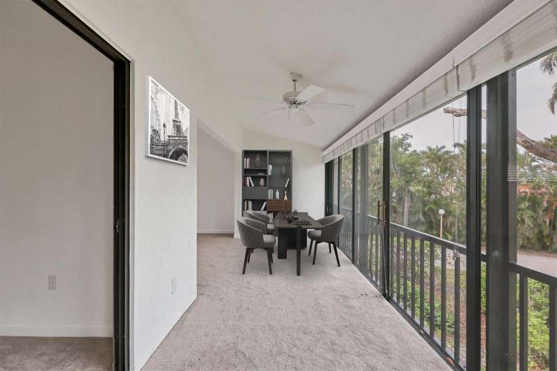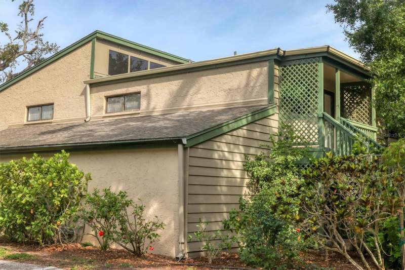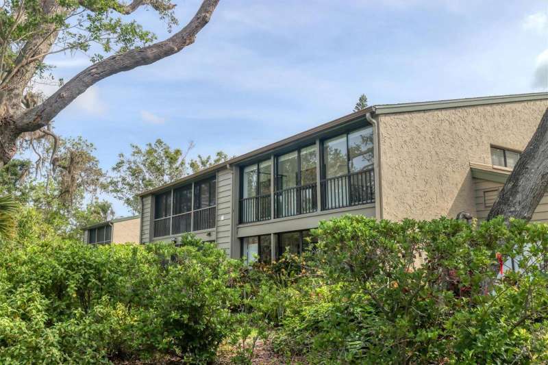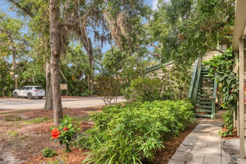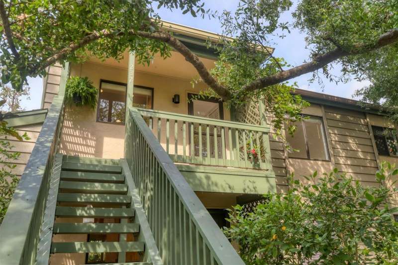 One or more photo(s) has been virtually staged. Beautifully updated in 2025, this second-floor end-unit retreat perfectly combines modern comfort with the unmatched natural beauty of Pelican Cove. Step inside to find new flooring, interior doors, fixtures, and freshly textured and painted walls throughout—including halls and closets. Both bathrooms feature new cabinets and fixtures, while the kitchen boasts new cabinets, countertops, and stainless steel appliances including a range, microwave, dishwasher, and refrigerator. A new Maytag washer and dryer add even more convenience, making this home truly move-in ready. Nestled among grand oaks, this bright and airy home offers a dining room lined with extra windows and topped with transoms, filling the space with natural light. The Florida room spans an impressive 22 feet of sliders, complete with two-inch blinds for privacy when desired. Outside, immerse yourself in 75 acres of lush, mature landscaping where the fragrance of jasmine fills the air and vibrant flowering foliage creates a private bird sanctuary. Your covered carport with attached storage shed adds everyday practicality, while the community invites you to embrace an active, social lifestyle. Swim in one of six pools, learn a new racquet sport, attend classes at “Pelican Cove University,” or sign up for a boat slip while kayakers enjoy free storage. Lovingly passed down through generations and thoughtfully updated for today’s buyer, this home is the perfect blend of modern updates, natural beauty, and resort-style amenities—all that's missing is you!