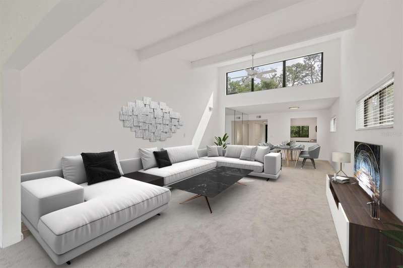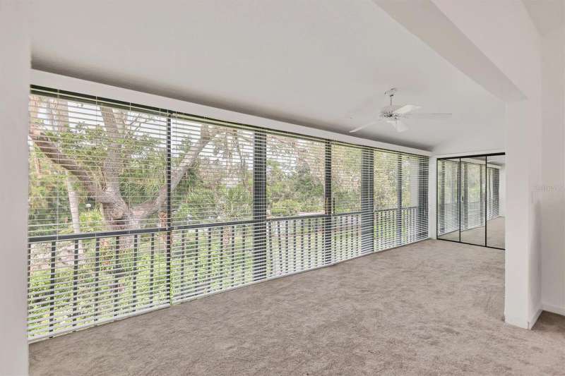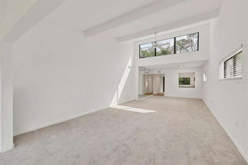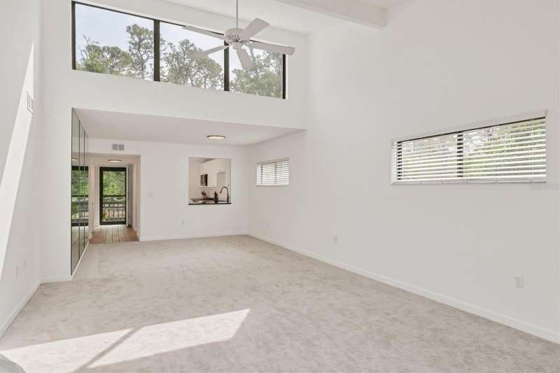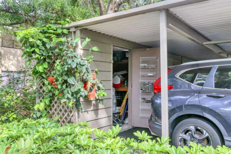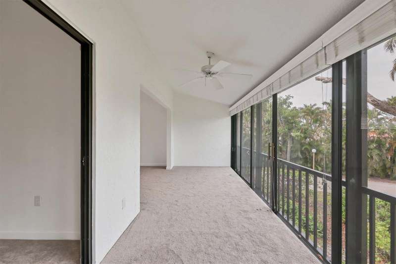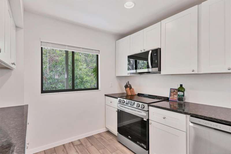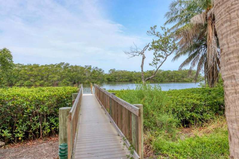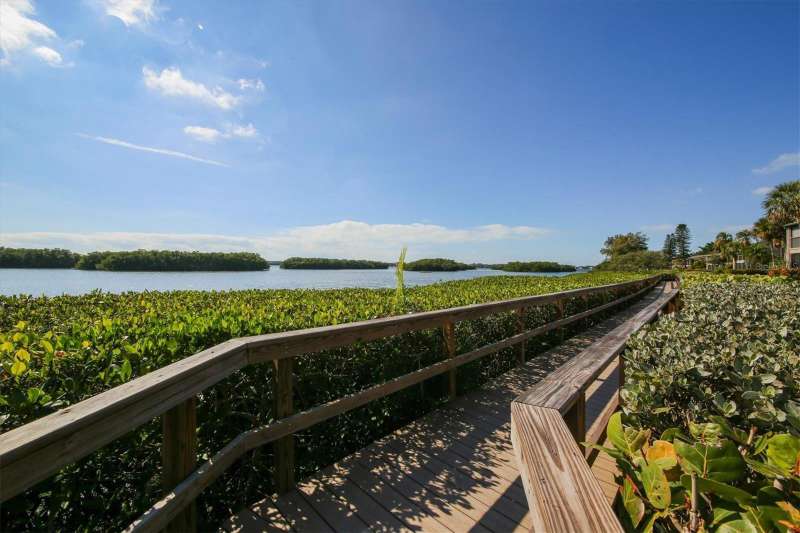 One or more photo(s) has been virtually staged. Beautifully updated in 2025, this second-floor end-unit retreat perfectly combines modern comfort with the unmatched natural beauty of Pelican Cove. Step inside to find new flooring, interior doors, fixtures, and freshly textured and painted walls throughout—including halls and closets. Both bathrooms feature new cabinets and fixtures, while the kitchen boasts new cabinets, countertops, and stainless steel appliances including a range, microwave, dishwasher, and refrigerator. A new Maytag washer and dryer add even more convenience, making this home truly move-in ready. Nestled among grand oaks, this bright and airy home offers a dining room lined with extra windows and topped with transoms, filling the space with natural light. The Florida room spans an impressive 22 feet of sliders, complete with two-inch blinds for privacy when desired. Outside, immerse yourself in 75 acres of lush, mature landscaping where the fragrance of jasmine fills the air and vibrant flowering foliage creates a private bird sanctuary. Your covered carport with attached storage shed adds everyday practicality, while the community invites you to embrace an active, social lifestyle. Swim in one of six pools, learn a new racquet sport, attend classes at “Pelican Cove University,” or sign up for a boat slip while kayakers enjoy free storage. Lovingly passed down through generations and thoughtfully updated for today’s buyer, this home is the perfect blend of modern updates, natural beauty, and resort-style amenities—all that's missing is you!