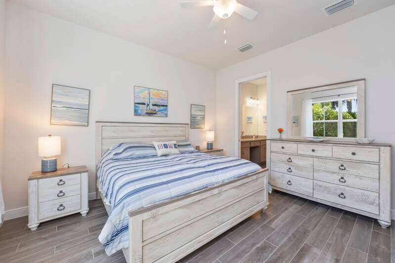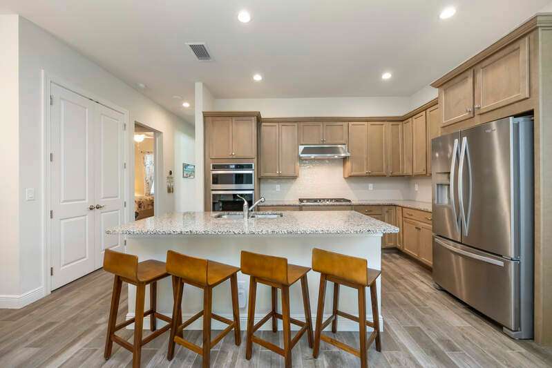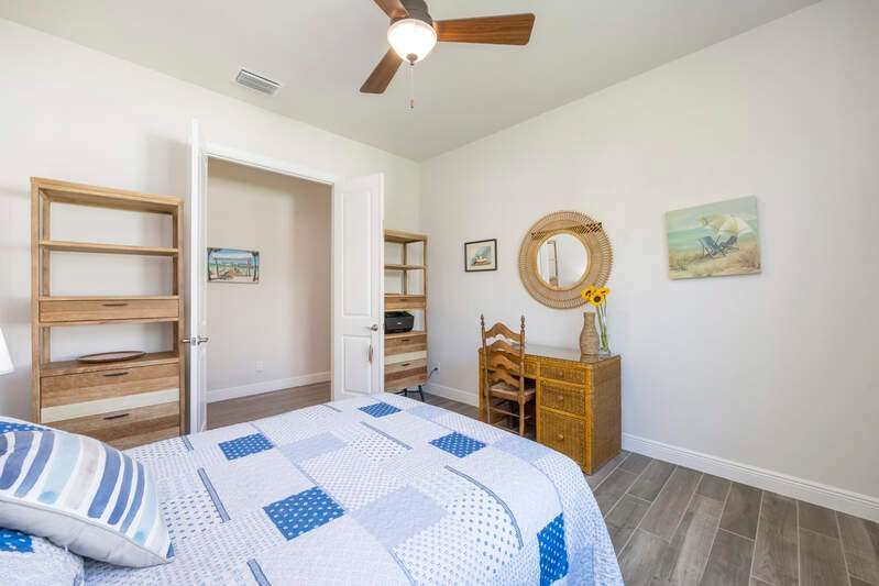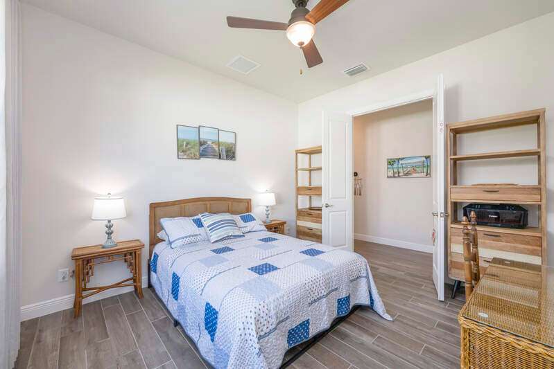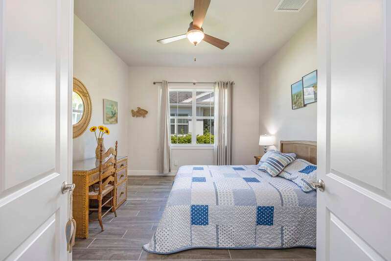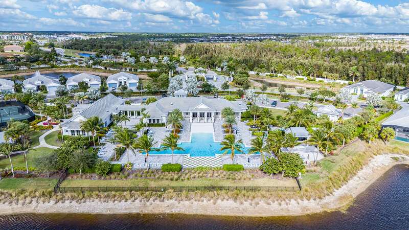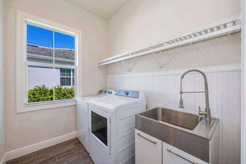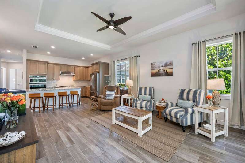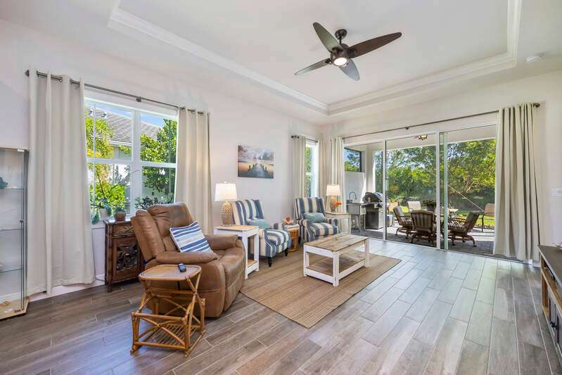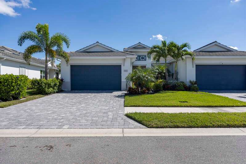 Welcome to 9016 Saint Lucia Drive in Azure at Hacienda Lakes-Naples, Florida, a premier gated community offering coastal-inspired living. This beautifully designed and furnished Baypointe Villa features 1,569 square feet of thoughtfully planned living space with 2 bedrooms, 2 bathrooms, a versatile den (ideal as a home office or optional third bedroom), and a spacious 2-car garage complete with built-in storage racks, cabinets, and a handy workbench for all your projects. Step inside and you'll find 10-foot ceilings, wide wood-look tile flooring throughout, and elegant coffered ceilings in the foyer and great room. The open concept layout showcases a gourmet kitchen with gas cooking, stainless steel appliances, granite countertops, tile backsplash, breakfast bar and pantry. The kitchen flows seamlessly into the dining area and expansive great room-ideal for both everyday living and entertaining. The owner's suite offers a bathroom featuring a dual-sink granite vanity, walk-in shower and spacious walk-in closet. The guest bedroom, located near a full bathroom, provides comfort and privacy for visitors. Additional upgrades include smart home technology, recessed lighting, ceiling fans, upgraded wood shelving in all closets, tankless water heater, hurricane impact front window and door, HVAC UV light for clean air, and a laundry room with tub sink. Outdoor living is equally impressive. Enjoy a private backyard with a covered lanai, extended brick pavers, open-air screen enclosure, outdoor sink and gas hookup for grilling. There's also plenty of room to design your own dream pool. Residents enjoy resort-style amenities including a gated entrance, clubhouse with social activities and game rooms, billiards, cafe, library, heated pool and spa with cabanas, state-of-the-art fitness center, tennis and pickleball courts, firepit and a BBQ/picnic area. Located just minutes from downtown Naples' 5th Avenue, Gulf Coast beaches, Marco Island, the Naples Botanical Garden, the Naples Zoo, top-rated shopping, exceptional dining and medical facilities, this home offers the perfect balance of convenience and luxury. Don't miss the opportunity to make this villa yours. Schedule a private showing today and experience the vacation lifestyle at Azure at Hacienda Lakes.