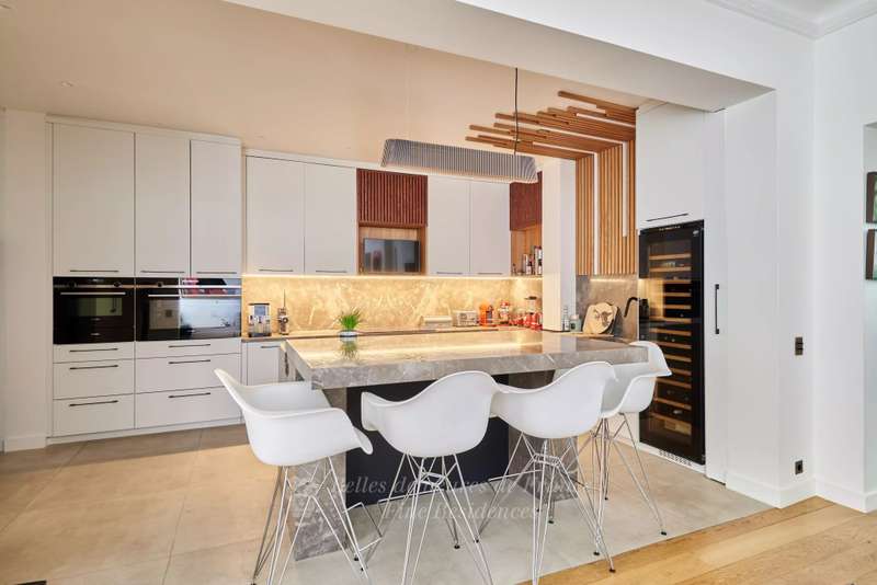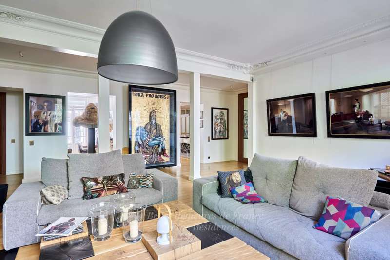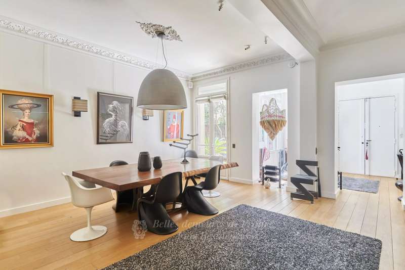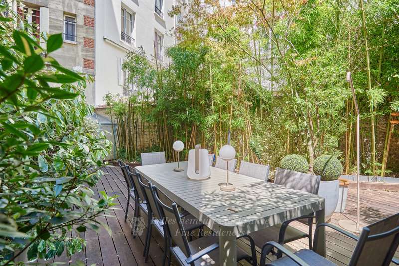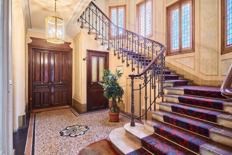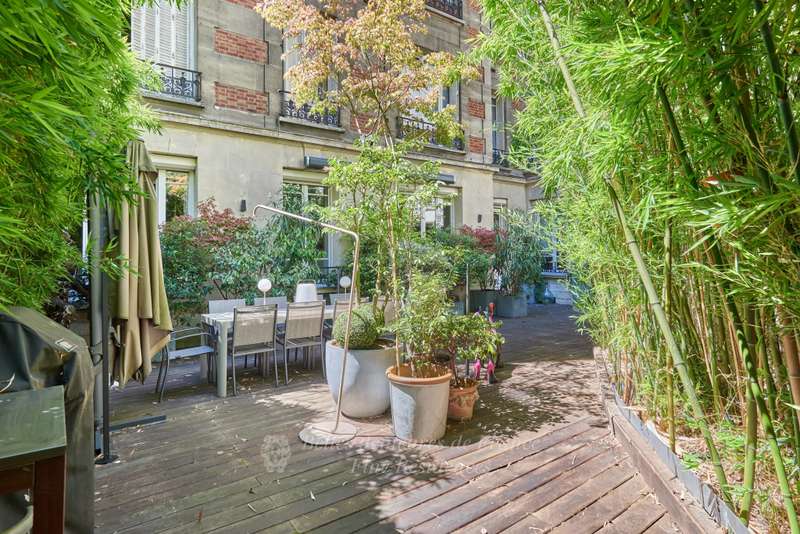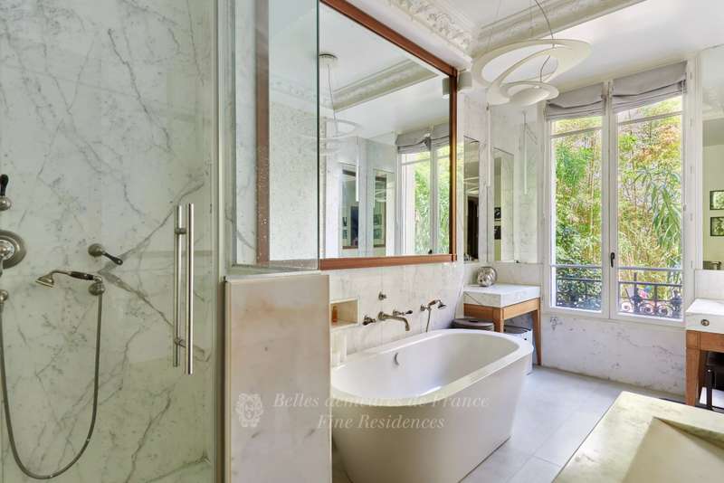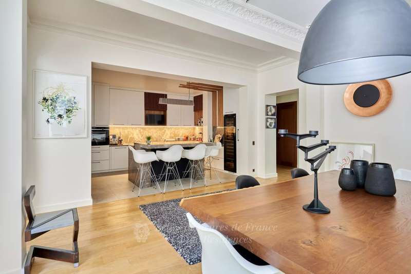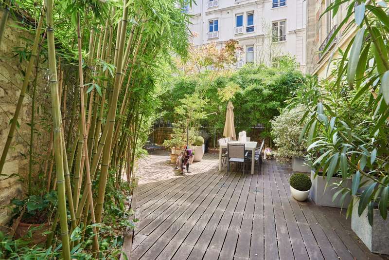 Avenue Wagram. This sumptuous garden-level apartment with the feel of a private house benefits from two leafy 88 and 57 sqm terraces. Entirely renovated and beautifully appointed, it offers 212 sqm of living space as defined by the Carrez Law including a spacious living/reception room bathed in sunshine, a marble-tiled kitchen with a central island, a dining room, a master suite with a bathroom, a shower room, a steam shower, a dressing room and a separate wc, three further bedrooms (two accessing a terrace), two shower rooms one with a wc, and a separate wc. Dual-aspect and featuring 3.30 metre high ceilings. With a cellar and a ventilated wine cellar.