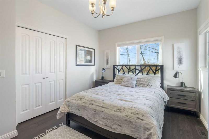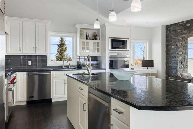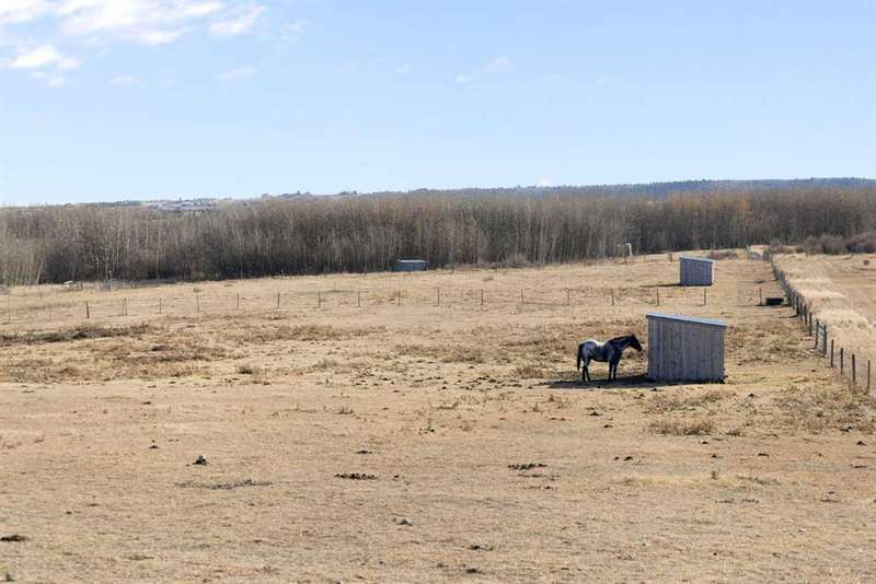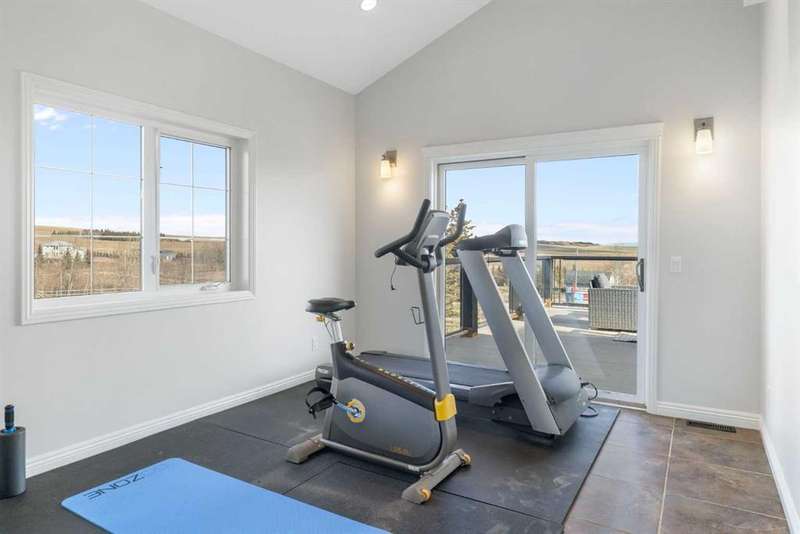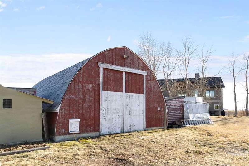 A lifestyle most only dream of! Historic Rocky Mountain views - just 8 minutes to Cochrane! Gorgeous custom-designed two-storey home featuring 4 bedrooms and 3.5 baths, with over 4900 sqft of developed living, AND 1,200 sq.ft. of wraparound decking on two levels. The main floor offers a smart, functional layout with three spacious bedrooms, including a massive primary retreat complete with a huge walk-in closet and luxurious 4-piece ensuite. Two additional bedrooms share another 4-piece bathroom with convenient main-floor laundry. Upstairs, the panoramic mountain views steal the show. The open-concept living space features 20-ft beamed ceilings, a cozy fireplace with built-in bench seating, and direct access to the south-facing deck. The chef-inspired kitchen showcases a full-size Sub-Zero fridge and freezer, granite island with seating, pot-filler over a Wolf six-burner gas range, walk-in pantry, and thoughtful design for everyday family life or large gatherings. The dining area, surrounded by three walls of windows, opens through French doors to another expansive deck — perfect for entertaining or soaking up the scenery. The walkout lower level expands your living options with a spacious one-bedroom suite (approx. 1,450 sq.ft.) featuring an open kitchen, dining, and living area, plus a media room/office, 3-piece bath, and laundry. A private entry makes it ideal for extended family, a caregiver, and successful short/long-term rental income. An interior locking door provides flexibility and security. Lots of options here. The oversized two-storey heated garage with attached carport ensures ample parking and storage. Outdoors, this fully fenced property includes manual entry gates, a quonset, and a charming barn with box and standing stalls, tack room, and loft (no power). Multiple paddocks, pastures with auto-waterers, two horse shelters, and a fenced dog run complete the setup. Enjoy peaceful rural living just minutes from Cochrane — with school bus service, shopping, and entertainment nearby. A short drive takes you to the Rockies and Alberta’s best outdoor playground. Book your private viewing today — this property truly needs to be experienced in person.