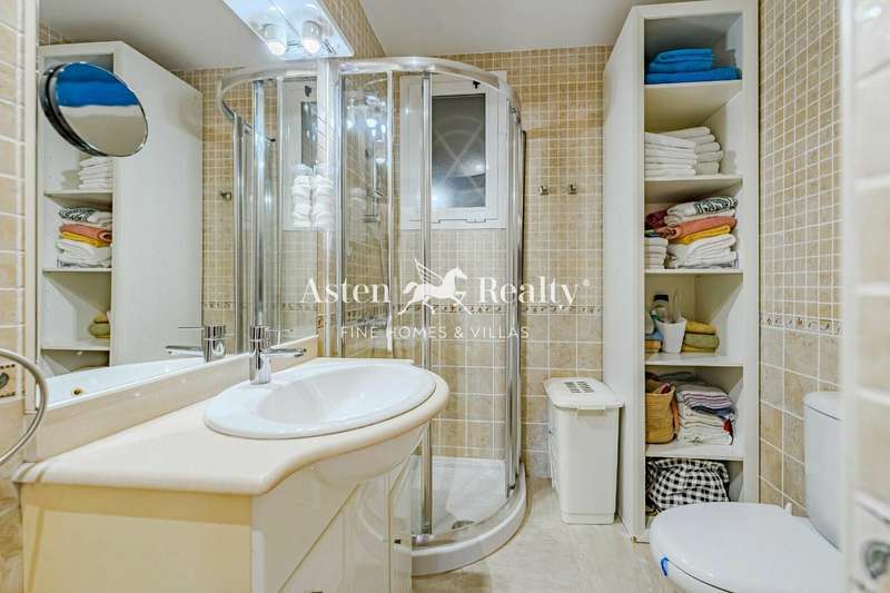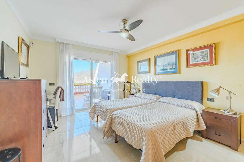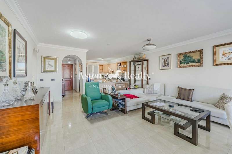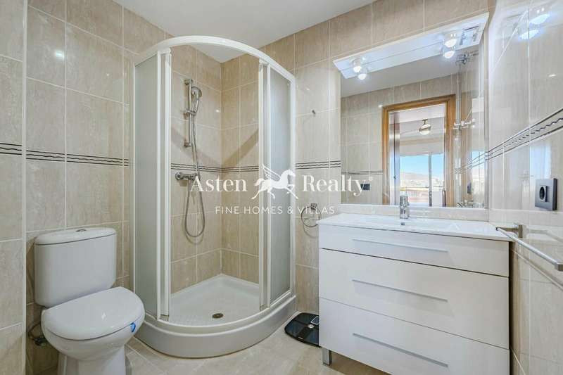The property consists of spacious living-dining room with open kitchen and direct access to the terrace of 40 m2 with stunning sea and mountain views, 2 bedrooms and 2 bathrooms, one of them en suite. Both bedrooms have fitted wardrobes. The property has direct entrance from the street and easy access to the heated swimming pool with solarium inside the complex. The garage for 1 car is included in the price. The building has 2 lifts.