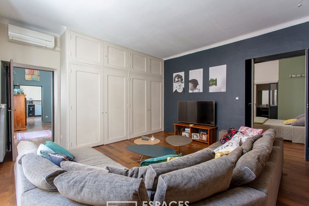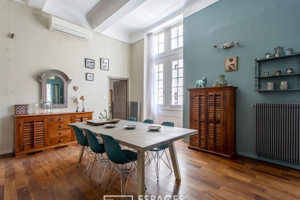 On the first floor of a building listed as a heritage site in the city of Nimes, you will be charmed by its beautiful high ceilings and its south-facing street-side exposure for the living rooms of over 55m2. The apartment consists of a spacious living room, a dining room, a separate kitchen, and two bedrooms of 18 and 19m2.