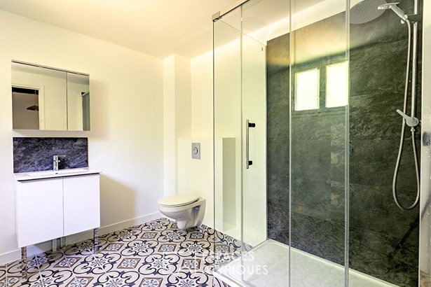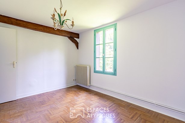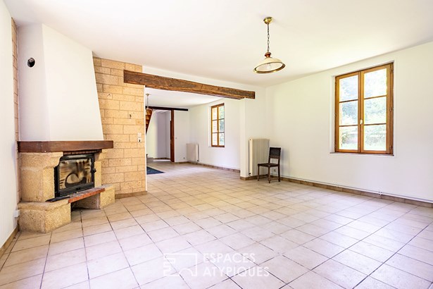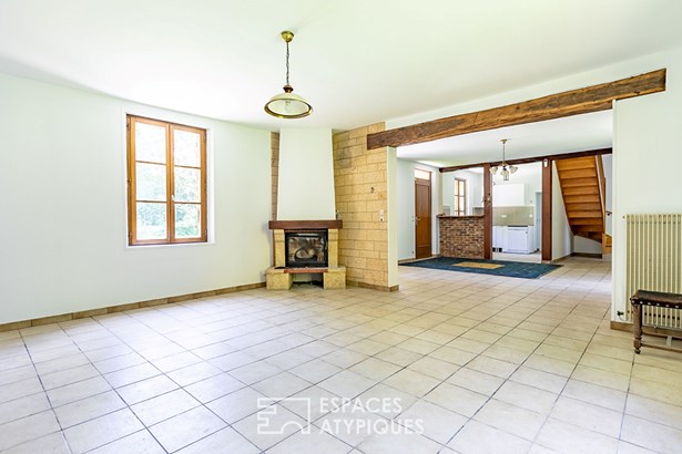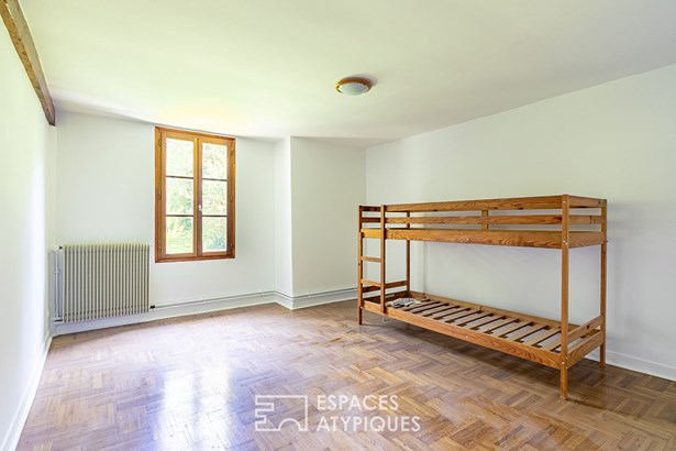 With a living area of 196sqm, the entrance opens onto the living space heated by its fireplace/insert and the kitchen. Upstairs, the corridor leads to four bedrooms, a bathroom and a large framed living room which serves as a living room - library - games room or bedroom with a mezzanine which also leads to the attic.