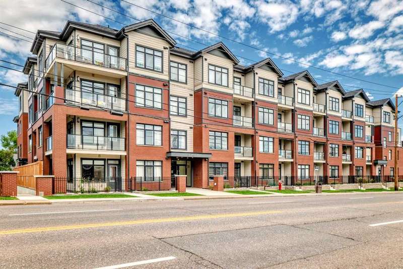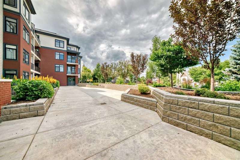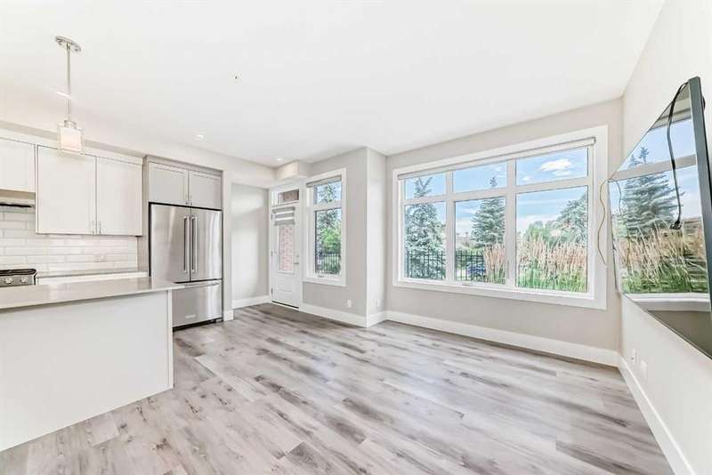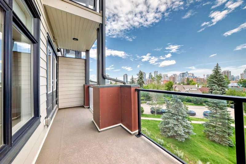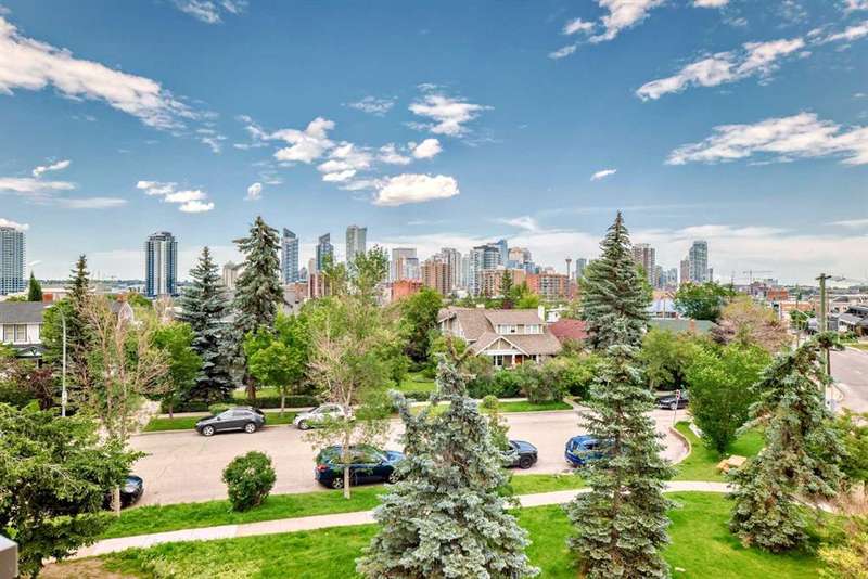 Amazing value Lovely corner 3 level townhouse-style unit with beautiful view of downtown in desirable Scarboro. Walking distance to trendy 17 Ave with many restaurants, cafe, shops and parks. A short drive to the downtown core and easy access to 14th Street, Crowchild Trail, Bow and Sarcee Trails which can take you to the new Stoney Trail Ring road bringing you to anywhere in the city. This unit has 9 ft. ceilings on all 3 levels, A/C and with plenty windows bringing in lots of natural light. The oversized balcony is a perfect place to enjoy your morning coffee, watch the sunrise and fireworks. With the 3 good size bedrooms, 2 dens plus 2 and half bathrooms it's perfect for family living. This unit has underground titled parking, a storage unit and 2 entrances. One entrance is from within the building and one is off street facing a park which is convenient for leaving and coming home from a walk.