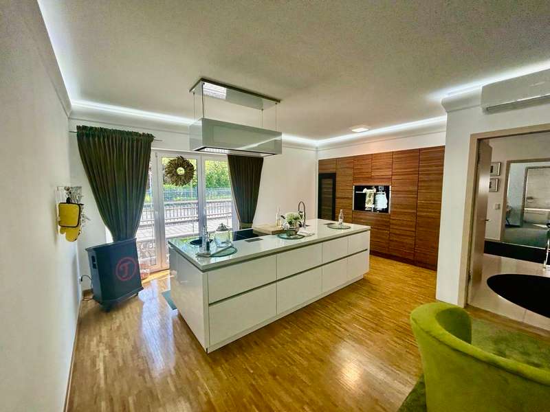 A first floor apartment is for sale, which is characterized by modern construction and high-quality furnishings. Completed in 2019, the apartment is in as-new condition and offers a spacious living area of approx. 220 m². This property combines a well thought-out room layout with luxurious furnishings and sets standards in terms of living comfort. The apartment has a total of two rooms, including a well-proportioned bedroom with a dressing room and an elegant bathroom. The highlight of the living space is the spacious living and dining area, which offers an open-plan concept and thus leaves plenty of room for individual design options. Large window fronts provide excellent natural lighting and create an inviting atmosphere. A modern kitchen opens up harmoniously to the living area and is equipped with the latest appliances. It is ideal for cooking enthusiasts who value style and functionality. The kitchen equipment enables efficient working and contributes to a pleasant living environment. The stylish bathroom, which is equipped with an integrated sauna and thus creates a private oasis of well-being, deserves special mention. The finest materials and modern sanitary facilities promise maximum comfort. The underfloor heating in particular, which extends through the entire apartment, ensures cozy warmth and a pleasant indoor climate even in the colder months. Furthermore, the first floor apartment in the basement offers an additional basement unit with two further rooms, which are ideal as guest rooms, offices or private retreats. Here, too, there is a full, tastefully designed bathroom, which further underlines the flexibility of the property. The outdoor area of this apartment impresses with its generosity and variety of uses. An approx. 45 m² terrace invites you to extend the living space outside. The adjoining garden rounds off the offer and provides ample space for individual design wishes, whether as a lovingly landscaped green area, a play area for children or a personal retreat surrounded by greenery. An associated parking space completes the overall package and ensures convenient and uncomplicated parking. This property is aimed at prospective buyers who value quality, room comfort and as-new fittings. Take the opportunity to arrange a viewing to see the benefits of this first floor apartment for yourself. Here you can expect a property that impresses with both its technical and design features and guarantees a modern living experience. Arrange a viewing appointment now and see the special quality and exceptional living comfort of this property for yourself.