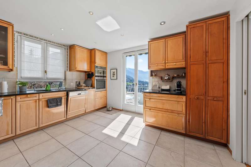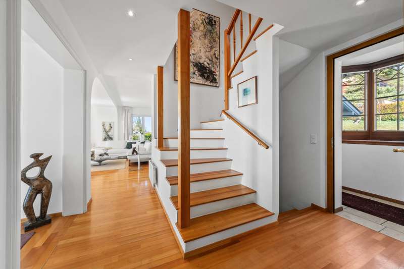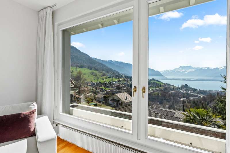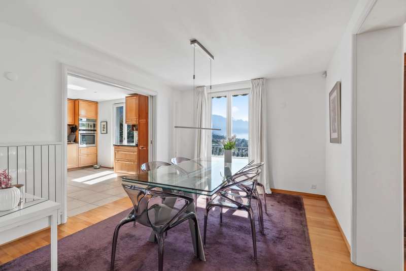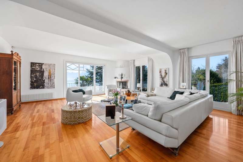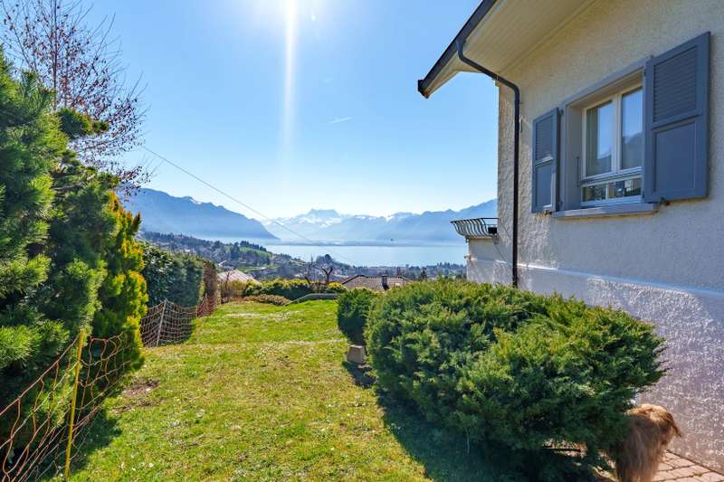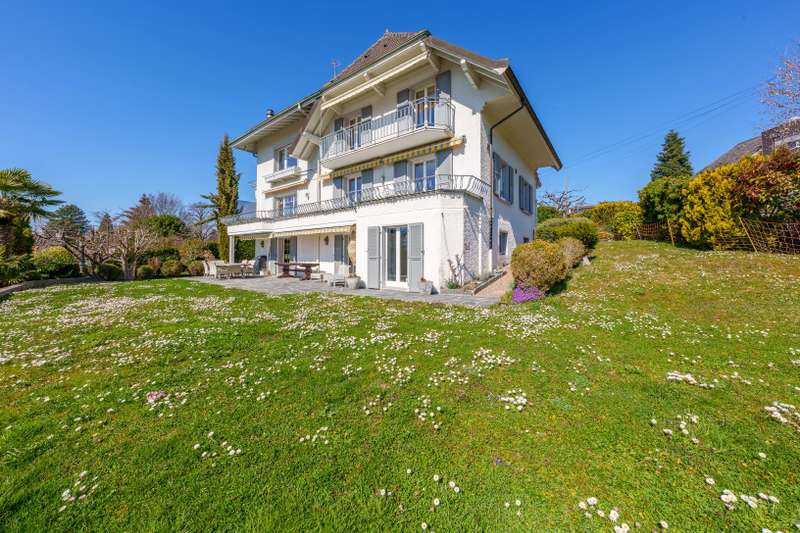 Located in a peaceful and green residential area, just a few steps from the heart of the village, this stunning 1930s property will captivate you with its exceptional panoramic view of the lake and mountains. Set on a beautifully landscaped plot of 1,578 m², fully enclosed, it offers privacy and tranquility. Regularly maintained and renovated over the years, the house features spacious rooms, fine finishes, and high-end materials. On the upper floor, you'll find a bright living room with a fireplace, a dining room, and a fully equipped kitchen. All these spaces open onto a large balcony, perfect for enjoying the breathtaking view of the Lake Geneva Basin. A small lounge and a guest WC complete this level. On the second floor, the spacious master suite includes two walk-in closets, a bathroom with a bathtub and shower, and a private balcony. Two additional bedrooms, sharing a balcony with an exceptional view of the lake, are also located here, along with a shared bathroom. The lower level features a wine cellar, a carnotzet with kitchen, and direct access to the terrace and garden, ideal for summer evenings. Two additional bedrooms, a shower room, a laundry room, and a BA shelter complete this floor, offering a perfect space for entertaining guests. The main building, originally built in the 1930s, was extended in 1980, forming this magnificent property.