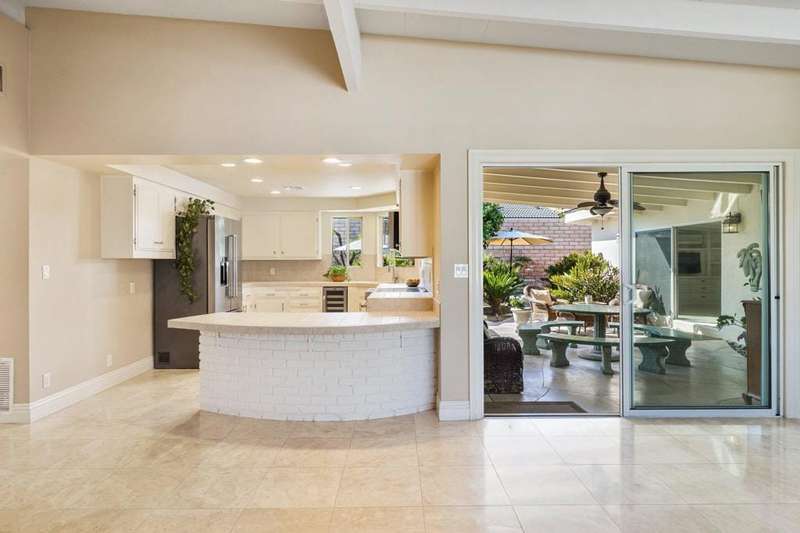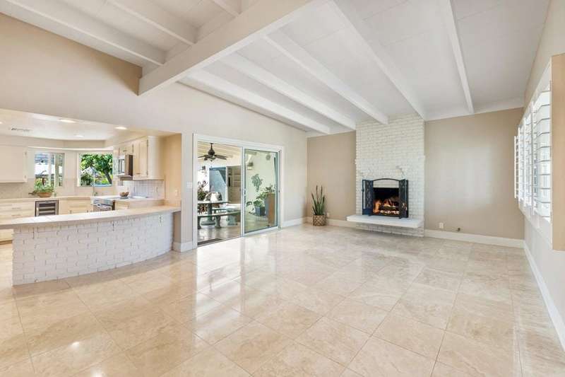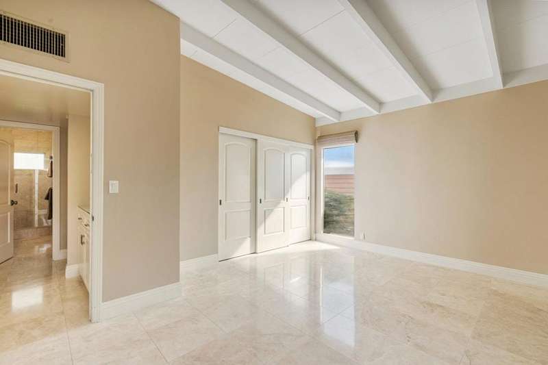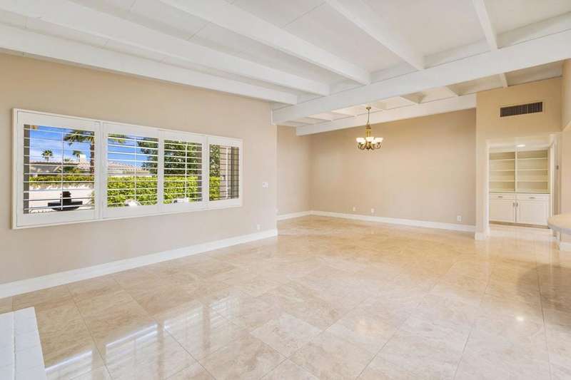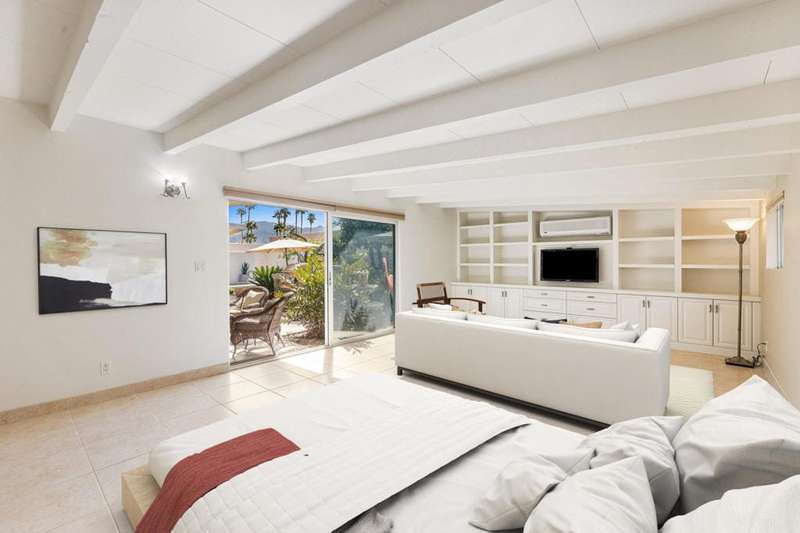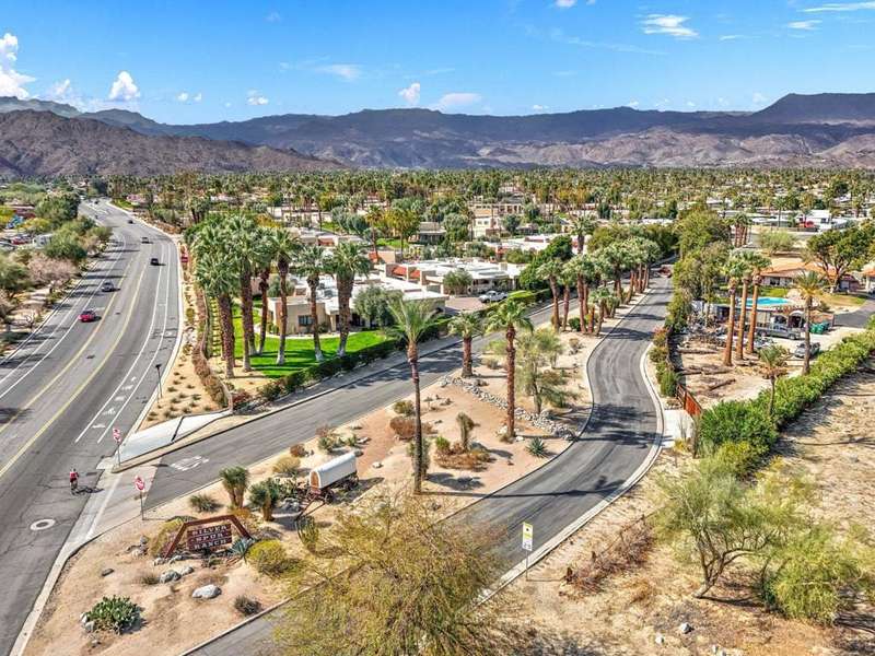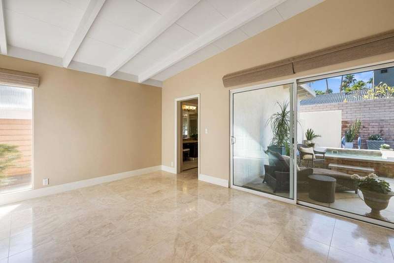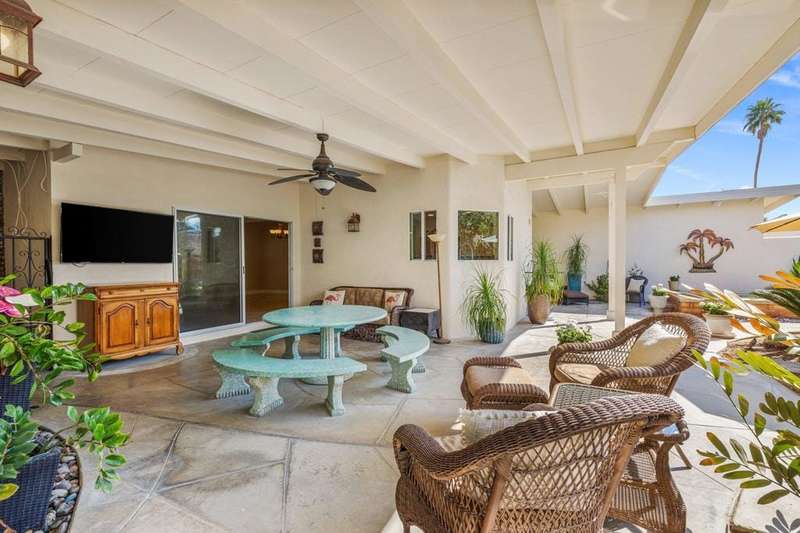 Nestled in south Palm Desert's premier, historic Silver spur neighborhood, this ultra-private mid-century retreat features timeless architecture and character, even boasting a massive casita. Enter through the gated courtyard to the main residence, offering 2 generously sized bedrooms, 2 updated baths, and an open, inviting floor plan. Beautiful wood-beamed ceilings and travertine flooring run throughout, creating warmth and cohesion. The casita mirrors the home's roofline and finishes with a built-in entertainment center, walk-in closet, and updated bath. It's an ideal space for guests, extended family, or a private work studio. Designed for effortless indoor-outdoor living, the lush backyard features a large covered patio for entertaining, a built-in barbeque, and a relaxing spa. Chase the sun, soak in dramatic mountain views, and enjoy the quiet serenity that defines this neighborhood. Lovingly maintained and truly move-in ready, this home sits just five doors from Ironwood Park, walking distance to The Living Desert, and moments from El Paseo's world-class dining, shopping, and galleries.