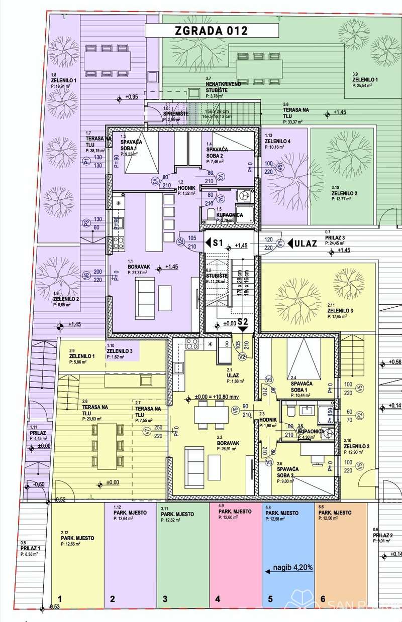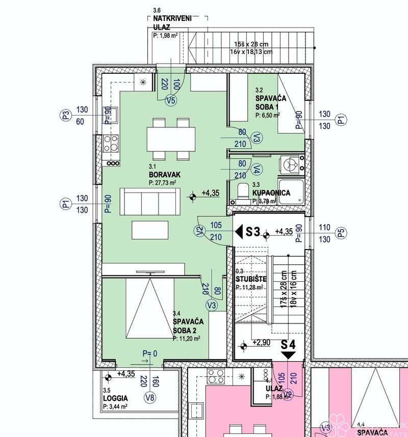 Apartment S3 - 1st Floor - Living area 49.22 m2 (2 bedrooms + bathroom) + loggia (3.44 m2) + ground floor yard and terrace with outdoor pool 3x7m (72.67 m2) + outdoor parking space PM3, total net area 66.08 m2 = €285,000 (price including VAT)